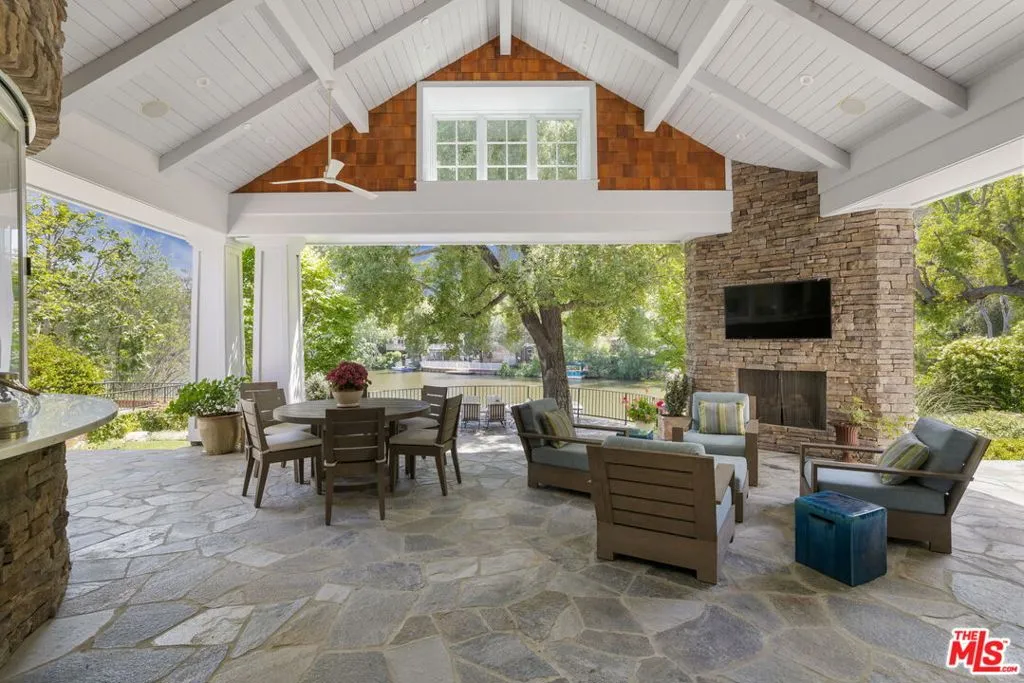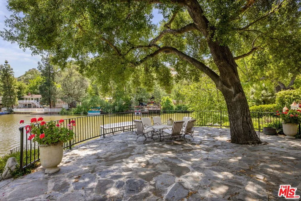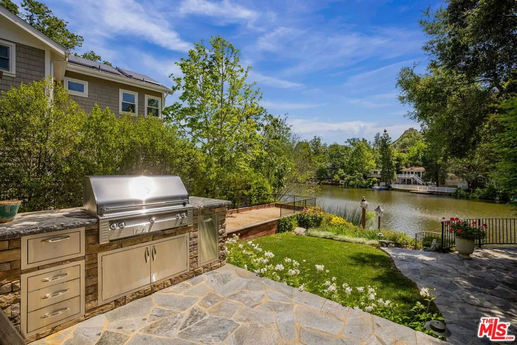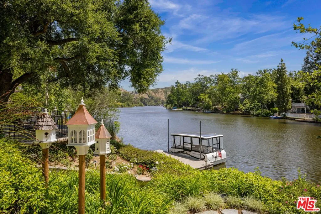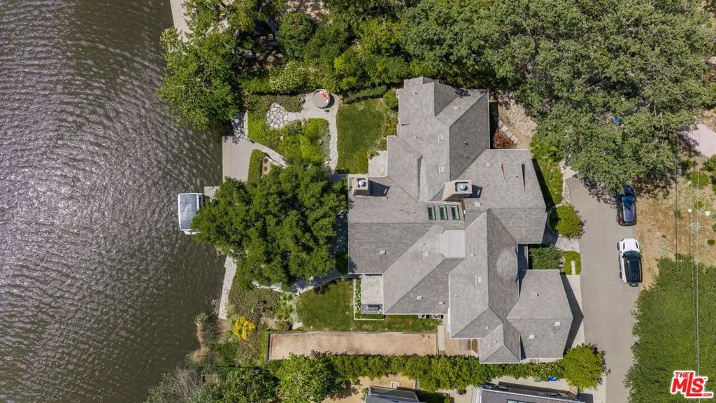 Experience lakeside living at its finest on Private Malibou Lake, within the exclusive Malibou Lake Mountain Club. Tucked behind gates on a private street shared by just five homes, this rare property is one of only 35 residences set directly on the lake. Custom-built and owner-occupied since 2013, the home offers a thoughtfully designed floor plan featuring a spacious downstairs primary suite with a luxurious bathroom and ample closet space. Two additional en-suite bedrooms, along with a den/office and a gym, provide flexibility for both living and working. Step through the front door into a stunning great room with soaring beamed ceilings, rich wood floors, and a floor-to-ceiling wood-burning fireplace. The space flows seamlessly into a gourmet kitchen, dining area, and wraparound bar perfect for entertaining. Expansive doors open to a large 467 sq. ft. covered loggia, complete with vaulted ceilings and a second wood-burning fireplace, creating an inviting indoor-outdoor living experience ideal for year-round dining or relaxing by the lake. Outside, enjoy a built-in BBQ, bocce ball court, and multiple sun-drenched seating areas overlooking the water. Just steps away, your private dock offers direct access to the lake perfect for boating, fishing, or simply unwinding in a serene setting. Whether you're seeking a full-time residence or a weekend escape just 50 minutes from Century City or Beverly Hills, this exceptional property offers the best of both worlds and may very well be the finest home on the lake. Please allow a minimum of 24 hours' notice for showings.