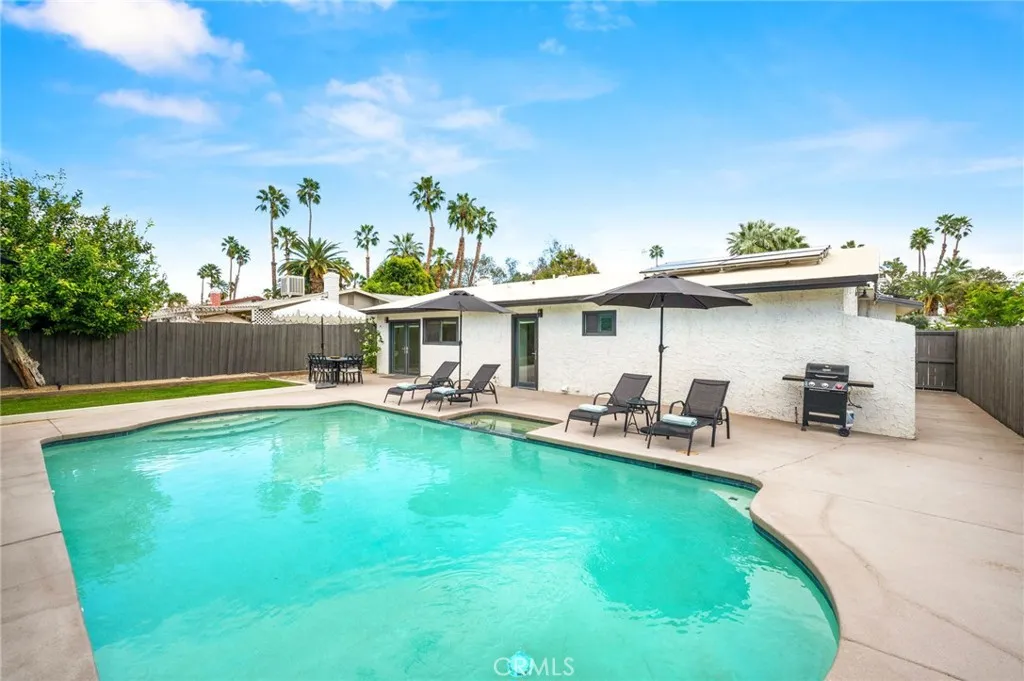 This thoughtfully curated 2-bedroom, 2-bath residence is ideally situated within one of Palm Desert’s most desirable central neighborhoods, offering a sophisticated blend of mid-century character and contemporary design. Recently reimagined, the open-concept floor plan showcases elevated finishes throughout, including quartz surfaces, clean architectural lines, and carefully integrated designer details. A statement 1960s hand-carved entry door—sourced from another iconic Palm Desert mid-century home—introduces the property’s distinctive architectural heritage. Inside, light-filled living spaces flow effortlessly, creating an atmosphere that feels both refined and relaxed. The primary suite serves as a private retreat, complete with an oversized walk-in closet and a spa-inspired bath designed with understated luxury in mind. The home is offered beautifully furnished with curated pieces from Restoration Hardware, delivering a cohesive, turnkey aesthetic. Outdoors, the experience becomes truly resort-like. A sparkling pool and spa anchor the backyard, framed by newly completed hardscape and landscape enhancements (2025). The pool system is fully app-controlled, allowing effortless management of temperature, lighting, and spa settings from anywhere. With no rear neighbor and direct bordering to the prestigious Toscana Country Club, the setting offers rare privacy and unobstructed mountain views. Enhancing both sustainability and long-term value, the home is equipped with a full solar panel system, delivering energy efficiency and meaningful utility savings. The roof was recoated in 2025, further providing peace of mind. Additional features include a two-car garage with a separate storage room. Located just minutes from El Paseo, the Indian Wells Tennis Garden, La Quinta, and world-class golf, this turnkey residence presents a rare opportunity as a primary home, luxury desert retreat, or fully furnished investment property.