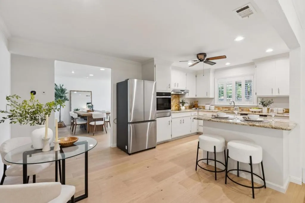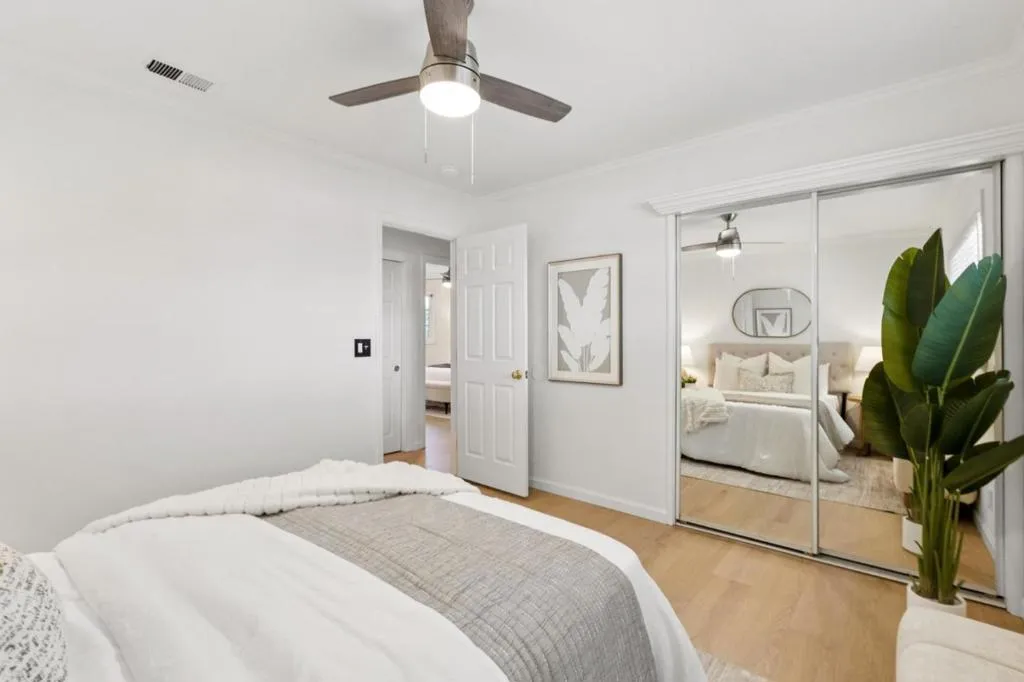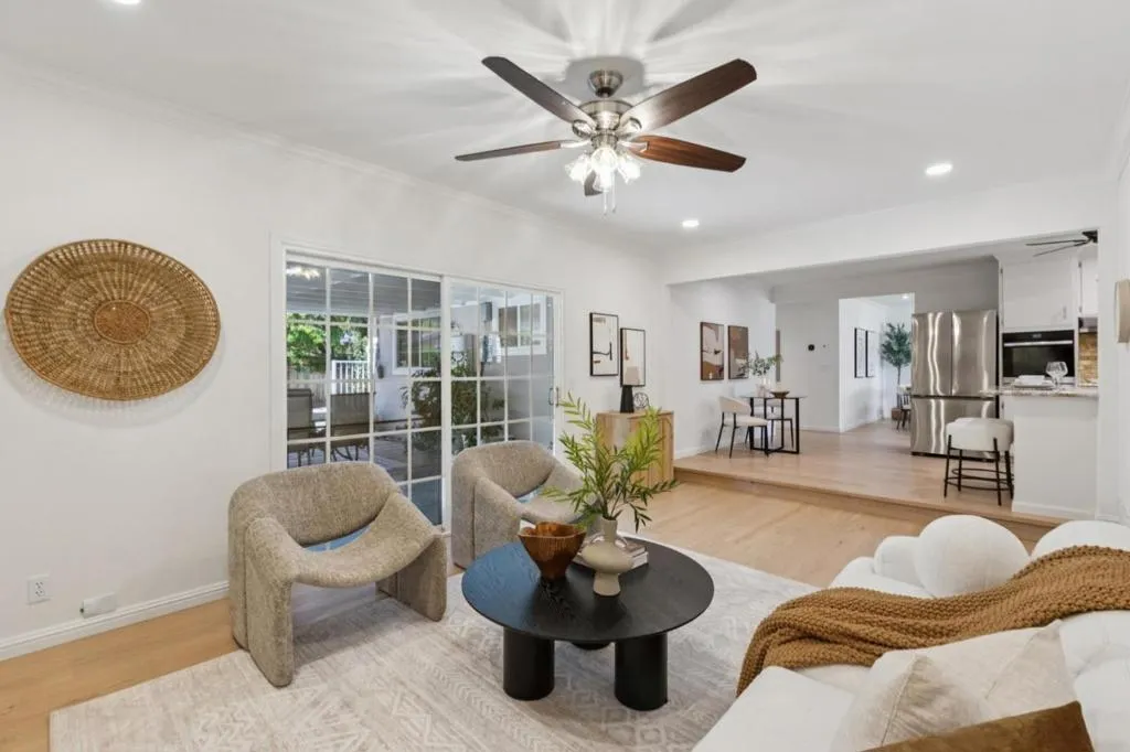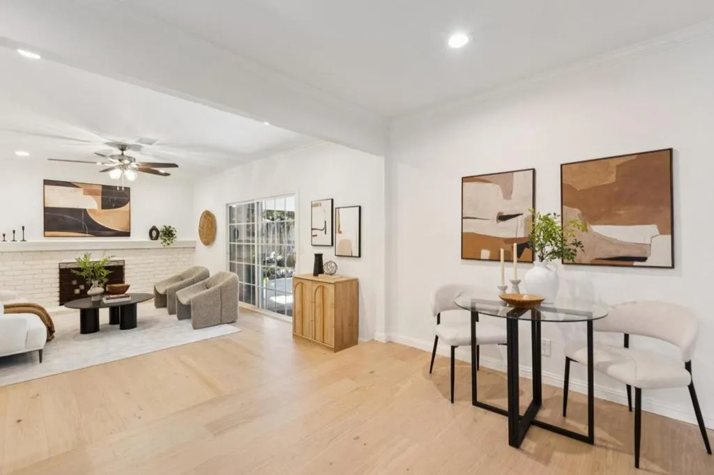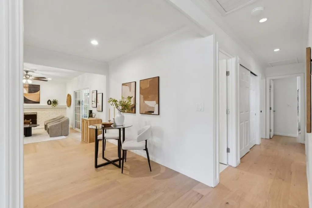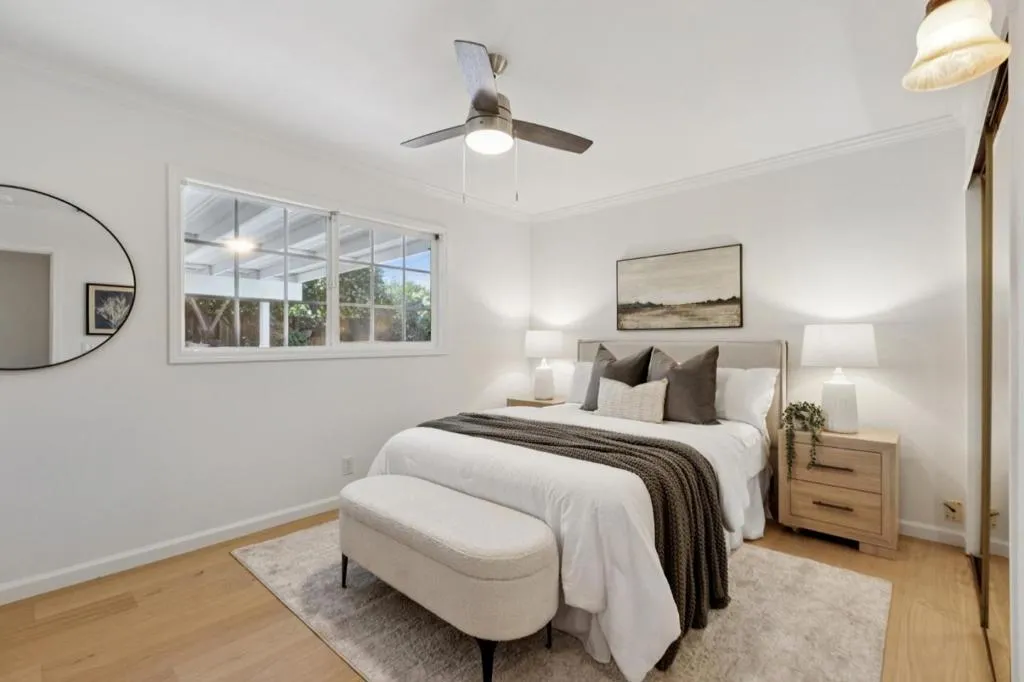Set on a spacious corner lot in Almaden Valley, this inviting single-story home showcases beautiful curb appeal with vibrant roses, a lush green lawn, and mature landscaping. Inside, a bright, freshly painted interior is complemented by new engineered hardwood flooring and a comfortable yet functional layout. The living room is filled with natural light and overlooks the front grounds, while the dining area connects easily for everyday meals and gatherings. The kitchen features granite countertops, stainless steel appliances, and an island with breakfast bar seating, plus a bright breakfast nook. The family room is anchored by a brick surround wood-burning fireplace, with sliding glass doors opening to the backyard. Three bedrooms include a primary suite with backyard views. Bathrooms have been recently updated with beautiful tiled shower and flooring. Outdoor space shines with a covered patio, sparkling pool with diving board, and a large side yard with fresh landscaping. Additional highlights include an attached two-car garage and owned solar. Conveniently located near Costco, Trader Joes, Whole Foods, Oakridge Mall, Highway 85, and nearby schools, with parks and trails just moments away.