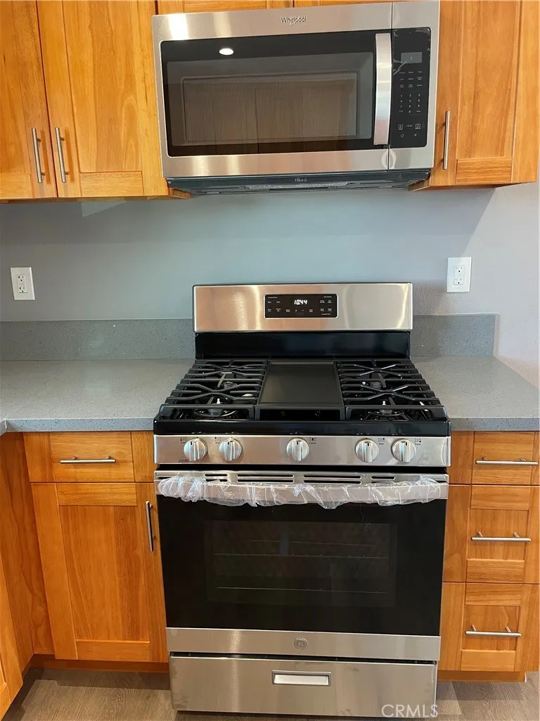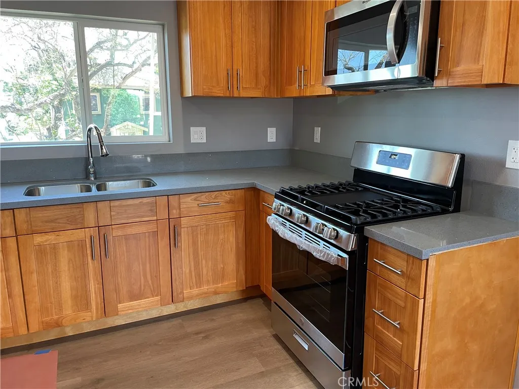 Newly constructed 2 Bedroom unit downstairs (2024). Two bedroom, 1 bath, quartz counter tops adorn new kitchen cabinets. Laminate floors throughout! Off street parking provided. A/C (mini-split unit) in the living room. Open floor plan (kitchen/living room). Recessed lighting throughout. Individually metered - electric, gas, water. Solar panels... Newer gas stove, new range/microwave.