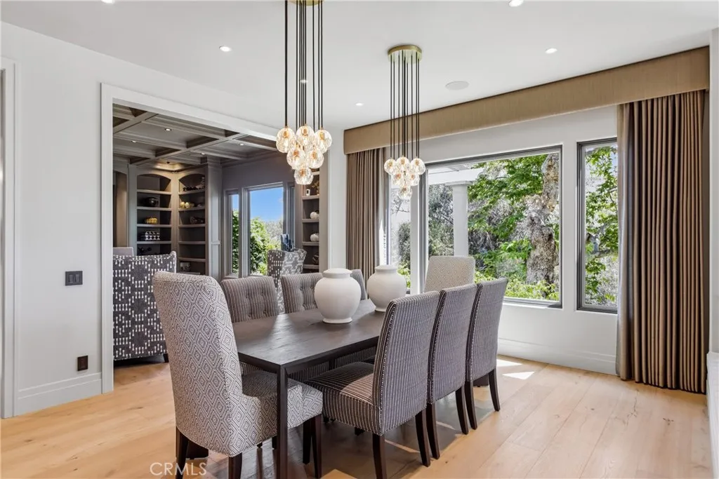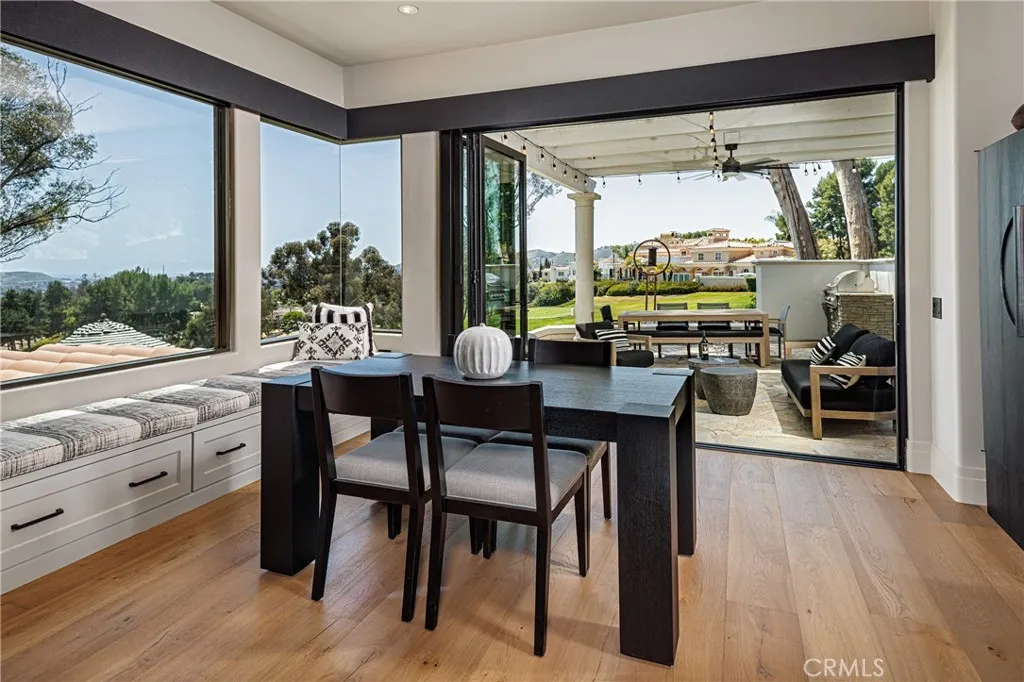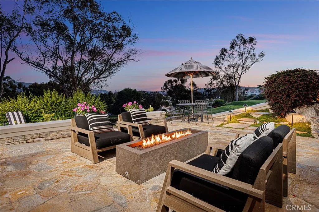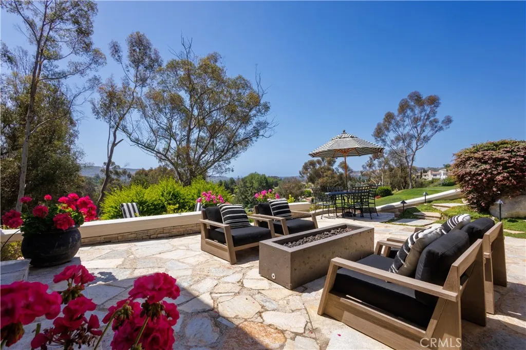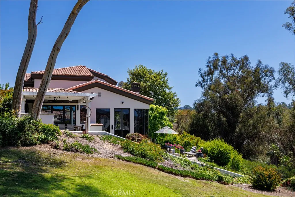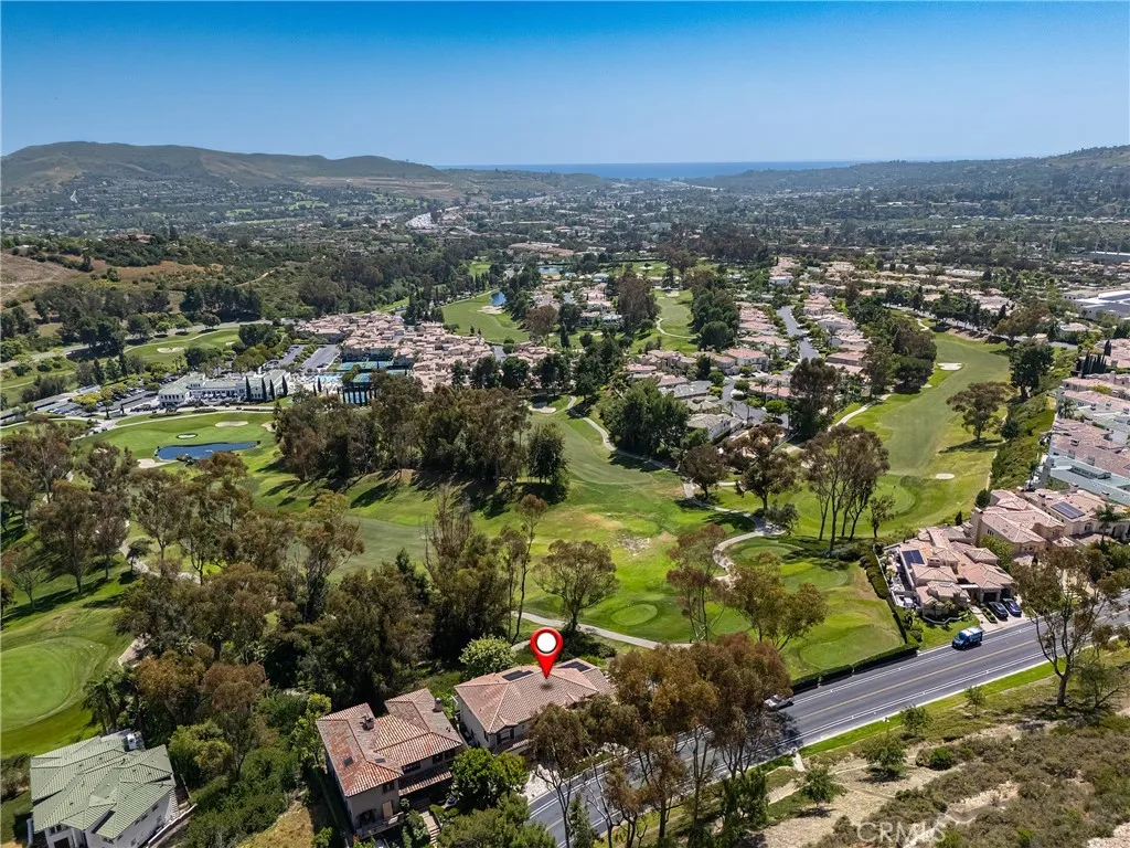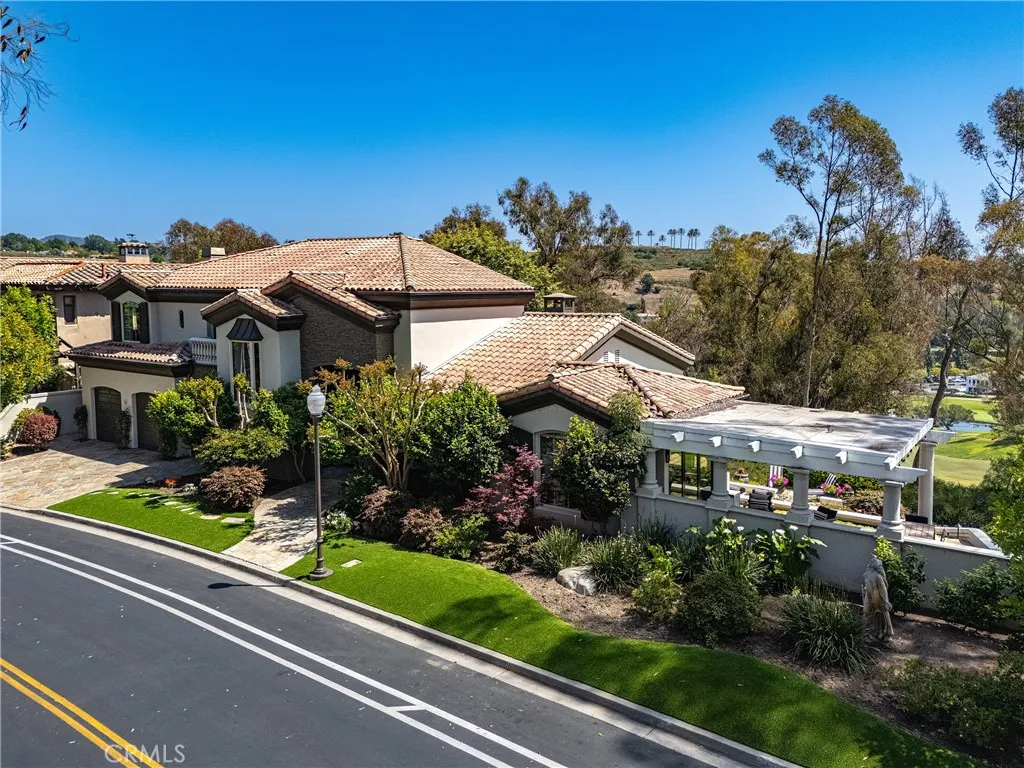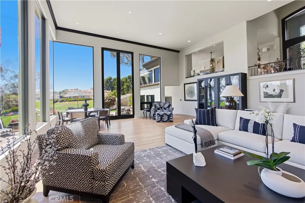This exceptional residence is nestled behind the 24 hour guard gated community of Marbella Country Club, offering a rare combination of privacy, luxury, and breathtaking views. Positioned on a premium elevated lot, the home overlooks the 9 th and 18 th tee boxes of the golf course, with a glimpse of the ocean completing the picturesque backdrop. Surrounded by serene natural beauty, the property enjoys an incredibly private setting no neighbors to the right or rear, and an open hillside space in front-creating a peaceful retreat unlike any other. At the heart of the home is an impressive 1,000 square foot great room, where soaring 15’ ceilings and expansive 12’ windows frame the stunning views. Designed for both grand entertaining and everyday living, this space seamlessly connects indoor and outdoor environments through adjoining patios, allowing you to fully embrace the surrounding landscape. Thoughtfully remodeled just three years ago, the homes open-concept has been elevated with carefully curated upgrades. The great room now features a warm, inviting bar, a statement fireplace and designer lighting that enhances both ambiance and style. The chef’s kitchen is a true showpiece, outfitted with premium Sub-Zero and Wolf appliances, custom cabinetry, and high-end lighting. Natural stone and Artistic Tile finishes elevate the island, countertops, and backsplash. A La Cantina bi-fold door with a Phantom screen create effortless indoor-outdoor flow, opening the kitchen to a covered patio, perfect for entertaining or relaxing in the coastal breeze. All bathrooms have been beautifully renovated with designer plumbing and lighting fixtures, custom cabinetry and elegant stone and tile finishes. The primary suite offers a spa inspired bathroom complete with a luxurious wet room featuring a soaking tub and walk-in shower. Additional features include new hardwood flooring throughout, updated window treatments, dual HVAC systems, a roof mounted solar system, and an EV charging outlet in the three car garage. The property also offers generous storage and low-maintenance landscaping in both the front and rear yards. This is a rare opportunity to own a truly private, view rich home in one of the area’s most prestigious country club communities.