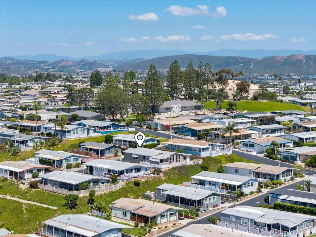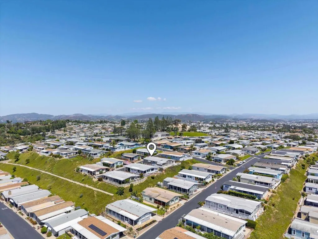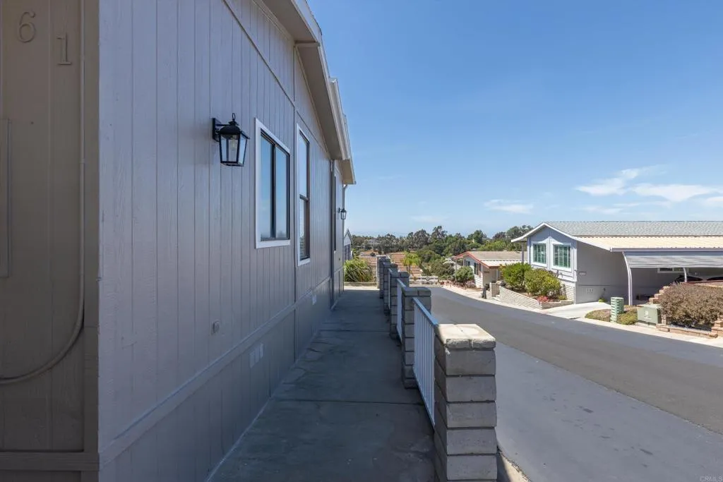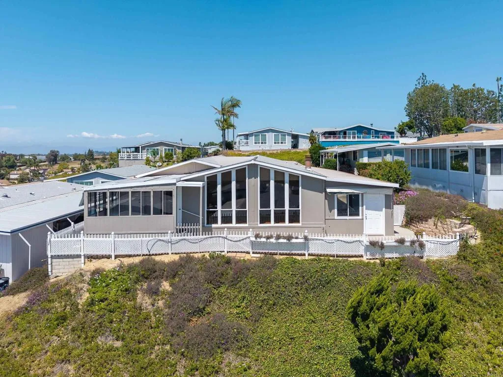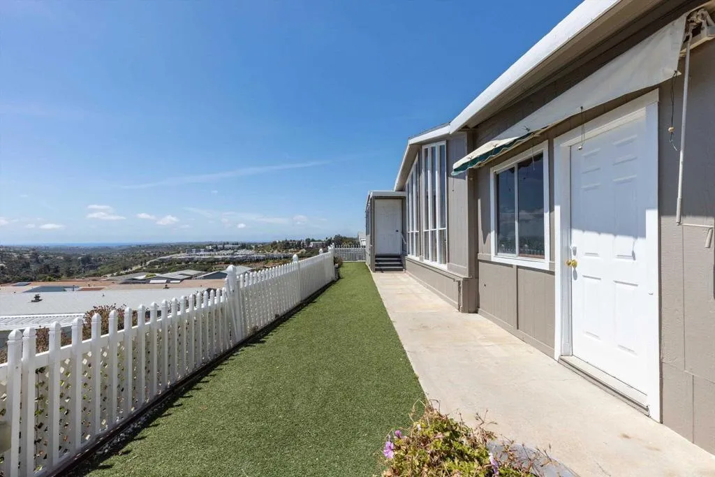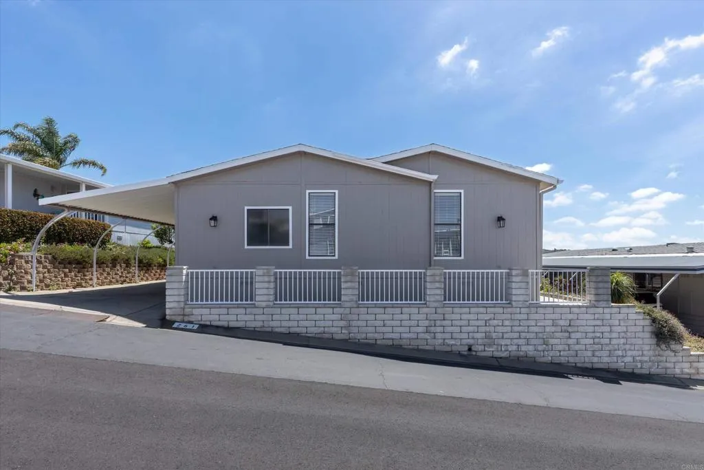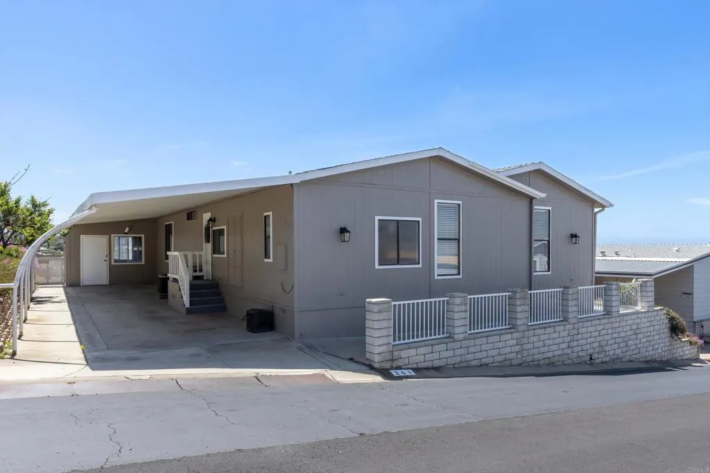 Elevated OCEAN-VIEW lot featuring a spacious, nearly 2,000 sq. ft. three-section home in highly desirable Palomar Estates West—a premier 55+ resort-style community with rent control. Located on a cul-de-sac near guest parking, clubhouse, amenities & activities! This post-HUD home qualifies for preferred financing, adding exceptional value. Designed with comfort and scale in mind, the expansive great room showcases vaulted beamed ceilings, a gas fireplace, and a wet bar, seamlessly flowing into the dining area and kitchen—ideal for both everyday living and entertaining. The kitchen offers a corner pantry, built-in dining bar, and newer refrigerator and microwave, along with abundant cabinetry and storage throughout the home. The oversized laundry room provides a deep sink, extended counter space, and additional storage. Both bedrooms feature walk-in closets, while the spacious primary suite includes dual sinks and a separate tub and shower. An enclosed porch/California room captures the ocean view, creating a peaceful indoor-outdoor retreat. Recent improvements include fresh exterior paint and newer central A/C. The widened carport allows for easier vehicle access, and the partially fenced, low-maintenance exterior features turf, a wheelchair-accessible ramp, and a generous storage shed. This five-star community permits two small pets per household (with park approval) and offers rent control, with space rent at approximately $808/month. Age 55+ with second resident allowed at 35+.