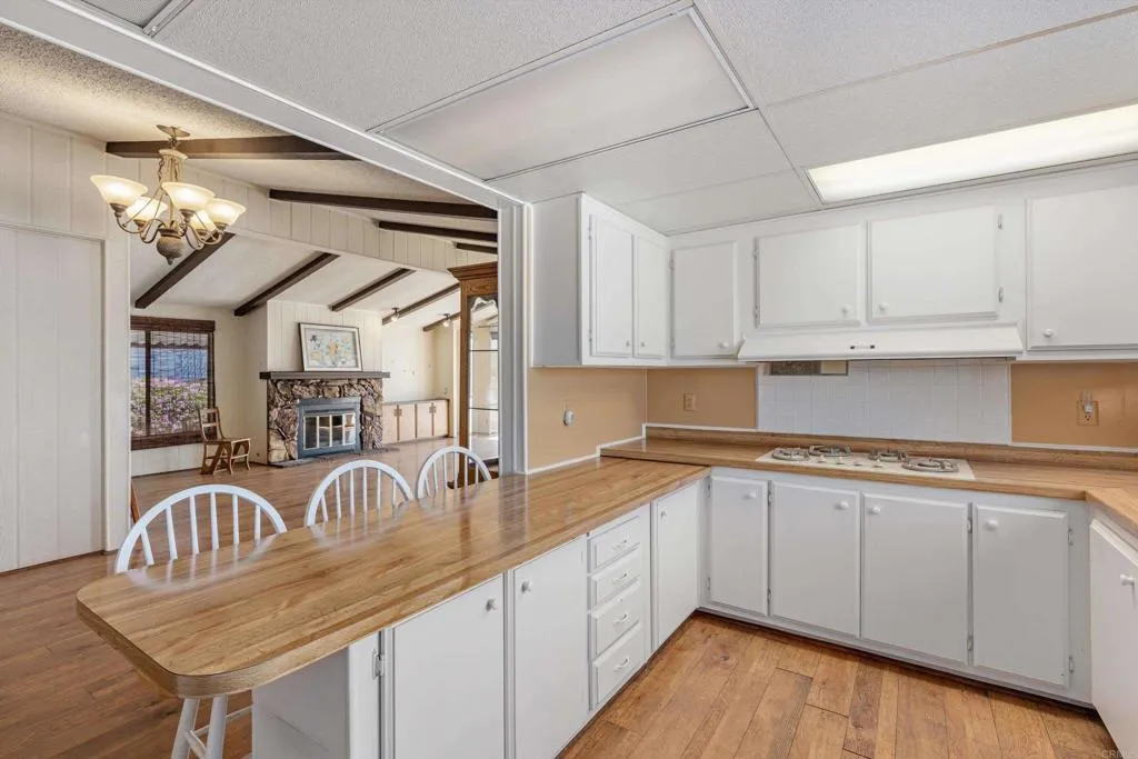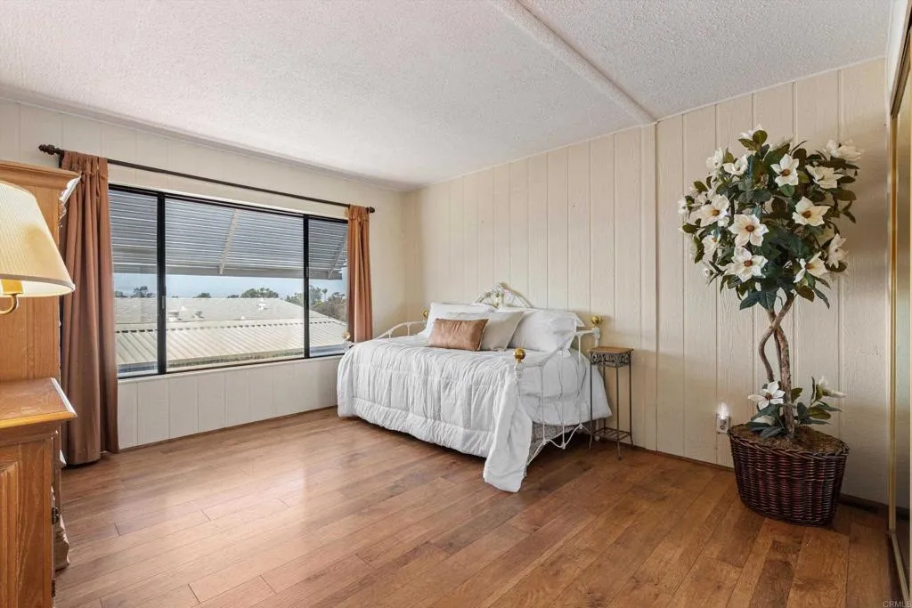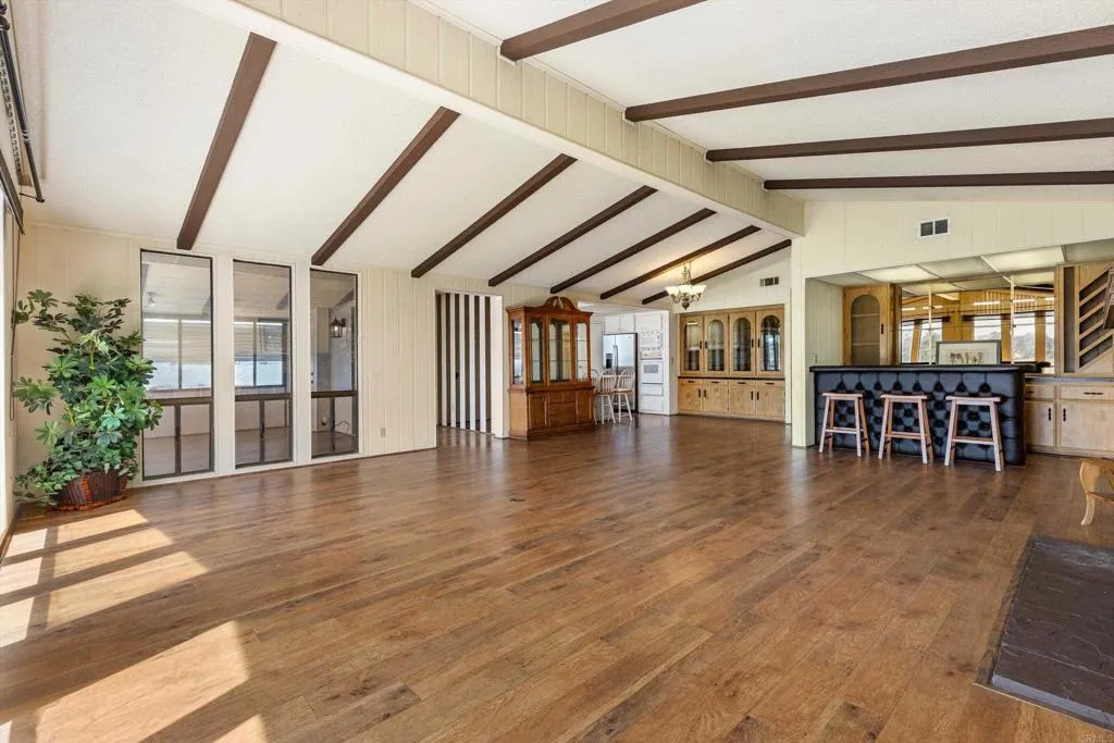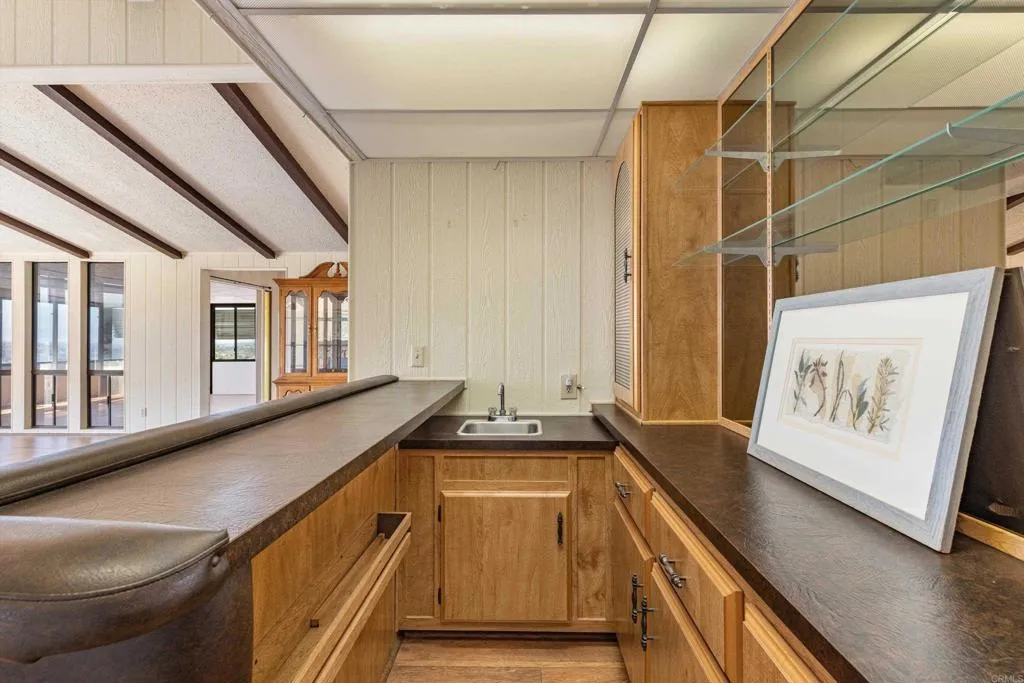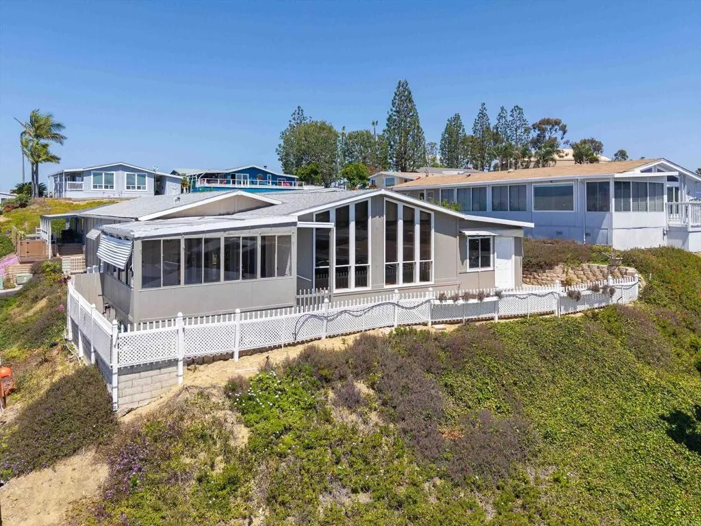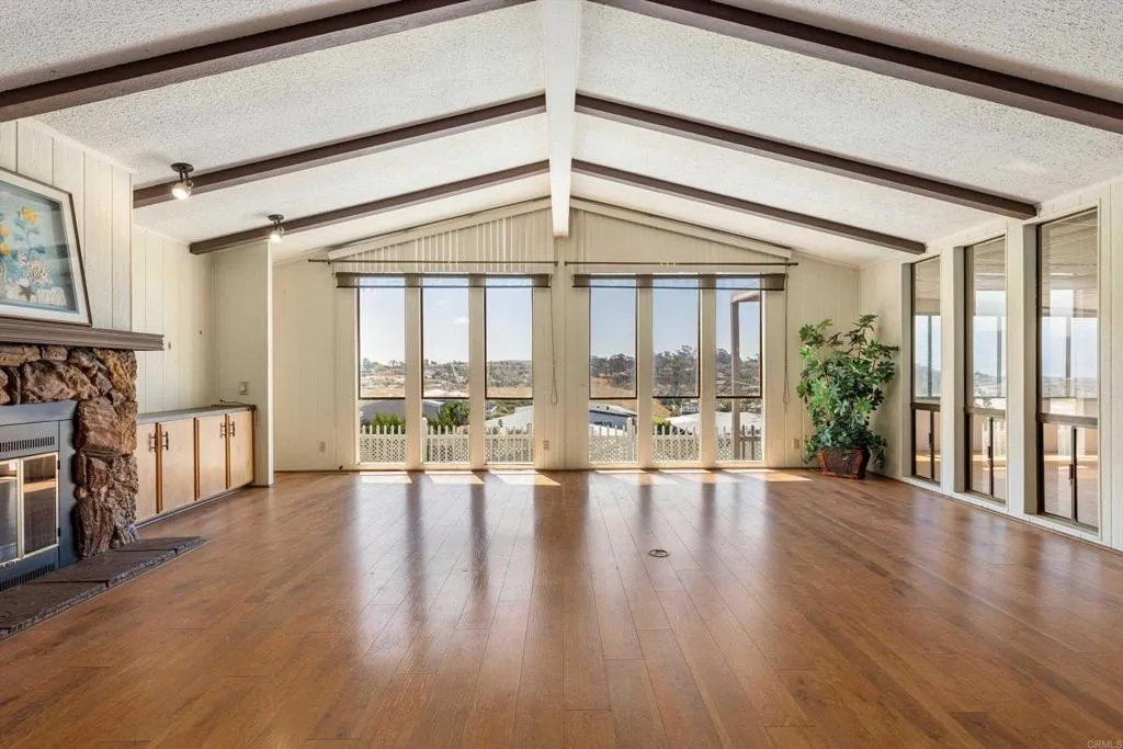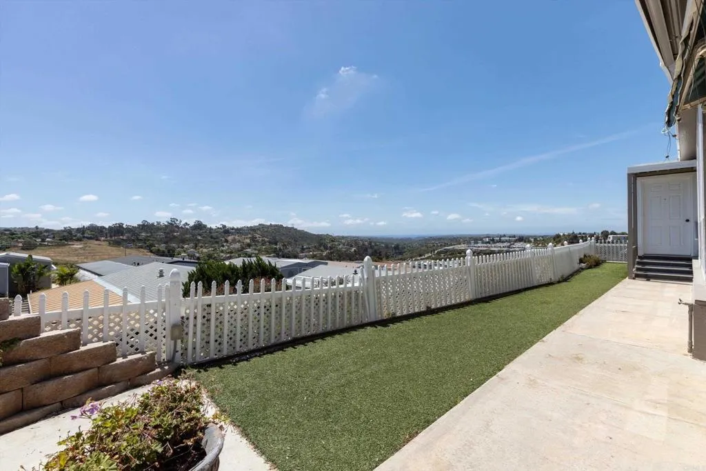 Elevated OCEAN-VIEW lot featuring a spacious, nearly 2,000 sq. ft. three-section home in highly desirable Palomar Estates West—a premier 55+ resort-style community with rent control. Located on a cul-de-sac near guest parking, clubhouse, amenities & activities! This post-HUD home qualifies for preferred financing, adding exceptional value. Designed with comfort and scale in mind, the expansive great room showcases vaulted beamed ceilings, a gas fireplace, and a wet bar, seamlessly flowing into the dining area and kitchen—ideal for both everyday living and entertaining. The kitchen offers a corner pantry, built-in dining bar, and newer refrigerator and microwave, along with abundant cabinetry and storage throughout the home. The oversized laundry room provides a deep sink, extended counter space, and additional storage. Both bedrooms feature walk-in closets, while the spacious primary suite includes dual sinks and a separate tub and shower. An enclosed porch/California room captures the ocean view, creating a peaceful indoor-outdoor retreat. Recent improvements include fresh exterior paint and newer central A/C. The widened carport allows for easier vehicle access, and the partially fenced, low-maintenance exterior features turf, a wheelchair-accessible ramp, and a generous storage shed. This five-star community permits two small pets per household (with park approval) and offers rent control, with space rent at approximately $808/month. Age 55+ with second resident allowed at 35+.