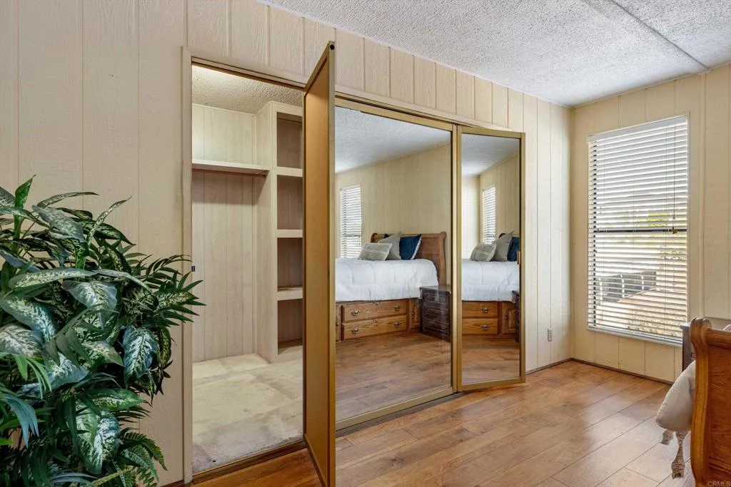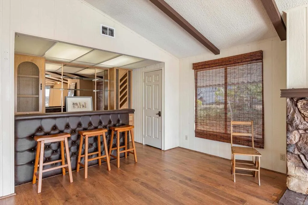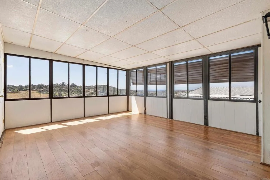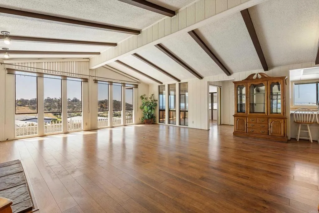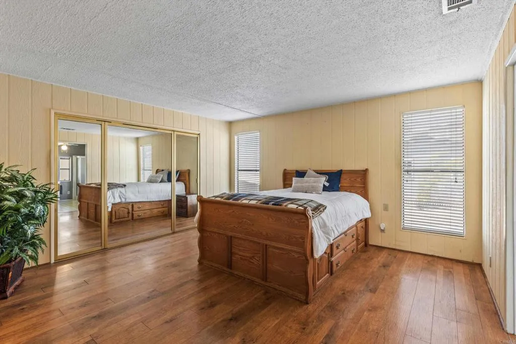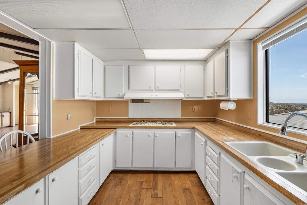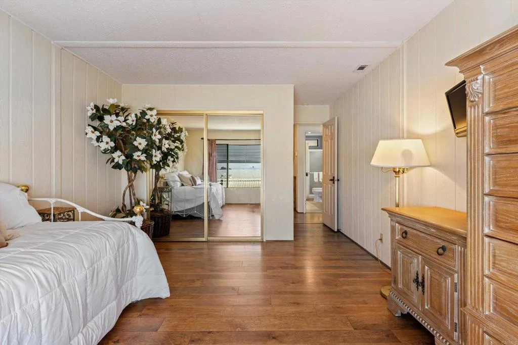 Elevated OCEAN-VIEW lot featuring a spacious, nearly 2,000 sq. ft. three-section home in highly desirable Palomar Estates West—a premier 55+ resort-style community with rent control. Located on a cul-de-sac near guest parking, clubhouse, amenities & activities! This post-HUD home qualifies for preferred financing, adding exceptional value. Designed with comfort and scale in mind, the expansive great room showcases vaulted beamed ceilings, a gas fireplace, and a wet bar, seamlessly flowing into the dining area and kitchen—ideal for both everyday living and entertaining. The kitchen offers a corner pantry, built-in dining bar, and newer refrigerator and microwave, along with abundant cabinetry and storage throughout the home. The oversized laundry room provides a deep sink, extended counter space, and additional storage. Both bedrooms feature walk-in closets, while the spacious primary suite includes dual sinks and a separate tub and shower. An enclosed porch/California room captures the ocean view, creating a peaceful indoor-outdoor retreat. Recent improvements include fresh exterior paint and newer central A/C. The widened carport allows for easier vehicle access, and the partially fenced, low-maintenance exterior features turf, a wheelchair-accessible ramp, and a generous storage shed. This five-star community permits two small pets per household (with park approval) and offers rent control, with space rent at approximately $808/month. Age 55+ with second resident allowed at 35+.