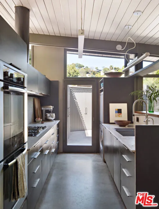 A. Quincy Jones & Whitney R. Smith, Architects | The Morris & Lydia Gelb House, 1950 | Rehabilitation by Bruce Norelius, AIA, Architect, 2014 | City of Los Angeles Historic-Cultural Monument No. 1332. Set within the utopian experiment of Crestwood Hills, the Gelb House is a rare, highly intact example of A. Quincy Jones' Mutual Housing Association vision - where architecture was not a luxury, but a disciplined framework for living. Completed in 1950, the house embodies a rigor that feels increasingly scarce. The post-and-beam structure is expressed with clarity - Douglas fir framing, concrete block, and redwood working together without ornament or redundancy. Every decision is economical, never compromised. Sited into the hillside, the plan unfolds with quiet logic: private rooms at one end, living spaces opening outward, and structure doing the work of both enclosure and expression. A concrete block fireplace anchors the interior, while skylights along the ridge beam draw light deep into the plan. Owned by the original family for decades, the house remained largely untouched - preserving the intent of the MHA experiment, a community that reimagined postwar housing as cooperative, modern, and connected to landscape. The restoration by Bruce Norelius Studio approaches the house with restraint. Systems have been updated and key spaces - kitchen and baths - reworked with a sympathetic material palette, while the original structure remains intact. Interventions are legible and deliberately quiet - a careful continuation. On a large corner lot surrounded by mature trees, the flat pad offers potential for expansion, with room for a pool or additional living space. In a market where "mid-century" is often diluted, the Gelb House stands apart as the real thing. Photography: Tim Street-Porter.