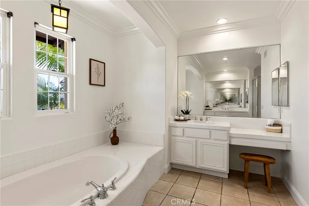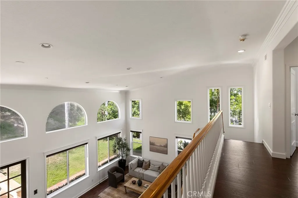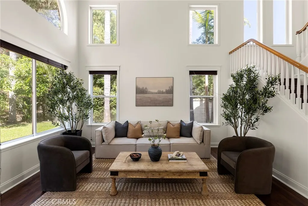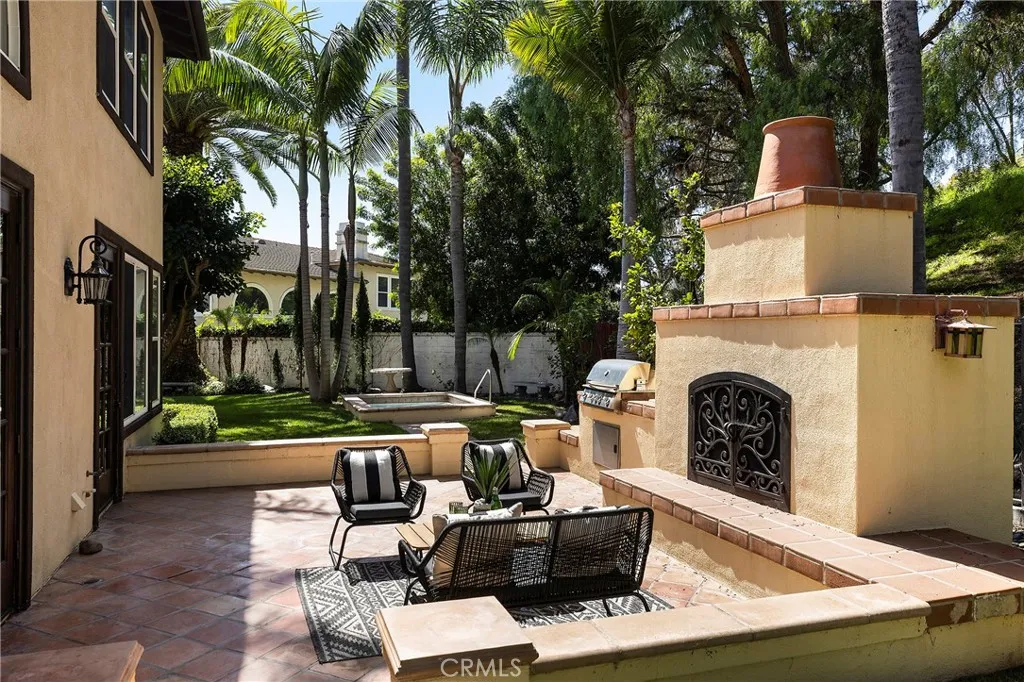 Hidden away in the desirable Monterey enclave anchoring an oversized lot in the pocket of a unique double cul-de-sac, this home is truly a rare find. Framed by mature palms, this hacienda-infused residence draws you within, featuring soaring two-story ceilings & dramatic arched transom windows. The seamless open-concept layout flows effortlessly from the grand entryway into a refined living & dining area, all anchored by rich hardwood floors & custom African Mahogany features. The bookshelf serves as a stunning design element along the dining wall while large-scale French doors lead to the patios beyond. A bedroom on the main level offers the perfect guest quarters (flexibility for a home office or kids play room). A convenient full bath serves both the bedroom and the main living. The great room welcomes you featuring an updated kitchen with custom shaker cabinetry, newer stainless appliances, & wood-beamed ceilings that flows seamlessly into the family room. This is the heart of the home - a great gathering space with high ceilings, a large kitchen island, informal dining, & a comfortable family room warmed by a gas fireplace. The great room spills out to an expansive backyard, turning the whole back of the house into one giant indoor-outdoor entertaining space. Step through the French doors into your own private getaway. The backyard is anchored by a Spanish-inspired fireplace & Saltillo patio. A built-in BBQ, in-ground spa, & several sprawling grassy areas are all enhanced by old-growth trees adding to the major allure of this secluded, estate-like property. With 3 spacious bedrooms upstairs, the primary suite sits on its own wing creating a peaceful retreat. Offering expansive windows that frame the lush hillside greenery outside & an en-suite bath, designed for total relaxation with a deep soaking tub & walk-in shower. Dual vanities with massive mirrors provide plenty of space. Two additional guest bedrooms share a Jack & Jill bathroom. Other values include a paid-off solar system, brand-new PEX plumbing, new wood flooring that spans the entire upper level & staircase, a 3-car garage (one finished) & a dedicated downstairs laundry room. Conveniently located near a beautiful greenbelt & just steps away from Talega’s premier parks, several pools, the public Talega Golf Club, & a quick drive to SC’s famous beaches, iconic pier, & the 2.5-mile beach trail, & world-class surfing at Trestles, this home offers a rare combination of serenity & space.