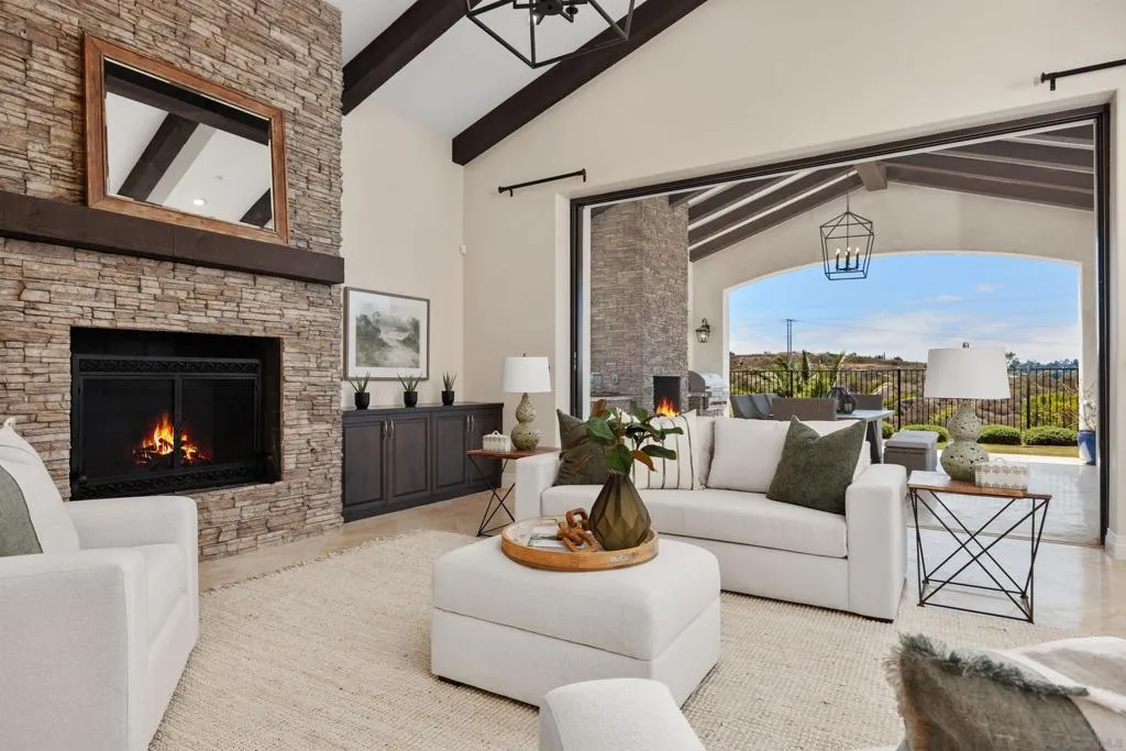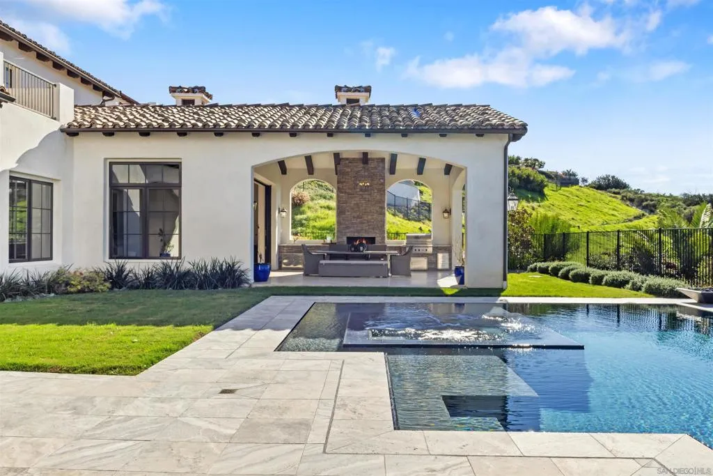 Completed in 2022, this exceptional custom estate is among the newest offerings in the Crosby at Rancho Santa Fe. Designed by Scott Grunst and set on a quiet, premier street, the home blends timeless architecture with modern refinement across approximately 6,523 square feet. A dramatic 22-foot foyer with arched windows, hardwood floors, exposed beams, and a wrought-iron staircase sets the tone. The chef’s kitchen features an eight-burner Wolf range with infrared charbroiler, 64-inch refrigerator/freezer, and dual dishwashers, complemented by a wet bar with kegerator and a temperature- and humidity-controlled wine cellar for approximately 800 bottles. Seamless indoor-outdoor living is achieved with disappearing pocket doors opening to a covered loggia with full outdoor kitchen, fireplace, and Wolf BBQ. The private backyard offers a PebbleTec® rim-flow pool, vanishing-edge spa, fire features, and unobstructed sunset views over a protected natural preserve with no rear neighbors. The flexible floor plan includes a main level executive office with fireplace and built-ins, plus a guest or secondary primary suite ideal for multigenerational living. Upstairs features a spacious primary retreat, two en-suite bedrooms, and a loft with private balcony. Within the highly rated Solana Santa Fe (K–8) and Torrey Pines High School districts, and near top private academies. Partial early Mello-Roos payoff in 2030. Additional highlights include Brazilian quartzite countertops, custom stained alder cabinetry, owned solar, an expansive motor court, and a four-car garage configuration, attached two-car with Tesla charger plus a detached, insulated two-car garage pre-wired for A/C, ideal for a gym or studio. Residents enjoy access to The Crosby’s Fred Couples-designed golf course, 35,000-square-foot clubhouse, tennis and pickleball courts, pool, spa, fitness center, dining, and social events. Convenient access to Rancho Santa Fe Village and Hwy 56, I-15, and I-5.