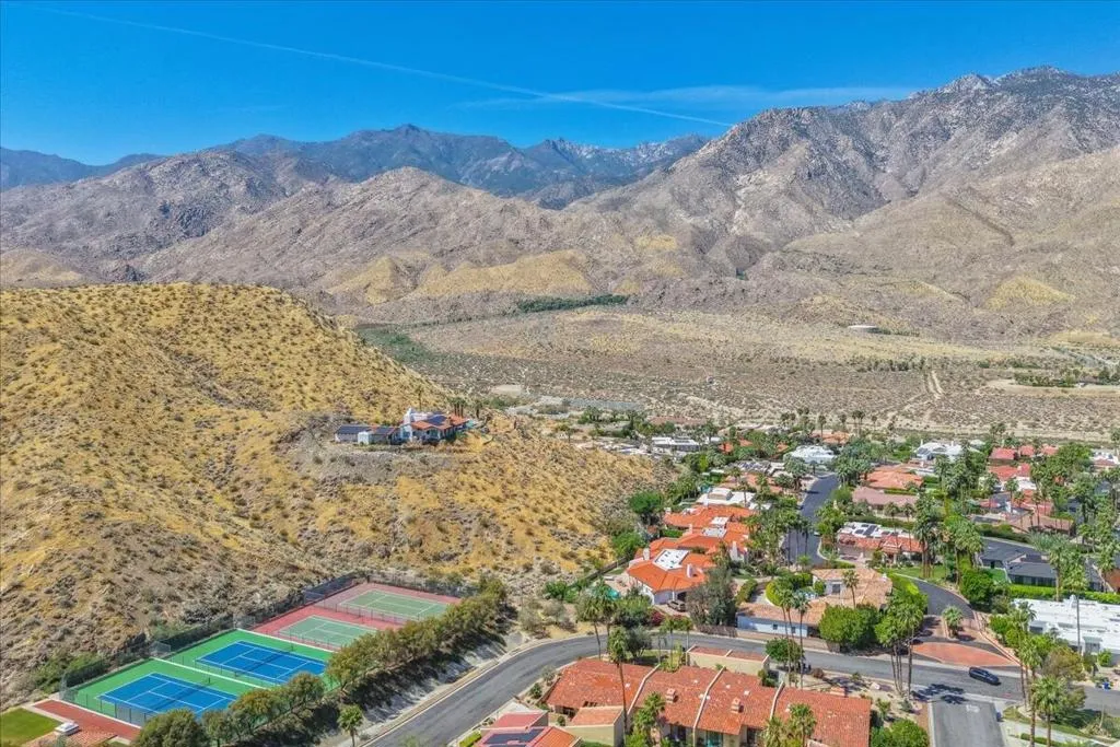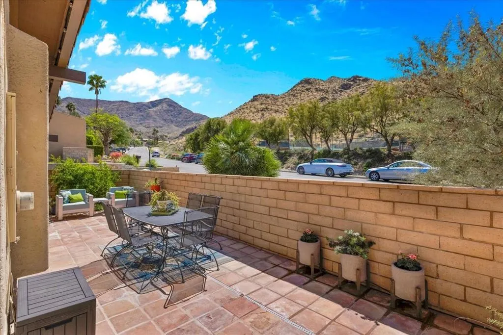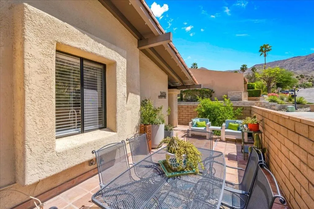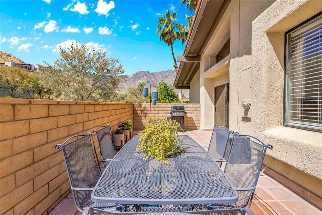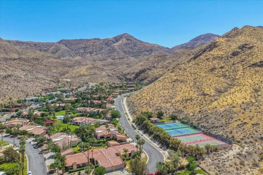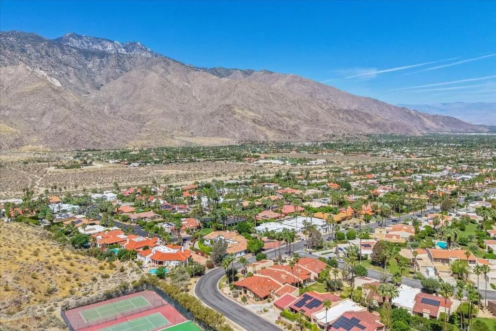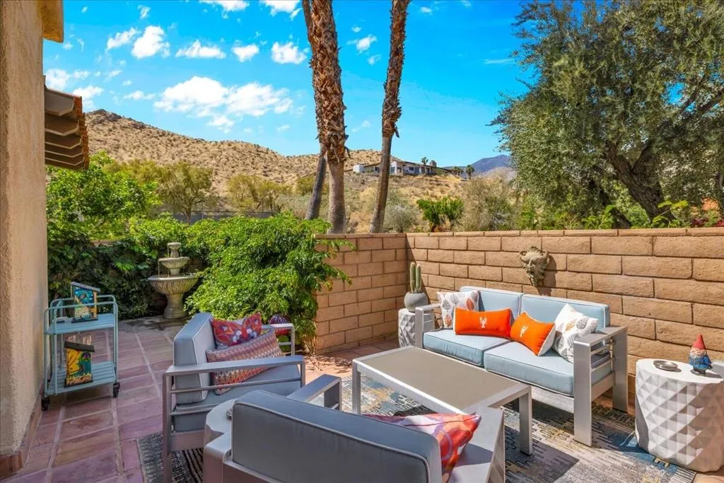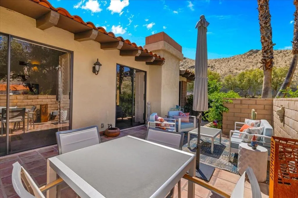 Mountain Views & Modern Luxury in Andreas HillsExperience the pinnacle of desert living in this spacious, light-filled condominium nestled in the prestigious Andreas Hills neighborhood of South Palm Springs. Positioned perfectly on a large, curved corner lot, this home blends dramatic architectural scale with high-end modern upgrades. From the moment you pass through the double-door entry, you are greeted by soaring 12-foot ceilings and panoramic West and South mountain views. Whether you're relaxing by the living room fireplace or hosting guests at the built-in wet bar, the majestic desert landscape serves as your constant backdrop.This home has been renovated for beauty and peace of mind: Modern Chef's Kitchen: Upgraded with contemporary finishes.Designer Bathrooms: All three bathrooms have been elegantly refreshed. Enhanced Infrastructure: New electrical panel, upgraded flooring throughout, and enhanced air conditioning for year-round comfort.Seamless Indoor-Outdoor Flow: The sellers have extended and walled-in multiple exterior patios, creating private sanctuaries for morning coffee or sunset cocktails. Both bedrooms serve as ensuite sanctuaries, each featuring its own private patio. The primary suite is a true standout, offering dual walk-in closets and an expansive, spa-like bathroom. This is more than just a condo; with its large lot and quiet surroundings, it feels like a single-family home. This ''Fee Land'' property (you own the land) is a rare find in such a sought-after area.