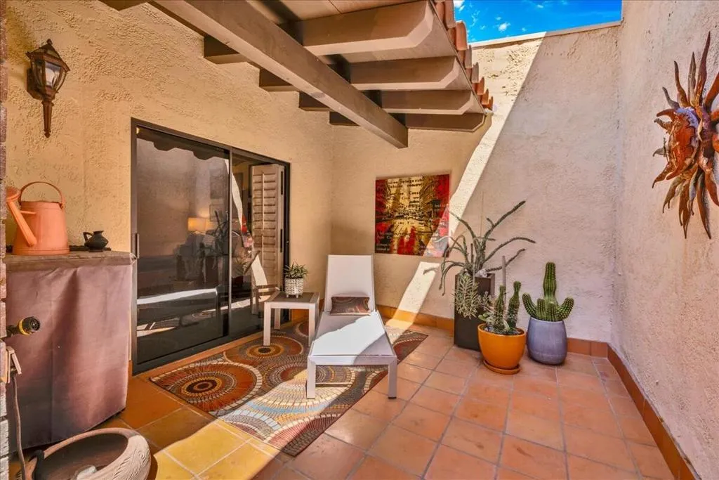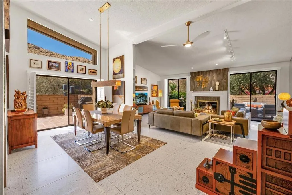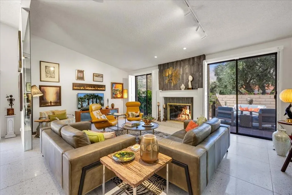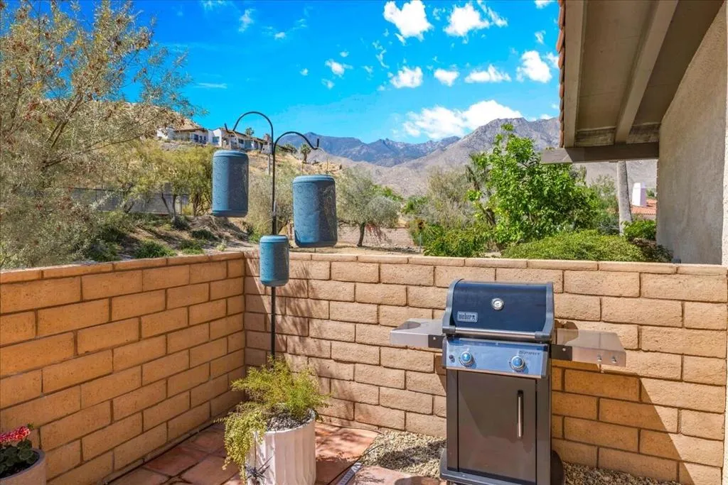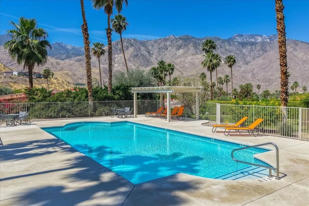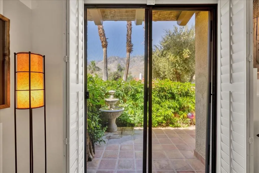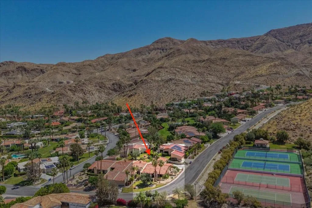 Mountain Views & Modern Luxury in Andreas HillsExperience the pinnacle of desert living in this spacious, light-filled condominium nestled in the prestigious Andreas Hills neighborhood of South Palm Springs. Positioned perfectly on a large, curved corner lot, this home blends dramatic architectural scale with high-end modern upgrades. From the moment you pass through the double-door entry, you are greeted by soaring 12-foot ceilings and panoramic West and South mountain views. Whether you're relaxing by the living room fireplace or hosting guests at the built-in wet bar, the majestic desert landscape serves as your constant backdrop.This home has been renovated for beauty and peace of mind: Modern Chef's Kitchen: Upgraded with contemporary finishes.Designer Bathrooms: All three bathrooms have been elegantly refreshed. Enhanced Infrastructure: New electrical panel, upgraded flooring throughout, and enhanced air conditioning for year-round comfort.Seamless Indoor-Outdoor Flow: The sellers have extended and walled-in multiple exterior patios, creating private sanctuaries for morning coffee or sunset cocktails. Both bedrooms serve as ensuite sanctuaries, each featuring its own private patio. The primary suite is a true standout, offering dual walk-in closets and an expansive, spa-like bathroom. This is more than just a condo; with its large lot and quiet surroundings, it feels like a single-family home. This ''Fee Land'' property (you own the land) is a rare find in such a sought-after area.