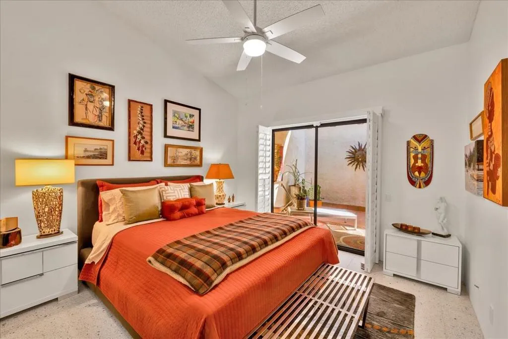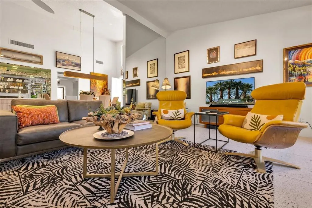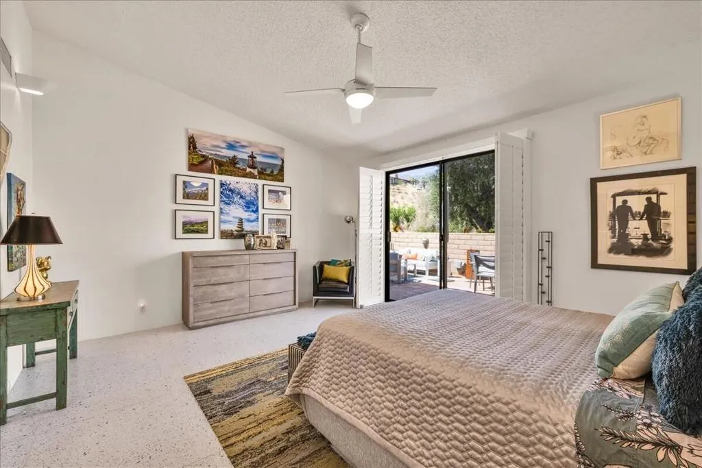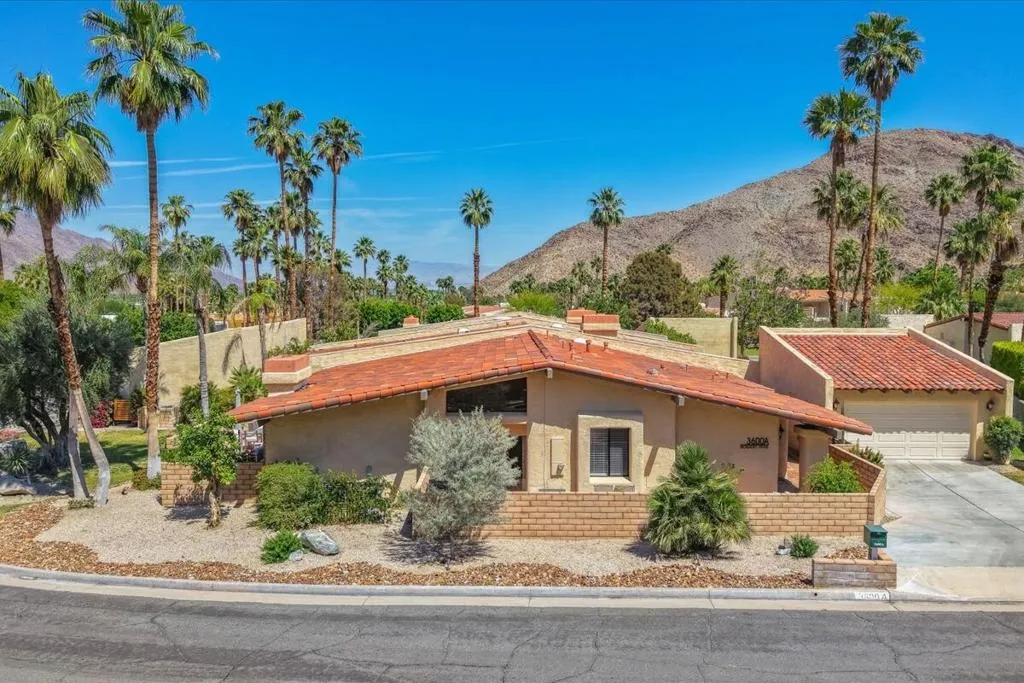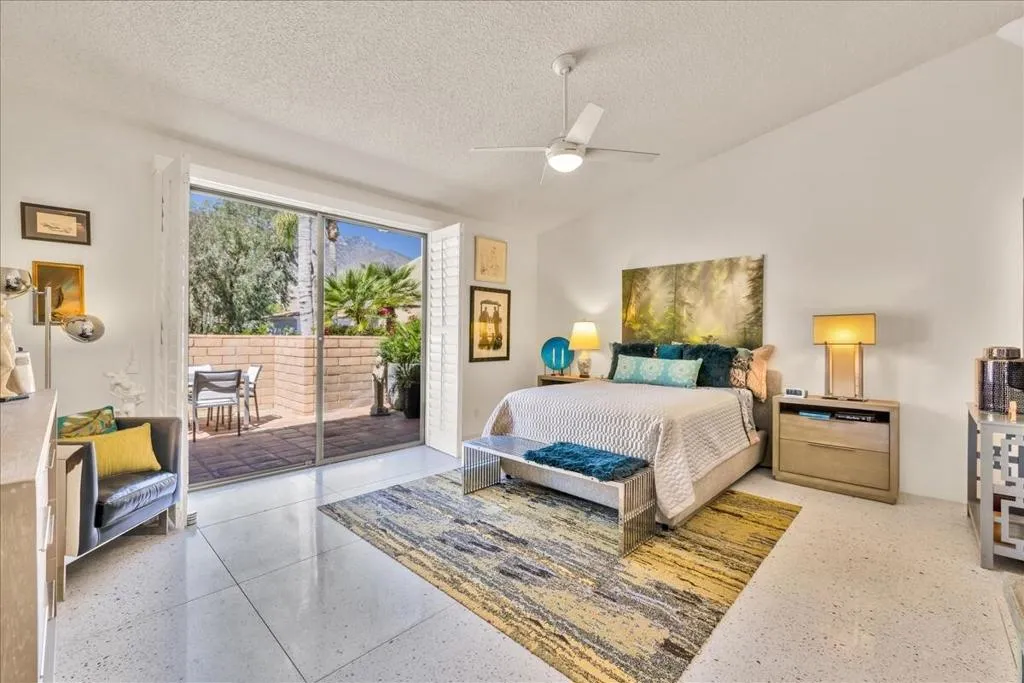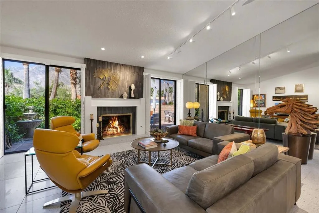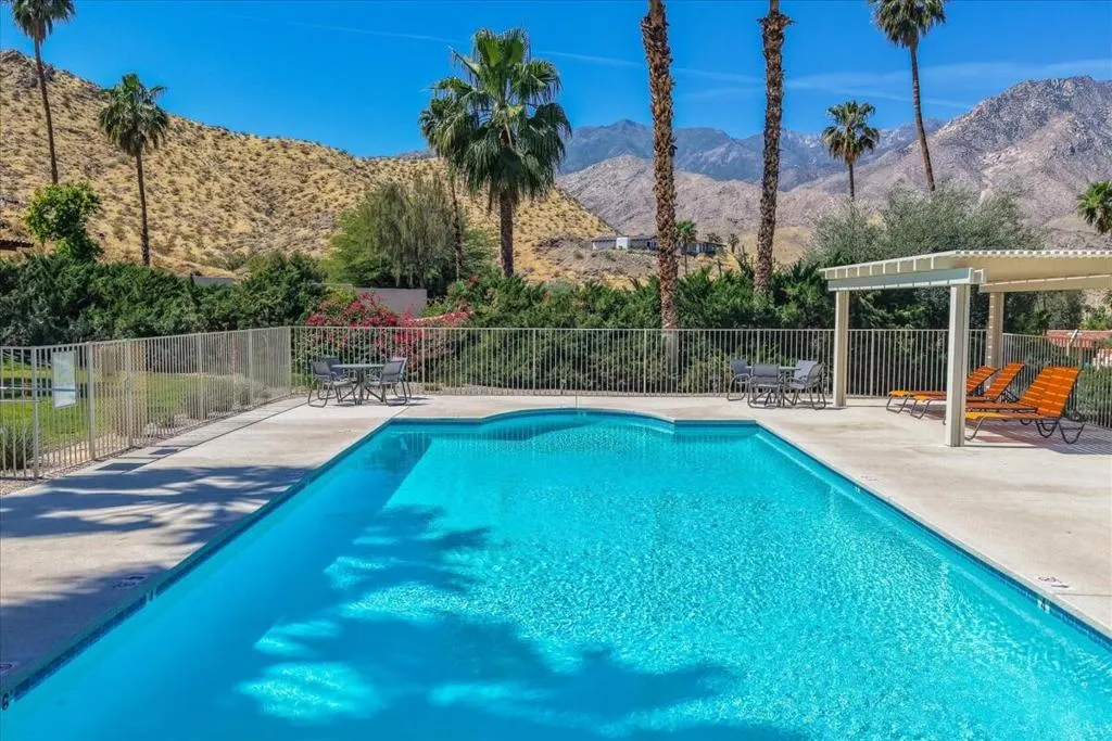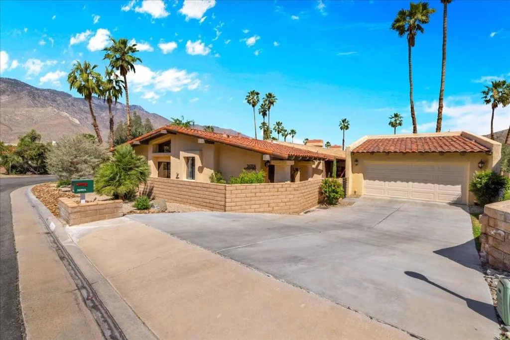 Mountain Views & Modern Luxury in Andreas HillsExperience the pinnacle of desert living in this spacious, light-filled condominium nestled in the prestigious Andreas Hills neighborhood of South Palm Springs. Positioned perfectly on a large, curved corner lot, this home blends dramatic architectural scale with high-end modern upgrades. From the moment you pass through the double-door entry, you are greeted by soaring 12-foot ceilings and panoramic West and South mountain views. Whether you're relaxing by the living room fireplace or hosting guests at the built-in wet bar, the majestic desert landscape serves as your constant backdrop.This home has been renovated for beauty and peace of mind: Modern Chef's Kitchen: Upgraded with contemporary finishes.Designer Bathrooms: All three bathrooms have been elegantly refreshed. Enhanced Infrastructure: New electrical panel, upgraded flooring throughout, and enhanced air conditioning for year-round comfort.Seamless Indoor-Outdoor Flow: The sellers have extended and walled-in multiple exterior patios, creating private sanctuaries for morning coffee or sunset cocktails. Both bedrooms serve as ensuite sanctuaries, each featuring its own private patio. The primary suite is a true standout, offering dual walk-in closets and an expansive, spa-like bathroom. This is more than just a condo; with its large lot and quiet surroundings, it feels like a single-family home. This ''Fee Land'' property (you own the land) is a rare find in such a sought-after area.
