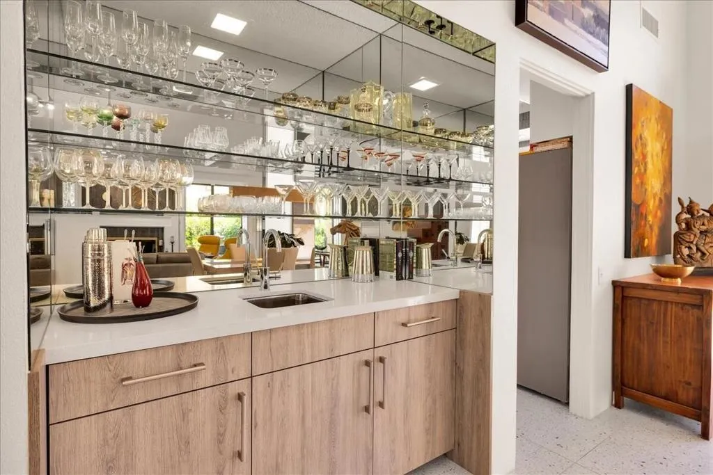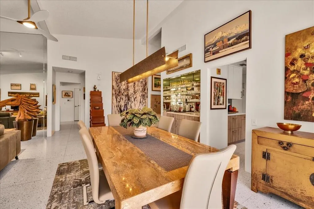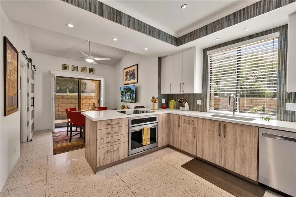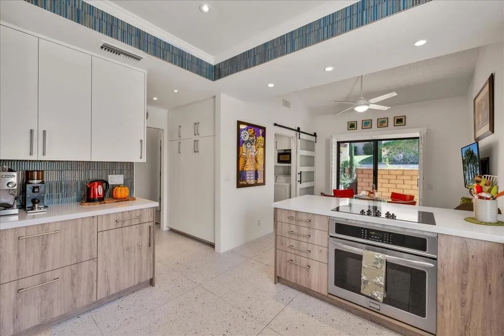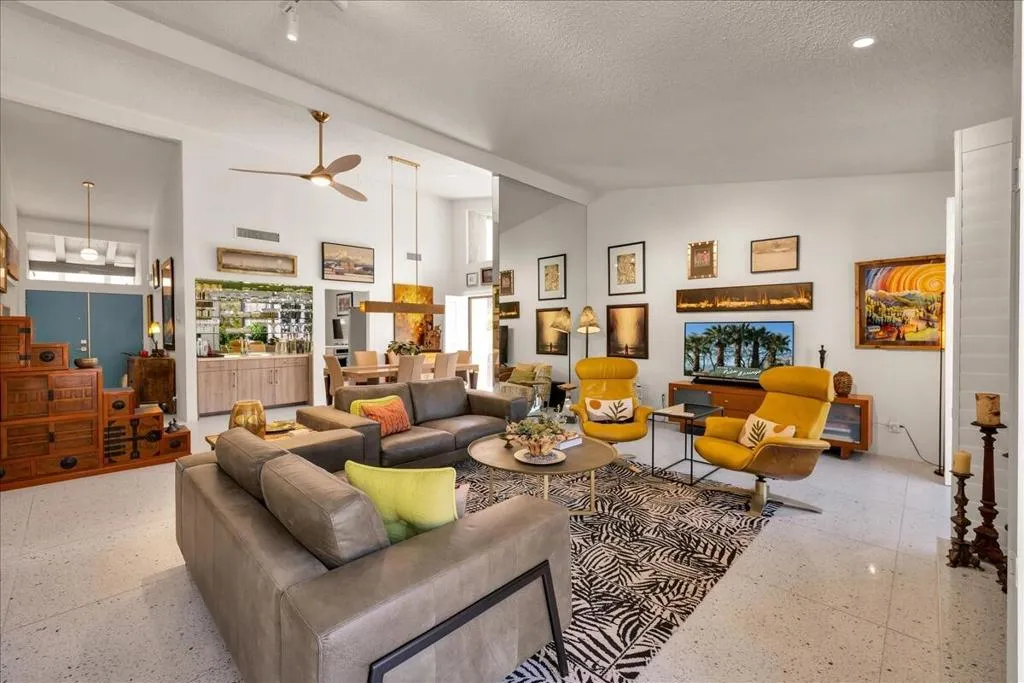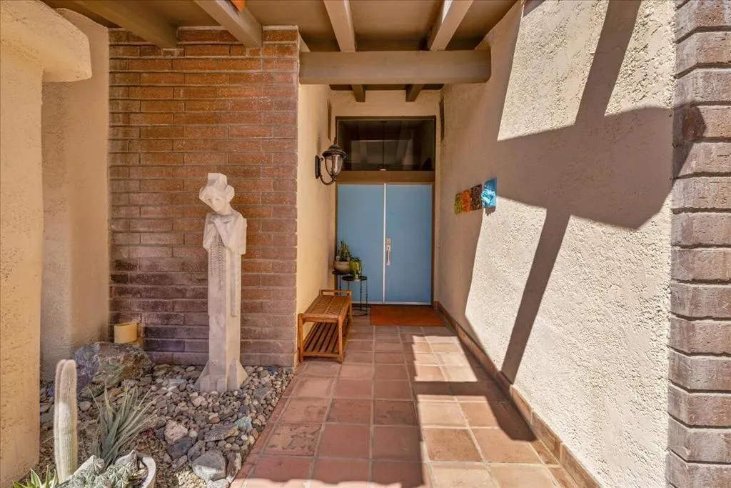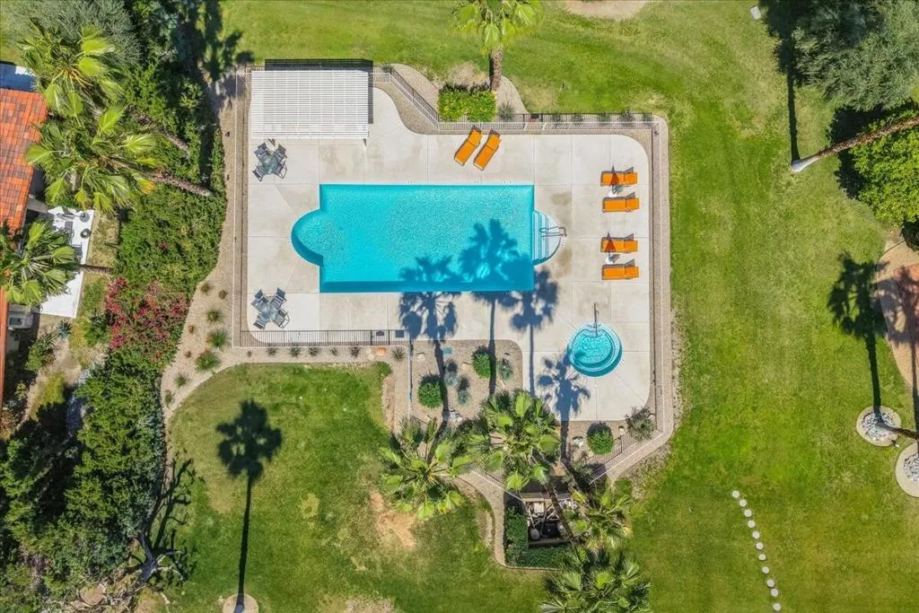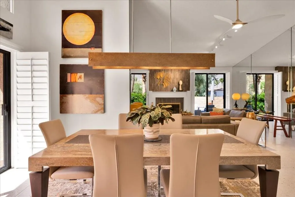Mountain Views & Modern Luxury in Andreas HillsExperience the pinnacle of desert living in this spacious, light-filled condominium nestled in the prestigious Andreas Hills neighborhood of South Palm Springs. Positioned perfectly on a large, curved corner lot, this home blends dramatic architectural scale with high-end modern upgrades. From the moment you pass through the double-door entry, you are greeted by soaring 12-foot ceilings and panoramic West and South mountain views. Whether you're relaxing by the living room fireplace or hosting guests at the built-in wet bar, the majestic desert landscape serves as your constant backdrop.This home has been renovated for beauty and peace of mind: Modern Chef's Kitchen: Upgraded with contemporary finishes.Designer Bathrooms: All three bathrooms have been elegantly refreshed. Enhanced Infrastructure: New electrical panel, upgraded flooring throughout, and enhanced air conditioning for year-round comfort.Seamless Indoor-Outdoor Flow: The sellers have extended and walled-in multiple exterior patios, creating private sanctuaries for morning coffee or sunset cocktails. Both bedrooms serve as ensuite sanctuaries, each featuring its own private patio. The primary suite is a true standout, offering dual walk-in closets and an expansive, spa-like bathroom. This is more than just a condo; with its large lot and quiet surroundings, it feels like a single-family home. This ''Fee Land'' property (you own the land) is a rare find in such a sought-after area.