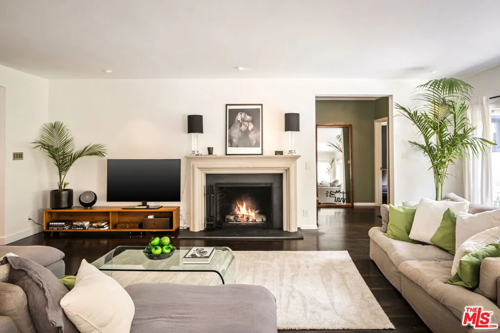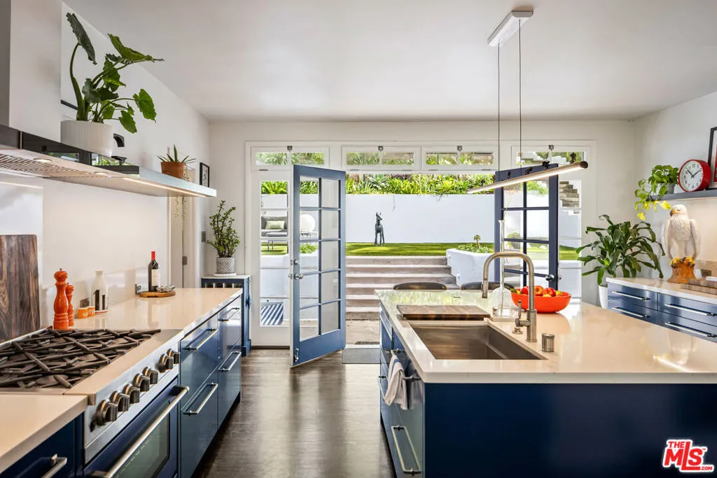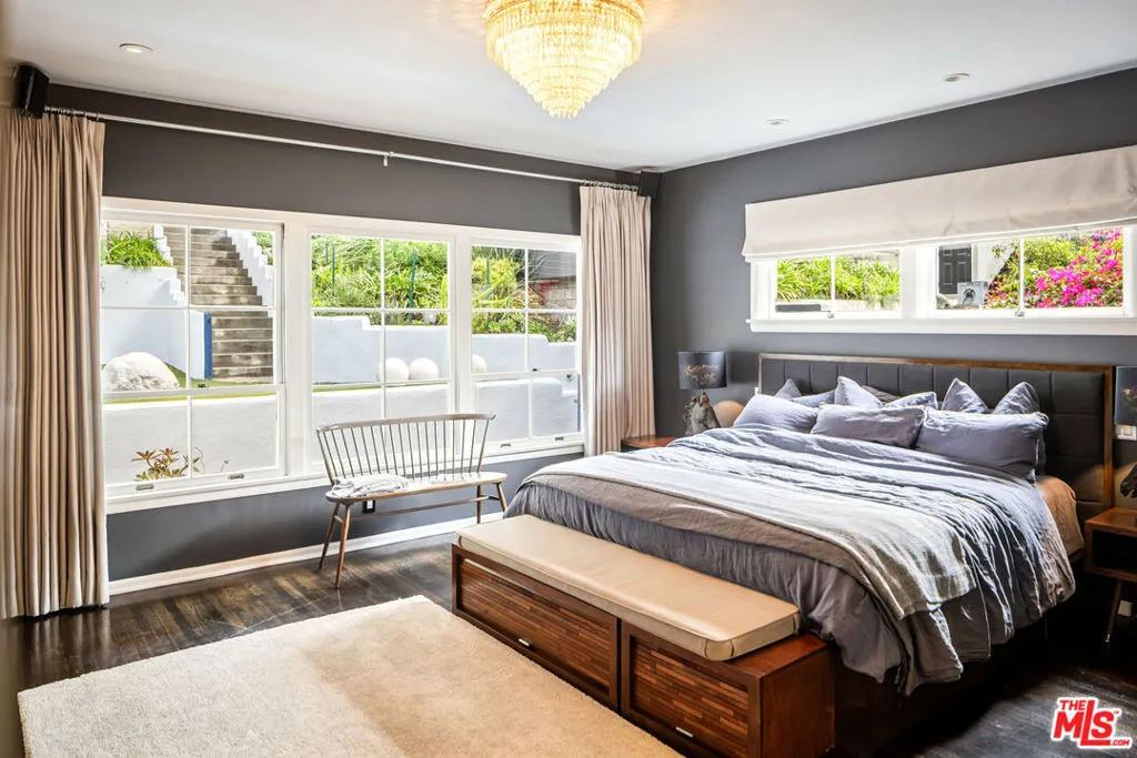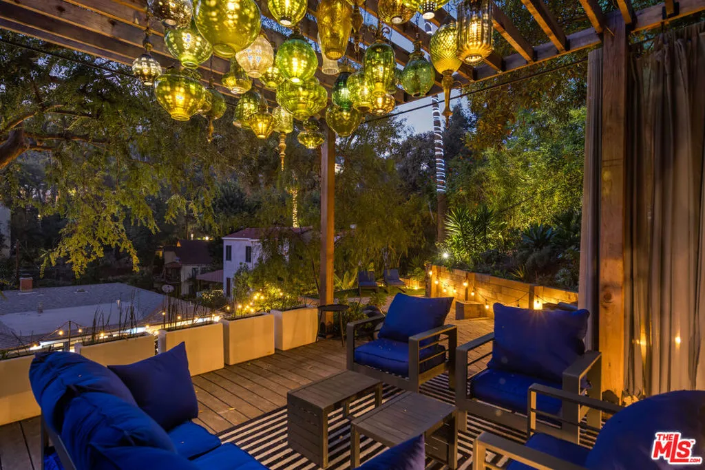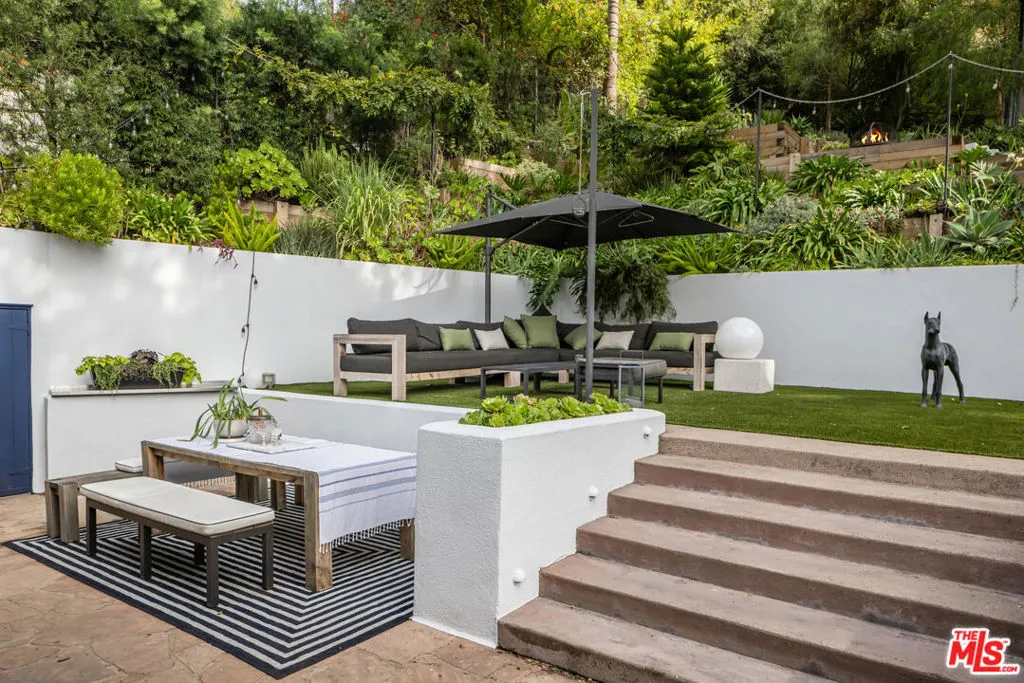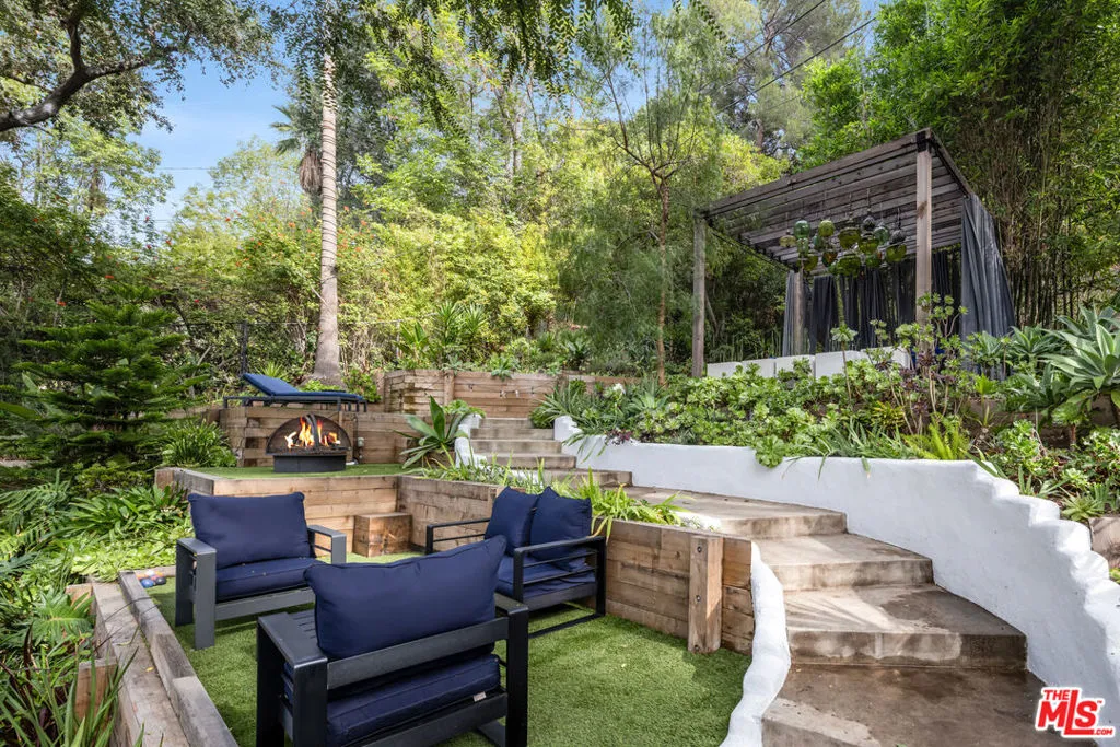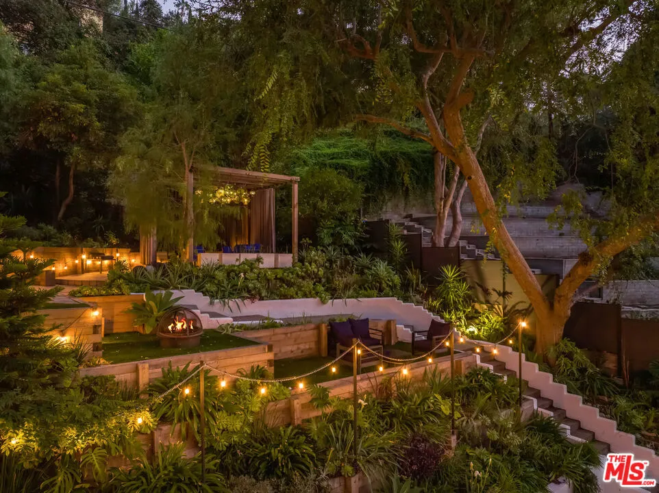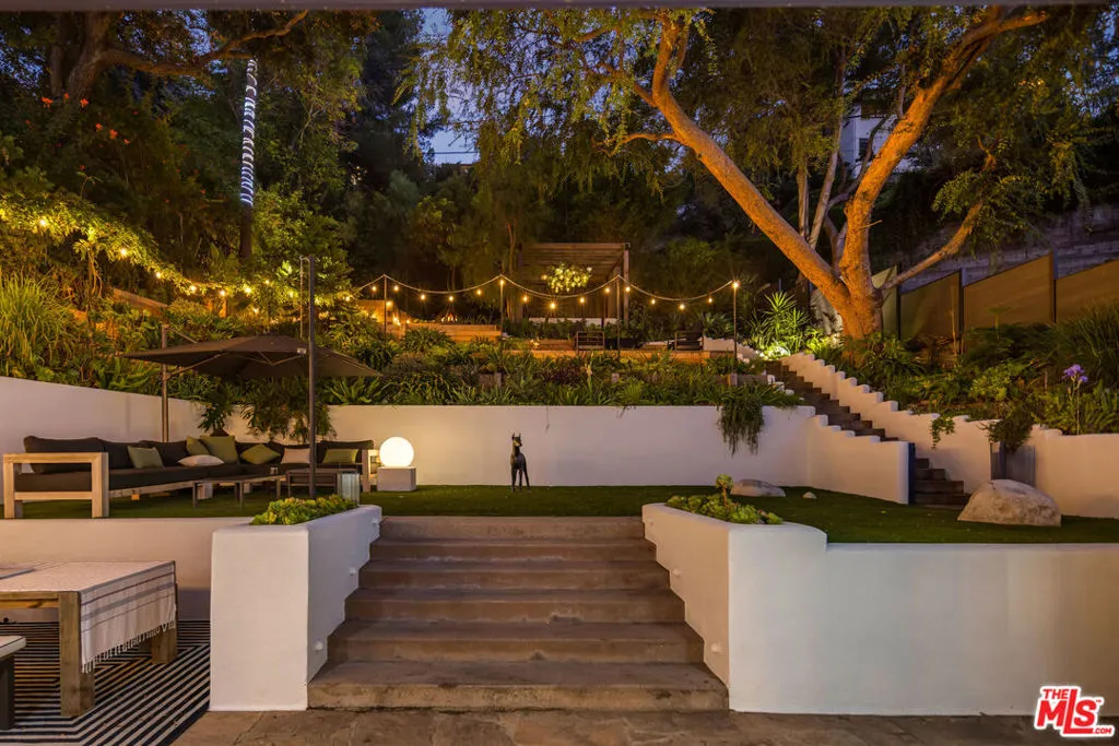 This gated Traditional home with mid-century modern influences and PRIVATE GUEST SUITE sit on a large, wooded lot in upper Beachwood Canyon. Formerly celebrity-owned and tucked back from the street, this home's expansive rear yard is an outdoor sanctuary bringing the tranquility of nature to everyday living. green canyon views can be seen from the oversized windows creating an airiness throughout the living space, anchored by a renovated kitchen which seamlessly joins both interior living and the outdoors. The kitchen is outfitted with built-in, luxury appliances, a large island, and plentiful countertop prep space. Whether you prefer entertaining or quiet fireside moments, this home offers the space for your household to sprawl on the 4 bedroom, 3 bath main level inclusive of an oversized, primary suite with custom Walnut built-in's and dedicated laundry/utility room. Rear French doors open to your own secluded garden designed for entertaining. Winding paths of the curated grounds showcase its succulent gardens, professionally landscaped terraces, several lounging areas, banana and Meyer lemon trees, and private hilltop pergola illuminated by a masterfully designed light installation. Out of town guests can enjoy the privacy of a PRIVATE GUEST SUITE on the lower level with its own kitchenette, bathroom, bedroom/office and private garden. The two-car garage features built-in cabinets & utility sink. Close to hiking trails, Beachwood market, city night life, and major studios. Experience the magic of this private sanctuary in iconic Beachwood Canyon.