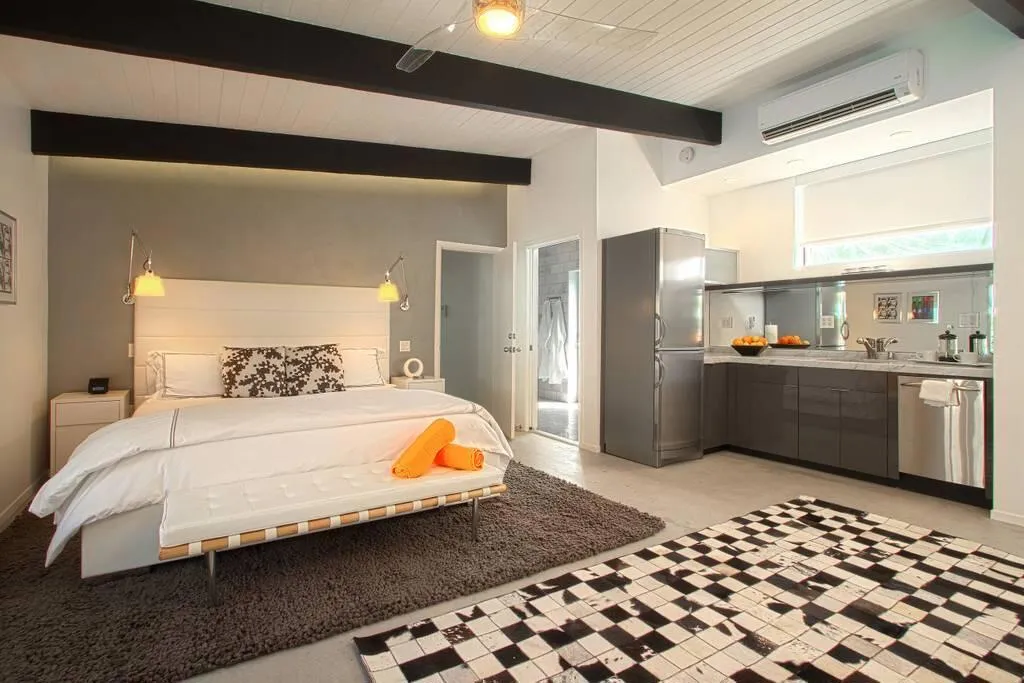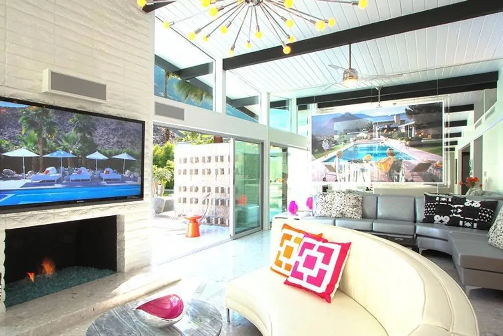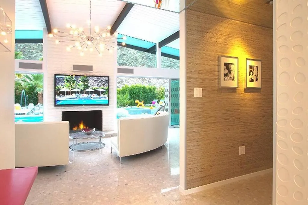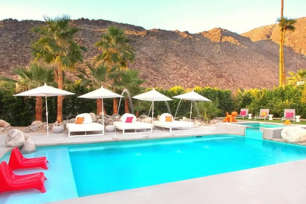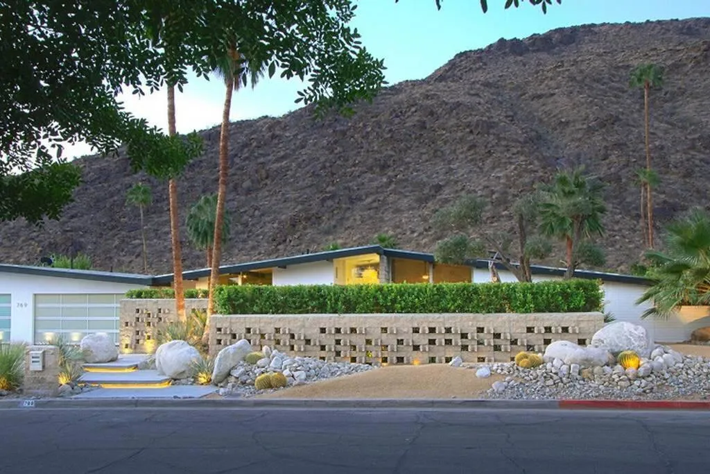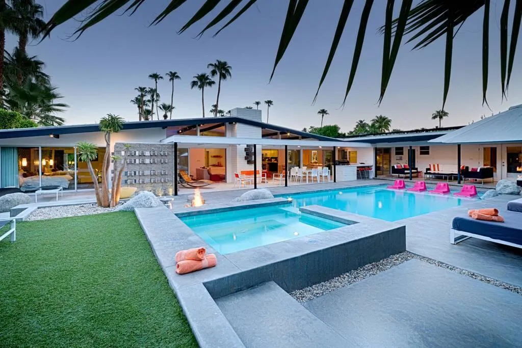 The Ultimate Multigenerational Compound and iconic Mid-Century Modern Alexander combined! Experience the timeless elegance of Palm Springs architecture in this iconic 1958 Mid-century modern Alexander Butterfly home, located in the prestigious Vista Las Palmas neighborhood. This meticulously modernized estate offers over 4,000 square feet of luxury indoor/outdoor living, distinguished by a rare and flexible layout featuring four bedrooms and three baths in the main residence plus the option of one or two independent casitas. This multi-structure design provides an unparalleled level of privacy and independence, supported by two full kitchens and an additional third kitchenette, making it the ultimate compound for hosting family and friends or for multi-generational living. Every inch of the gated and fully fenced grounds is designed for the sophisticated indoor-outdoor lifestyle Palm Springs is famous for. Stunning terrazzo flooring and curated art pieces create an awe-inspiring interior atmosphere, while wall-to-wall glass doors across the rear disappear to blend the interior with breathtaking mountain views. The exterior is a private resort unto itself, featuring two outdoor showers, firepit, newly resurfaced pool and spa, and outdoor heaters for year-round comfort. Sustainability meets luxury with an extensive green-energy suite, including an oversized solar panel system and solar hot water for the pool, complemented by a high-efficiency 400K BTU commercial natural gas heater to significantly reduce utility costs. Modern essentials are integrated throughout, from the 220-volt electric car charger and energy-saving smart thermostats, high-speed WiFi and security system. Offered fully furnished, the home includes a chef's kitchen with Viking high-end 6-burner gas range, wall oven/microwave, double width Fridge/freezer, three dishwashers, and more. Situated just a short walk from downtown Palm Canyon Blvd coffee shops, fine dining, and the O'Donnell Golf Course just blocks away. This is a rare opportunity to own a piece of history in the 'Beverly Hills of Palm Springs.' As of February 2026, a Palm Springs Vacation Rental Permit is available, making this a turn-key investment or a world-class private retreat.