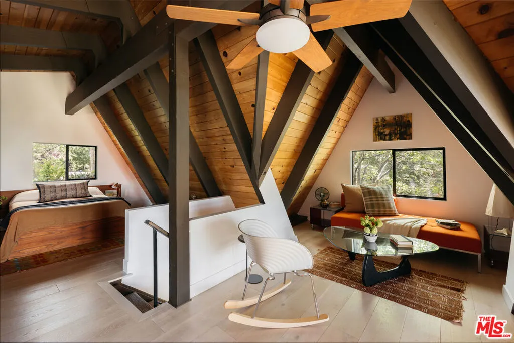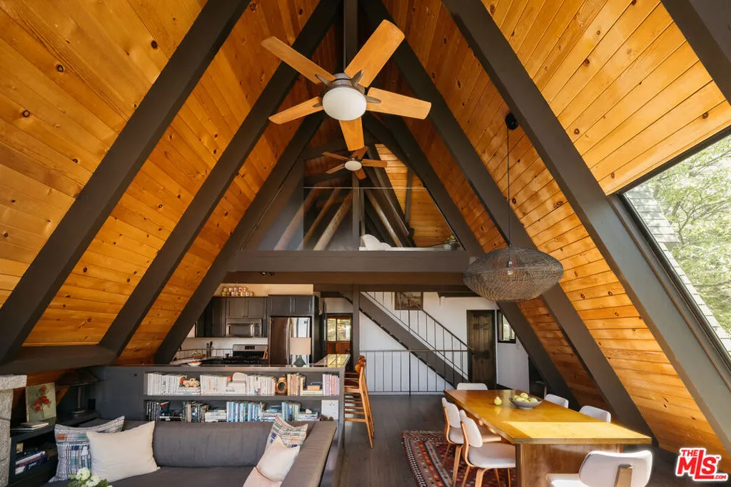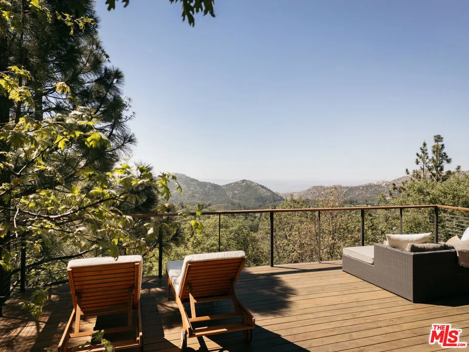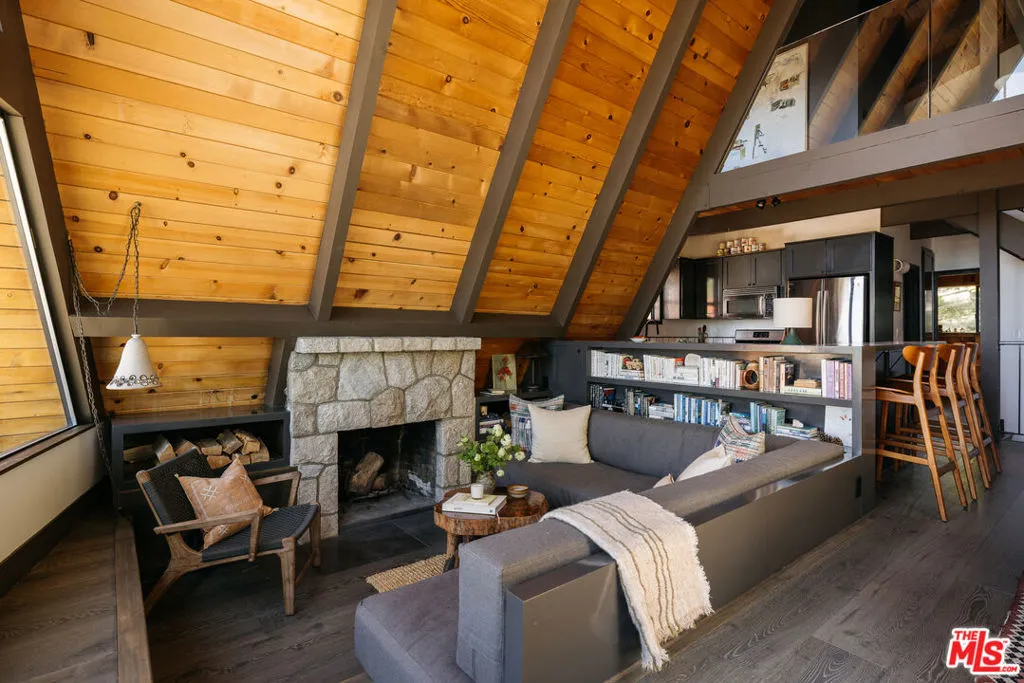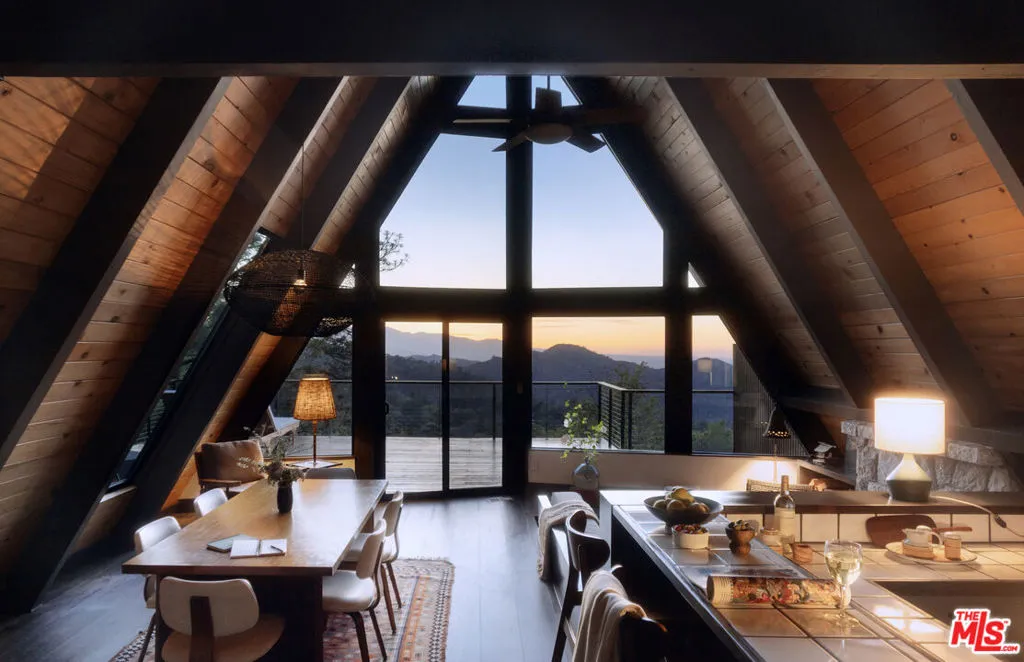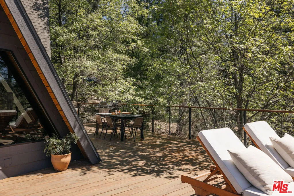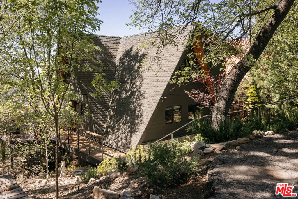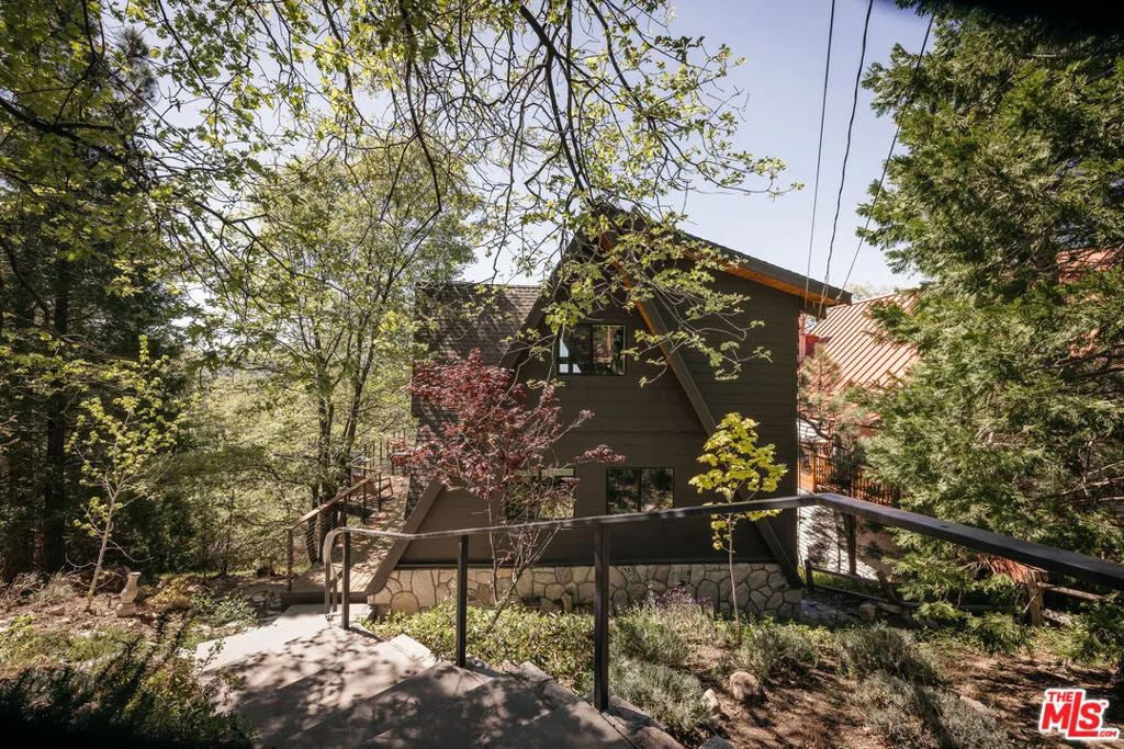 Ideal writer's retreat. Let the sweeping mountain views at 1258 Yukon Court set an inspiring tone. Perched along the edge of the San Bernardino National Forest, this rare double A-frame offers a unique blend of architectural character and natural beauty. From its elevated vantage point, the home captures remarkable sunset views, along with vistas of The Pinnacles, distant city lights, and Mount Baldy. Originally built in 1971 and thoughtfully renovated, the three-bedroom, three-bathroom residence balances timeless design with modern updates. Improvements include wide-plank flooring, energy-efficient windows, a loft primary suite with its own living room and mountain views, designer finishes, and an expansive wraparound deck with cable railing designed to preserve the spectacular surrounding outlook. Designed with creativity and tranquility in mind, the home lends itself naturally to use as a writer's or artist's retreat (screenwriters take note!). Throughout, a series of intimate nooks and light-filled spaces provide ideal settings for reflection, focus, and inspiration.The open-concept main level features a well-appointed kitchen with dark cabinetry, stainless steel appliances, and a peninsula, all positioned to take advantage of the scenery. Adjacent, the dining area comfortably accommodates an eight-seat table. The sunken living room serves as a focal point, complete with a rustic stone fireplace, built-in shelving, and custom seating, all framed by floor-to-ceiling windows, an inviting setting for quiet evenings or creative work. Two bedrooms and a fully updated bathroom with a shower-tub combination complete this level. Glass doors open to the wraparound deck, which extends along two sides of the home and provides ample space for both lounging and dining. The outdoor areas have been enhanced with new wood planks and a modern railing system, ensuring unobstructed views across the mountains and high desert, particularly striking at sunset.Upstairs, a tranquil loft with a glass balcony overlooks the surrounding treetops. This level includes an airy bedroom with a generous closet, a well-designed bathroom with a walk-in shower, and a quiet sitting area tucked into one of the A-frame peaks. A dedicated workspace with a floating desk offers direct views toward the granite formations of The Pinnacles, creating an exceptional environment for writing or study.vThe lower level, finished in warm wood tones, features a step-down lounge ideal for relaxation, along with a cozy reading nook, perfect for unwinding with a book or continuing a creative project. Sliding glass doors lead to the outdoors and a full bathroom with vintage character, a storage room and a laundry room add functionality to this level. The landscaped grounds are highlighted by a gently sloping concrete staircase with a metal railing. Situated on a quiet cul-de-sac (no through traffic), the property offers both privacy and a sense of retreat. Ownership includes lake rights, providing access to the many recreational amenities of Lake Arrowhead.