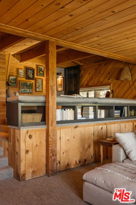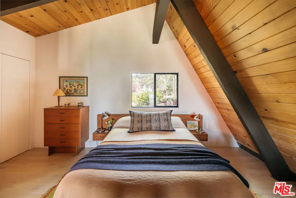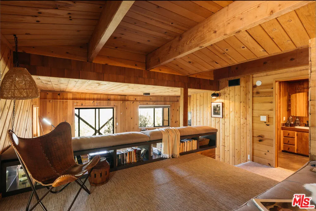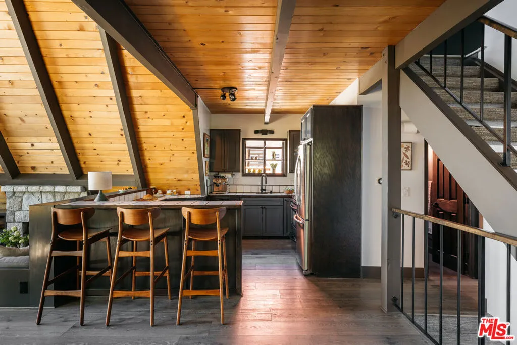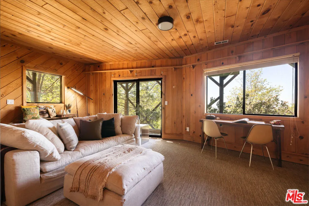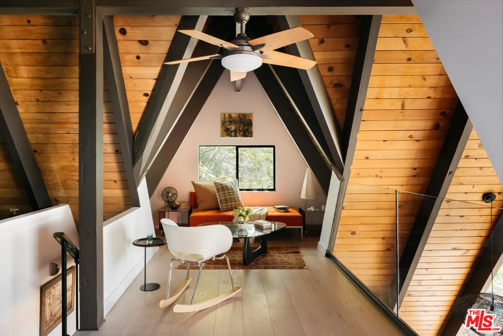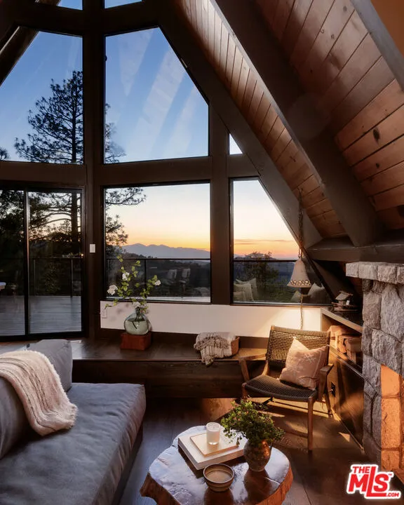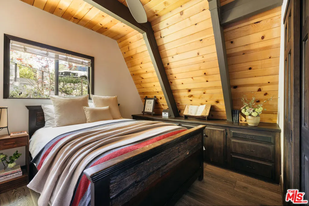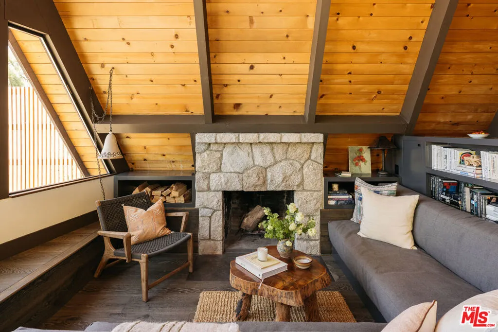 Ideal writer's retreat. Let the sweeping mountain views at 1258 Yukon Court set an inspiring tone. Perched along the edge of the San Bernardino National Forest, this rare double A-frame offers a unique blend of architectural character and natural beauty. From its elevated vantage point, the home captures remarkable sunset views, along with vistas of The Pinnacles, distant city lights, and Mount Baldy. Originally built in 1971 and thoughtfully renovated, the three-bedroom, three-bathroom residence balances timeless design with modern updates. Improvements include wide-plank flooring, energy-efficient windows, a loft primary suite with its own living room and mountain views, designer finishes, and an expansive wraparound deck with cable railing designed to preserve the spectacular surrounding outlook. Designed with creativity and tranquility in mind, the home lends itself naturally to use as a writer's or artist's retreat (screenwriters take note!). Throughout, a series of intimate nooks and light-filled spaces provide ideal settings for reflection, focus, and inspiration.The open-concept main level features a well-appointed kitchen with dark cabinetry, stainless steel appliances, and a peninsula, all positioned to take advantage of the scenery. Adjacent, the dining area comfortably accommodates an eight-seat table. The sunken living room serves as a focal point, complete with a rustic stone fireplace, built-in shelving, and custom seating, all framed by floor-to-ceiling windows, an inviting setting for quiet evenings or creative work. Two bedrooms and a fully updated bathroom with a shower-tub combination complete this level. Glass doors open to the wraparound deck, which extends along two sides of the home and provides ample space for both lounging and dining. The outdoor areas have been enhanced with new wood planks and a modern railing system, ensuring unobstructed views across the mountains and high desert, particularly striking at sunset.Upstairs, a tranquil loft with a glass balcony overlooks the surrounding treetops. This level includes an airy bedroom with a generous closet, a well-designed bathroom with a walk-in shower, and a quiet sitting area tucked into one of the A-frame peaks. A dedicated workspace with a floating desk offers direct views toward the granite formations of The Pinnacles, creating an exceptional environment for writing or study.vThe lower level, finished in warm wood tones, features a step-down lounge ideal for relaxation, along with a cozy reading nook, perfect for unwinding with a book or continuing a creative project. Sliding glass doors lead to the outdoors and a full bathroom with vintage character, a storage room and a laundry room add functionality to this level. The landscaped grounds are highlighted by a gently sloping concrete staircase with a metal railing. Situated on a quiet cul-de-sac (no through traffic), the property offers both privacy and a sense of retreat. Ownership includes lake rights, providing access to the many recreational amenities of Lake Arrowhead.