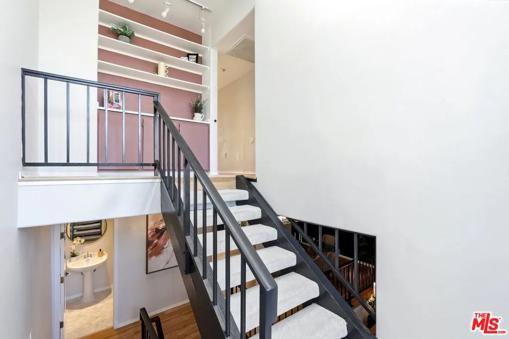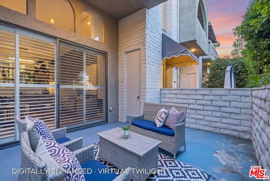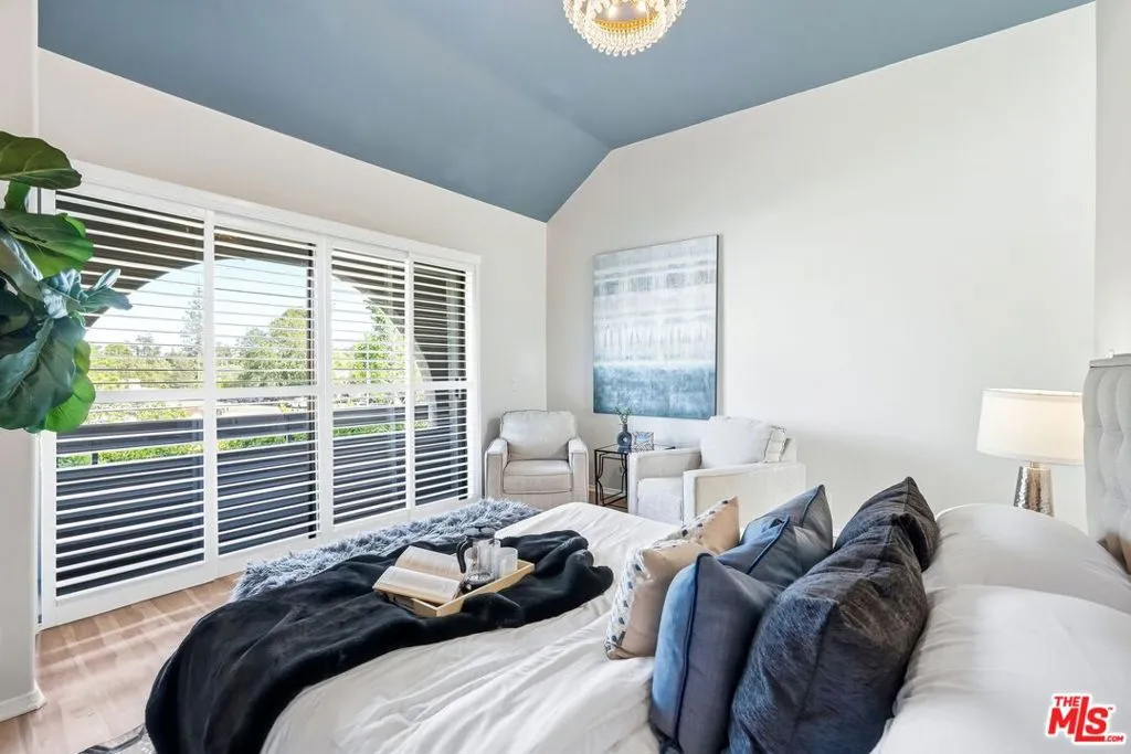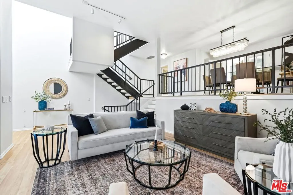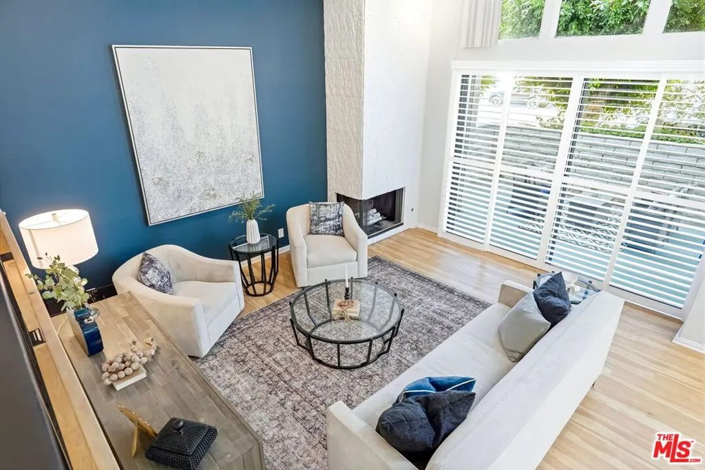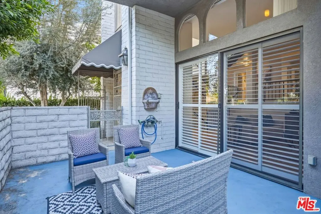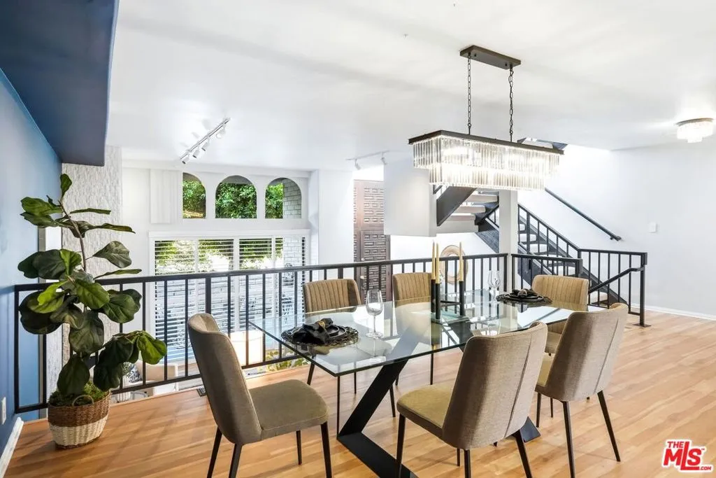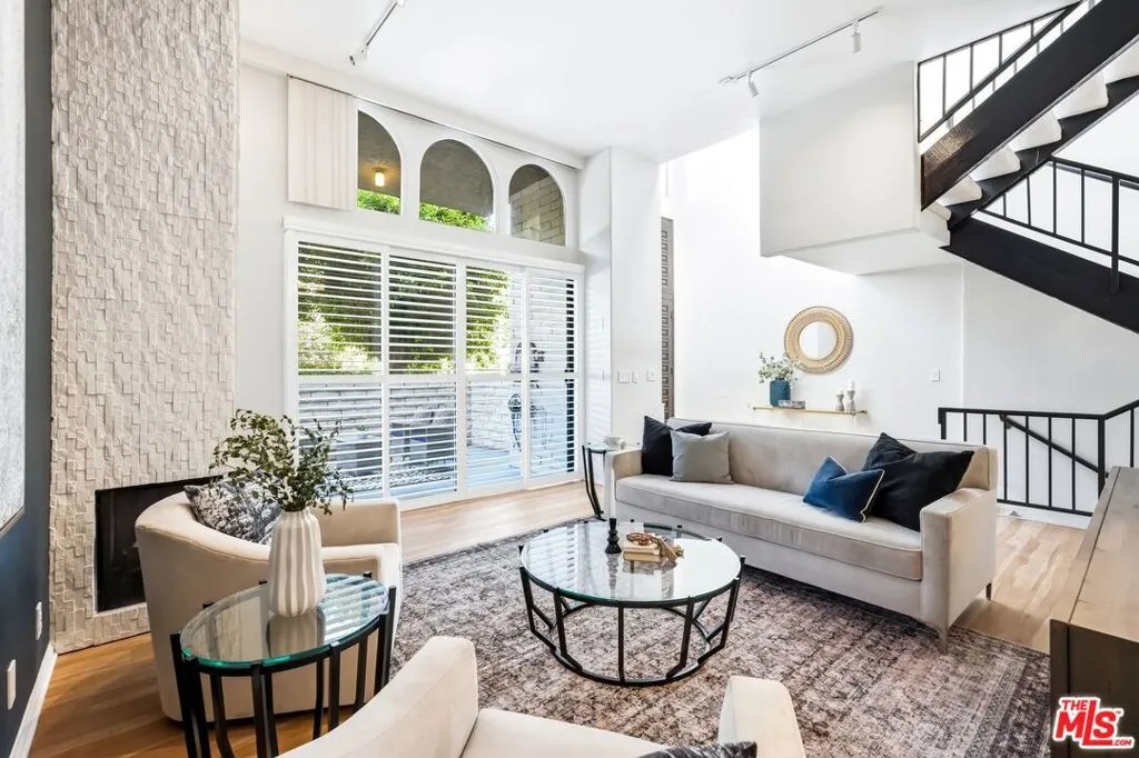 Set within a gated complex with strong architectural character, this townhouse centers on a dramatic main living space with high ceilings and a full wall of windows. A row of arched openings above brings in additional light, softening the scale of the room. The fireplace is finished in textured stone, and the open stair rises alongside it, with dark metal railings that continue through the upper level. The living room opens with ample space for multiple seating areas, centered around the fireplace and the wall of windows. Just above, the dining area sits along the edge of the space, looking down into the room below. Its position keeps it connected to the living room and works well for gatherings and entertaining. A deep blue accent wall and a suspended glass fixture give the area a clear focal point. The kitchen has been updated with painted cabinetry in a muted green, paired with brass hardware and white quartz countertops. Glass-front upper cabinets and a tall pantry wall add storage. The deep sink is set beneath a sunny window, and the layout opens to a dedicated breakfast area with a built-in bench, a natural place to sit and gather. Upstairs, the primary bedroom features a vaulted ceiling and a wide span of windows with interior shutters that bring in consistent light. The primary bath is en suite and features a long double vanity, a walk-in shower, and a separate water closet. The additional bedrooms are well-sized and bright, each with its own outlook and enough wall space to adapt over time, whether used as bedrooms, a guest room, or a workspace. Did I mention there is a secret door as well? A private patio sits just off the living room, enclosed and partially covered by an awning. It lends itself easily to outdoor dining, morning coffee, or a quiet place to sit in the evening. On the lower level, the attached garage provides direct access into the home and includes built-in storage along the back wall. The home has smart technology to control lights, HVAC, and the garage, even when you're not there. The community grounds are mature and well-maintained, with an Olympic-size pool, spa, gym, sauna, and recreation room. It's one of the many reasons why Encino Spa East is considered a desirable complex in the neighborhood. Walkable to Ventura Blvd and all its great shops and restaurants, you might stay here forever, as many residents have lived here for decades.