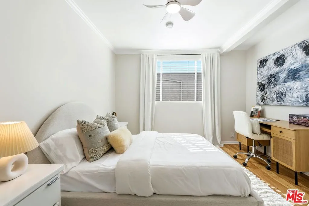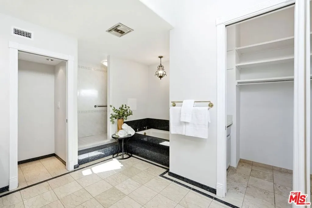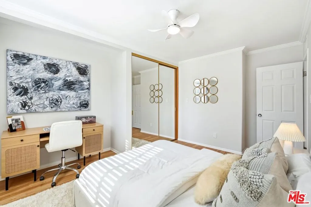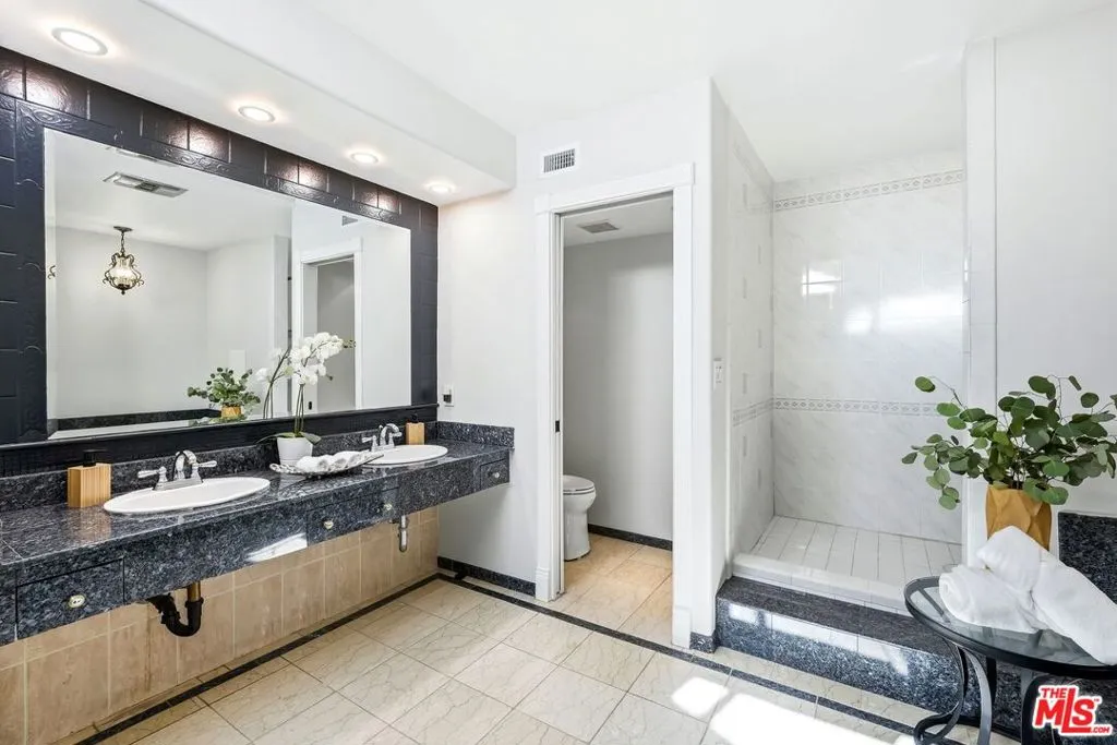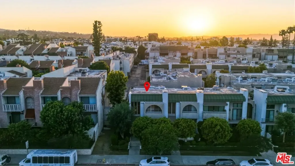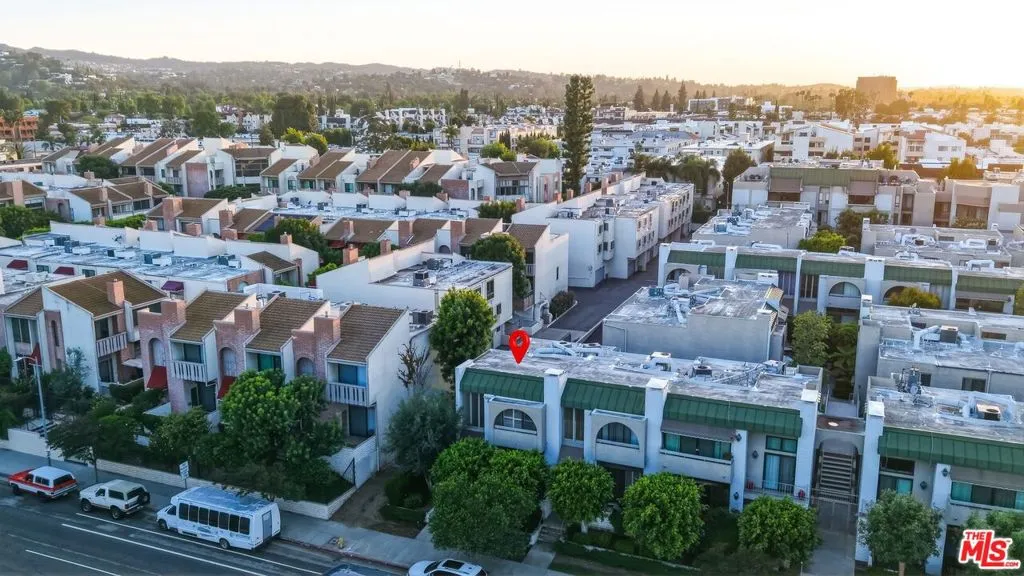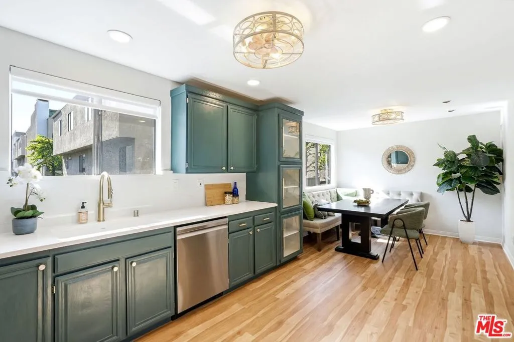 Set within a gated complex with strong architectural character, this townhouse centers on a dramatic main living space with high ceilings and a full wall of windows. A row of arched openings above brings in additional light, softening the scale of the room. The fireplace is finished in textured stone, and the open stair rises alongside it, with dark metal railings that continue through the upper level. The living room opens with ample space for multiple seating areas, centered around the fireplace and the wall of windows. Just above, the dining area sits along the edge of the space, looking down into the room below. Its position keeps it connected to the living room and works well for gatherings and entertaining. A deep blue accent wall and a suspended glass fixture give the area a clear focal point. The kitchen has been updated with painted cabinetry in a muted green, paired with brass hardware and white quartz countertops. Glass-front upper cabinets and a tall pantry wall add storage. The deep sink is set beneath a sunny window, and the layout opens to a dedicated breakfast area with a built-in bench, a natural place to sit and gather. Upstairs, the primary bedroom features a vaulted ceiling and a wide span of windows with interior shutters that bring in consistent light. The primary bath is en suite and features a long double vanity, a walk-in shower, and a separate water closet. The additional bedrooms are well-sized and bright, each with its own outlook and enough wall space to adapt over time, whether used as bedrooms, a guest room, or a workspace. Did I mention there is a secret door as well? A private patio sits just off the living room, enclosed and partially covered by an awning. It lends itself easily to outdoor dining, morning coffee, or a quiet place to sit in the evening. On the lower level, the attached garage provides direct access into the home and includes built-in storage along the back wall. The home has smart technology to control lights, HVAC, and the garage, even when you're not there. The community grounds are mature and well-maintained, with an Olympic-size pool, spa, gym, sauna, and recreation room. It's one of the many reasons why Encino Spa East is considered a desirable complex in the neighborhood. Walkable to Ventura Blvd and all its great shops and restaurants, you might stay here forever, as many residents have lived here for decades.