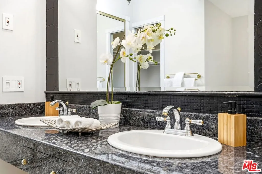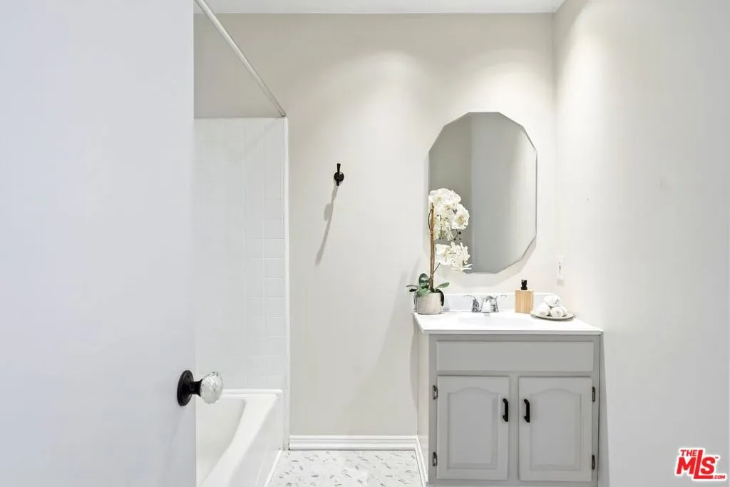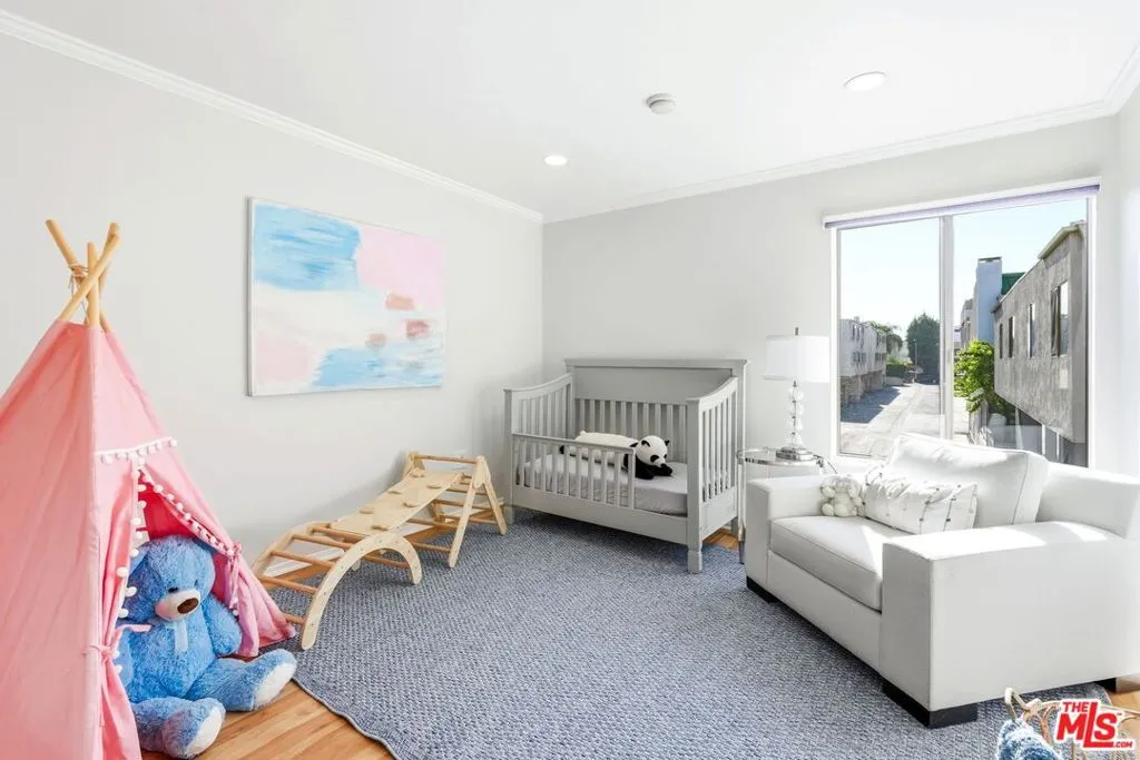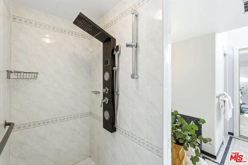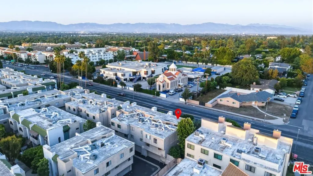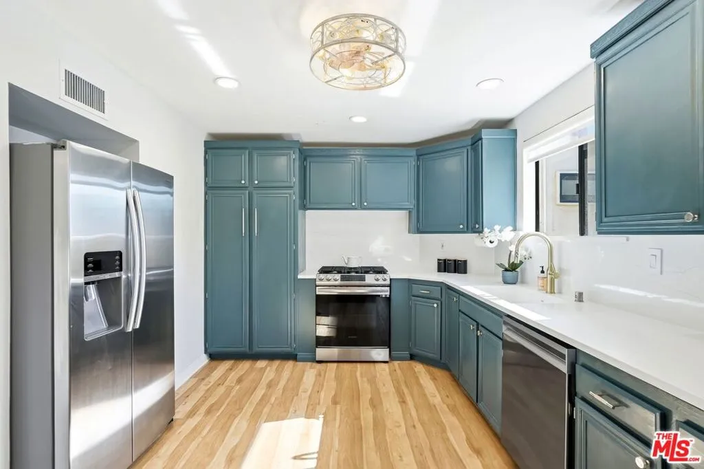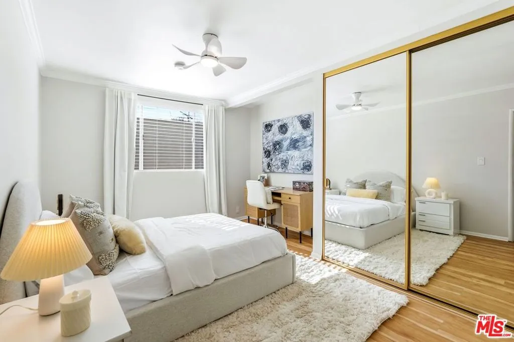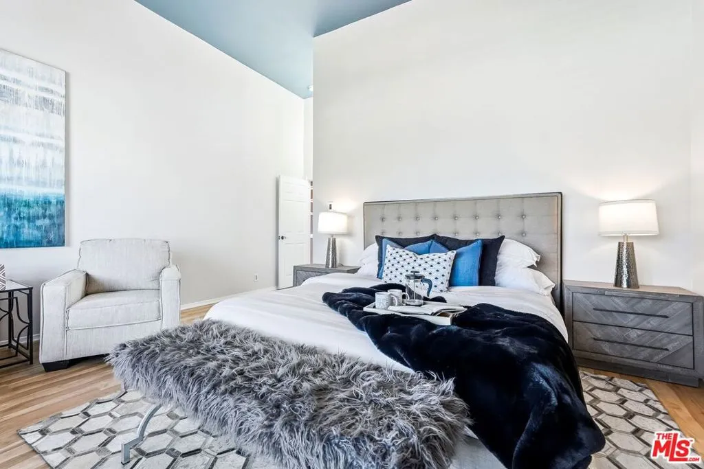 Set within a gated complex with strong architectural character, this townhouse centers on a dramatic main living space with high ceilings and a full wall of windows. A row of arched openings above brings in additional light, softening the scale of the room. The fireplace is finished in textured stone, and the open stair rises alongside it, with dark metal railings that continue through the upper level. The living room opens with ample space for multiple seating areas, centered around the fireplace and the wall of windows. Just above, the dining area sits along the edge of the space, looking down into the room below. Its position keeps it connected to the living room and works well for gatherings and entertaining. A deep blue accent wall and a suspended glass fixture give the area a clear focal point. The kitchen has been updated with painted cabinetry in a muted green, paired with brass hardware and white quartz countertops. Glass-front upper cabinets and a tall pantry wall add storage. The deep sink is set beneath a sunny window, and the layout opens to a dedicated breakfast area with a built-in bench, a natural place to sit and gather. Upstairs, the primary bedroom features a vaulted ceiling and a wide span of windows with interior shutters that bring in consistent light. The primary bath is en suite and features a long double vanity, a walk-in shower, and a separate water closet. The additional bedrooms are well-sized and bright, each with its own outlook and enough wall space to adapt over time, whether used as bedrooms, a guest room, or a workspace. Did I mention there is a secret door as well? A private patio sits just off the living room, enclosed and partially covered by an awning. It lends itself easily to outdoor dining, morning coffee, or a quiet place to sit in the evening. On the lower level, the attached garage provides direct access into the home and includes built-in storage along the back wall. The home has smart technology to control lights, HVAC, and the garage, even when you're not there. The community grounds are mature and well-maintained, with an Olympic-size pool, spa, gym, sauna, and recreation room. It's one of the many reasons why Encino Spa East is considered a desirable complex in the neighborhood. Walkable to Ventura Blvd and all its great shops and restaurants, you might stay here forever, as many residents have lived here for decades.