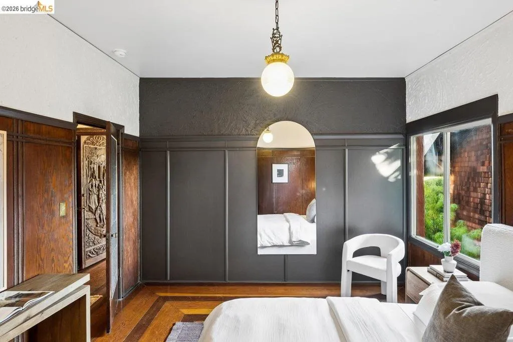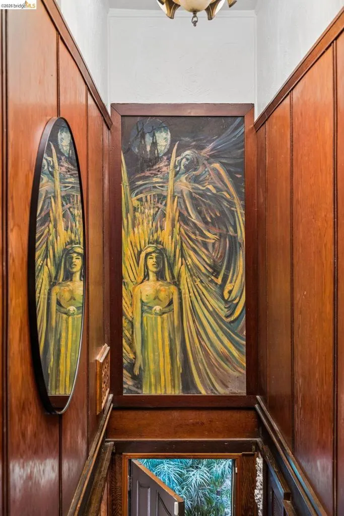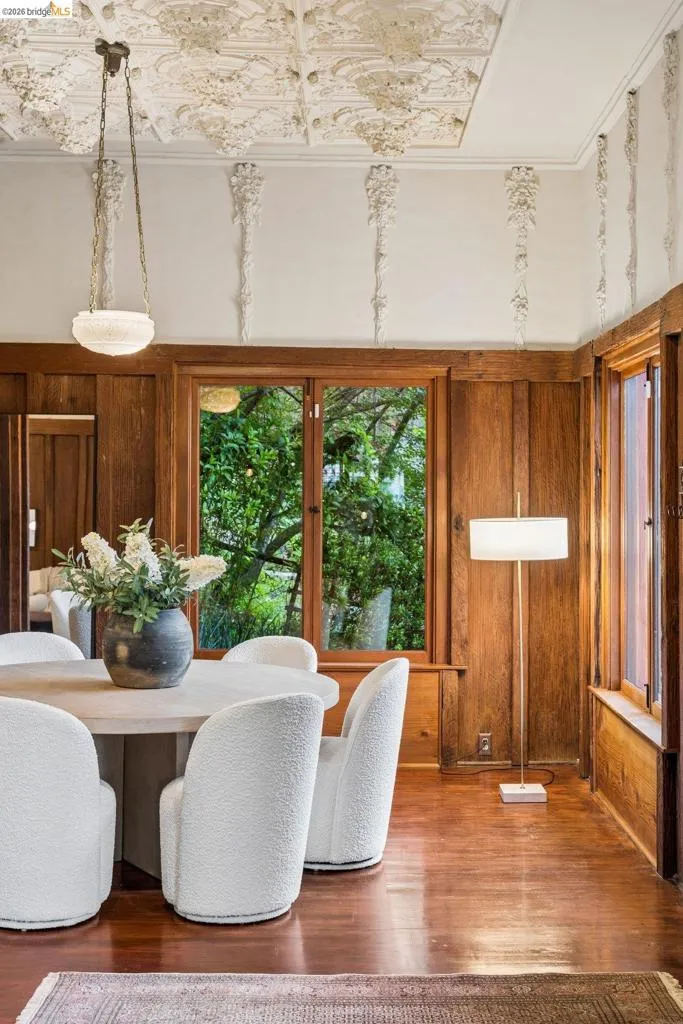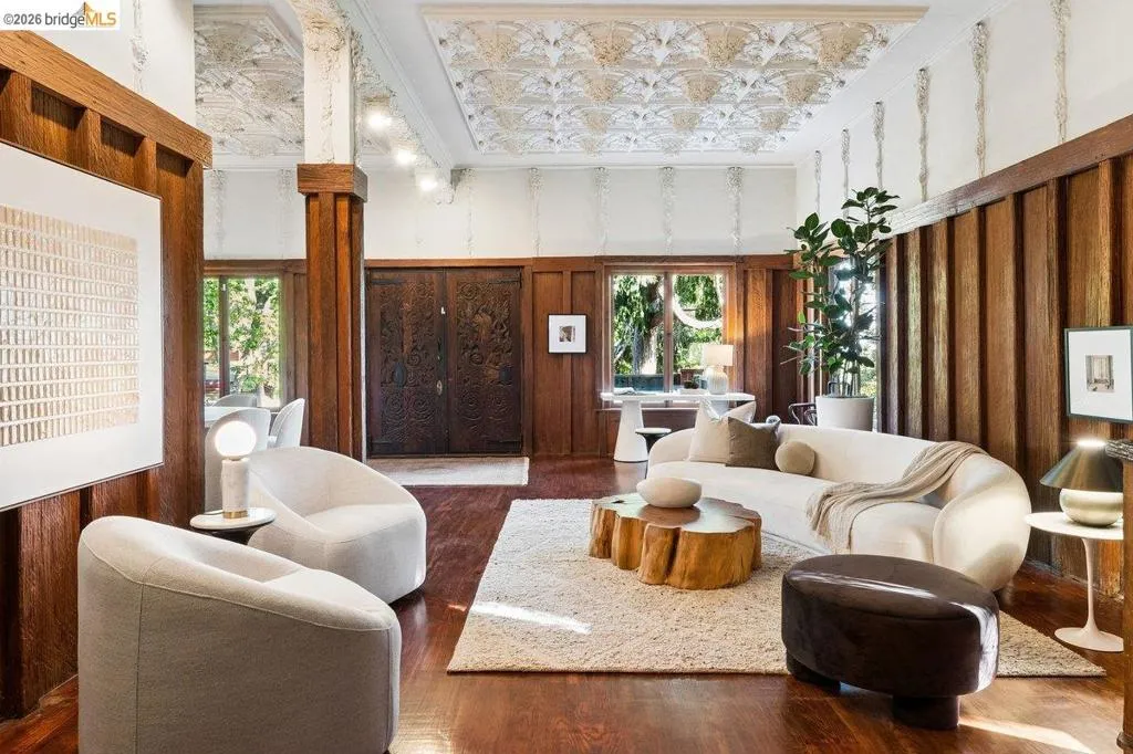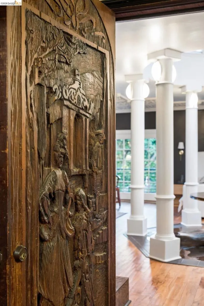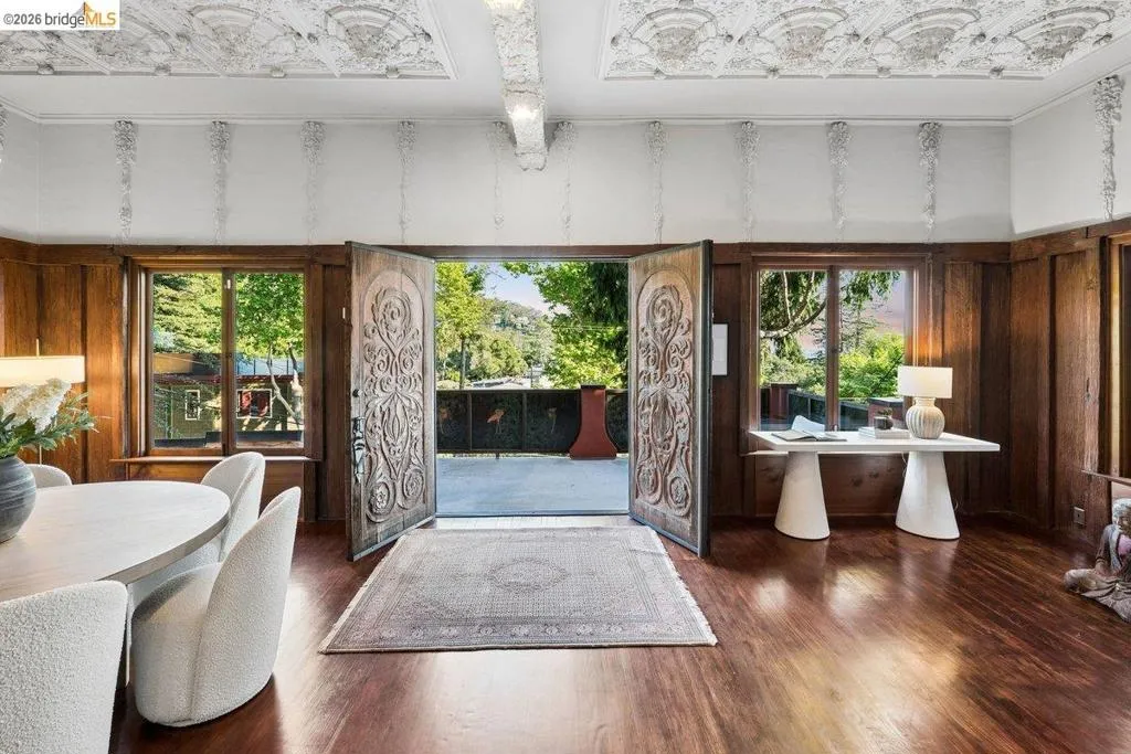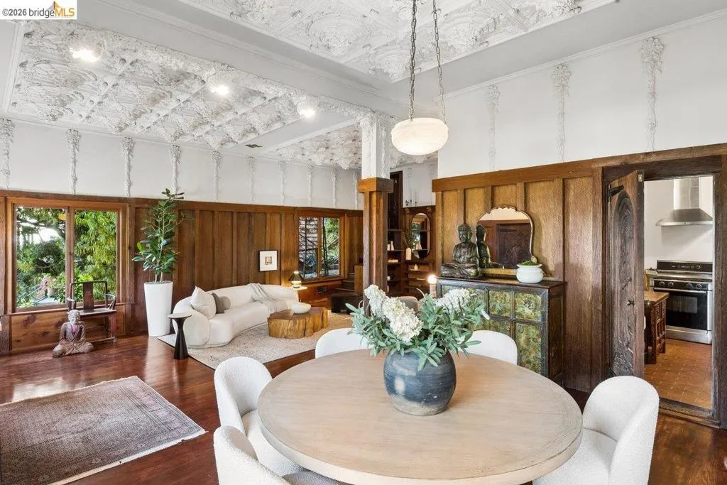 Some homes are built. Others are composed. In the early 1920s, artist-architect Paul Beygrau and his wife, Marie Rosalie Schaff, a gifted woodcarver from Alsace, arrived in Berkeley after distinguished work abroad. Trained in both fine arts and architecture, Beygrau had designed interiors for royal commissions in England and public buildings in Winnipeg. Together, they turned to a deeply personal project in the Berkeley hills, creating neighboring homes that would express their shared artistic vision. At 1049 and 1051 Keith Avenue, they produced what many regard as their collaborative masterwork - a rare expression of European artistry translated into California architecture. Featured on the front page of the San Francisco Chronicle in 1928, the home was described as “the most remarkable expression of domestic art and architecture in the Bay Region.” At 1049 Keith, artistry is present in nearly every surface. Massive hand-carved doors, reportedly shaped by Marie herself, open to interiors rich in material and craft. Inlaid hardwood floors run throughout, while the living and dining rooms unfold with grand scale, clad in solid redwood wainscoting. Overhead, decorative ceilings reflect European fresco traditions, reimagined in sculptural plaster and painted finishes. The main level is anchored by these dramatic spaces, along with a period-inspired kitchen and marble-appointed bath. Upstairs, the primary suite feels expansive - defined by a columned atrium ceiling and French doors opening to a sweeping view deck. Two additional bedrooms offer distinct character: one wrapped in warm wood for a more intimate feel, the other a larger, double-sized room with fireplace, garden access, and an ornate ceiling. Outside, the grounds cascade in a series of terraces - an upper level for dining and gathering, a middle expanse for recreation, and lower gardens with raised beds for planting. A detached apartment, tucked privately on the property, includes a lofted sleeping area and its own terrace, ideal for guests or creative use. At once architectural artifact and living home, 1049 Keith Avenue offers something rare: a place where history, artistry, and daily life meet in enduring form