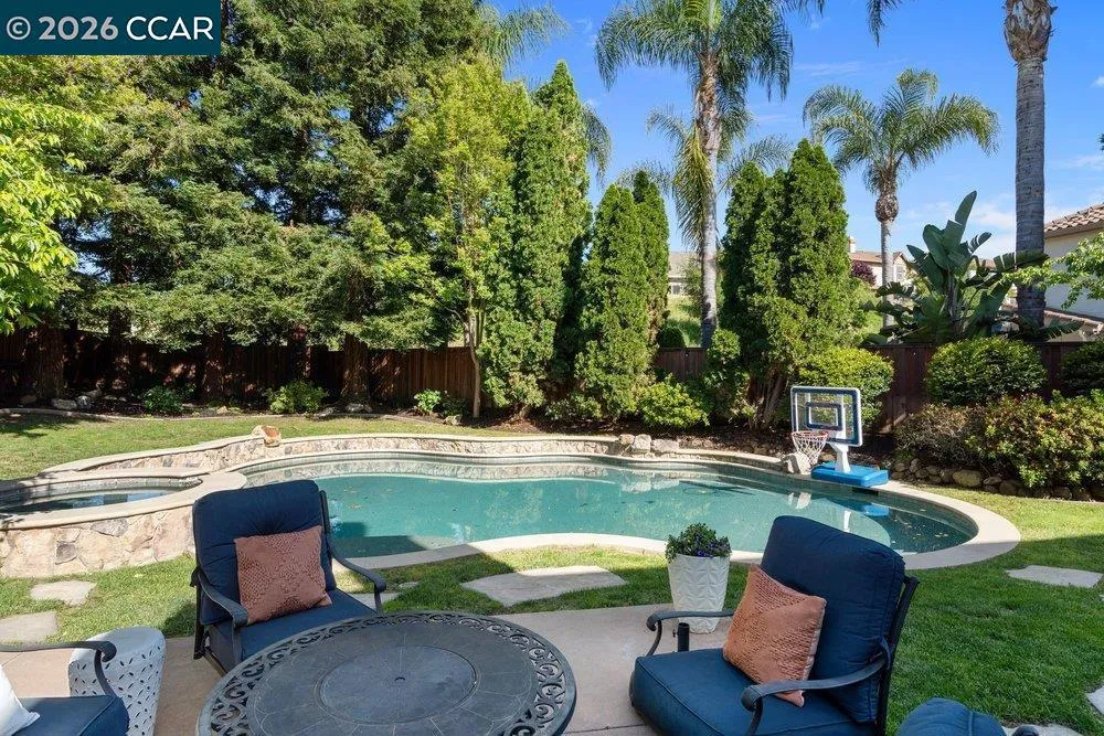 Welcome to this exquisitely updated home, perfectly positioned at the center of a private court—where timeless elegance meets modern California living. Thoughtfully reimagined with over $300,000 in recent upgrades, this stunning residence offers a seamless blend of sophisticated design, everyday comfort, and effortless indoor-outdoor living—all in a truly prime location. Step inside to a grand entry with soaring ceilings, creating an immediate sense of warmth, natural light, and openness. At the heart of the home, the designer kitchen is both striking and highly functional—featuring an expansive porcelain island, custom white cabinetry, high-end Thermador appliances, and chic brass accents. Bathed in natural light and seamlessly connected to the living and dining areas, this space is perfectly designed for both intimate gatherings and lively entertaining. A desirable main-level bedroom and full bath provide the ideal setup for guests, extended family, or a private home office. Upstairs, a beautifully crafted wrought iron staircase leads to a spacious landing complete with a built-in workspace—perfect for today’s flexible lifestyle. The luxurious primary suite is a true retreat, showcasing a spa-inspired bathroom with a soaking tub, walk-in shower, dual vanities, and a generous walk-in closet. Additional bedrooms are bright, inviting, and thoughtfully updated, while a conveniently located upstairs laundry room adds ease to everyday living. Step outside to your own private backyard oasis—complete with a sparkling pool, lush landscaping, & multiple areas for lounging and entertaining—creating the ultimate setting for enjoying warm California days and unforgettable evenings. Additional highlights include beautifully updated bathrooms, designer lighting, owned solar, surround sound, crown molding, fresh interior & exterior paint, modern finishes throughout, an EV charger, new exterior access, and a thoughtfully designed open floor plan. Ideally located in a highly desirable neighborhood—just moments from top-rated schools, parks, shopping, & dining—this exceptional home offers it all!