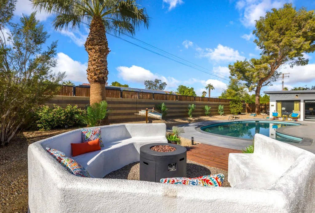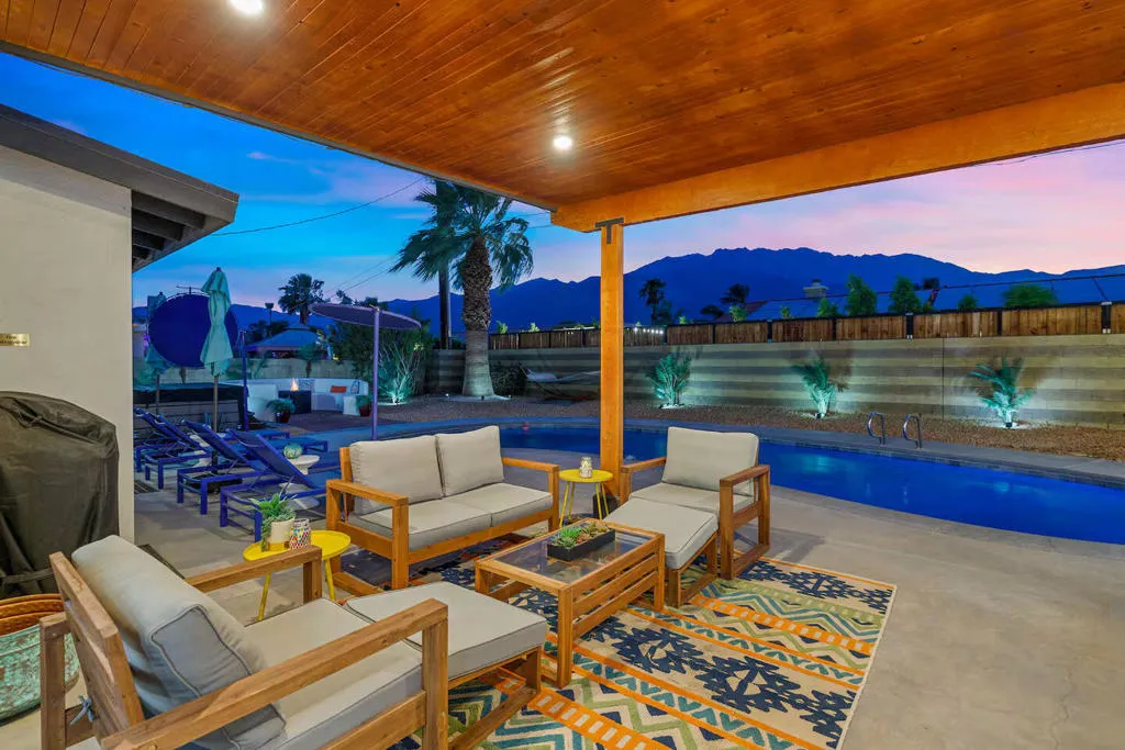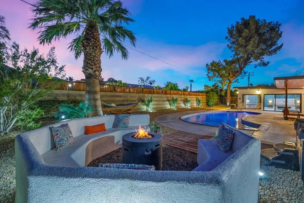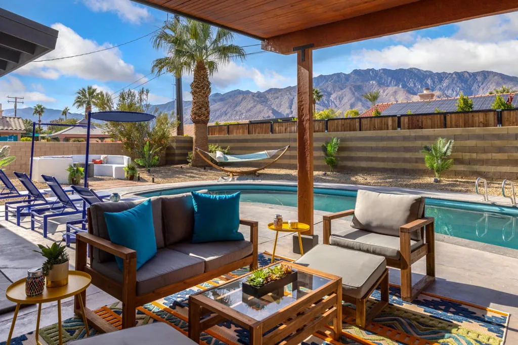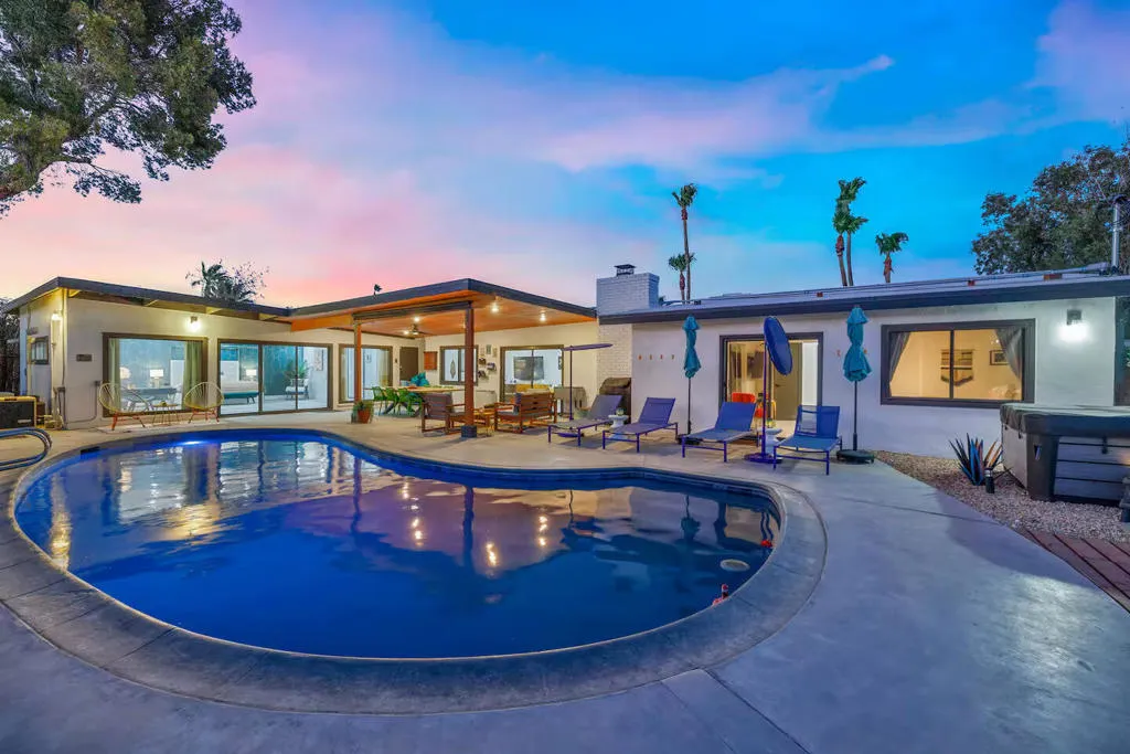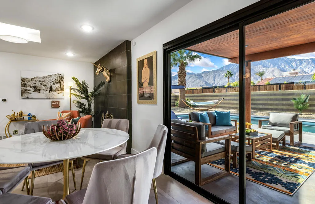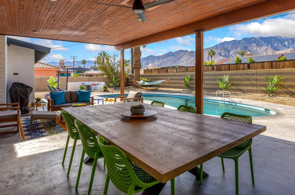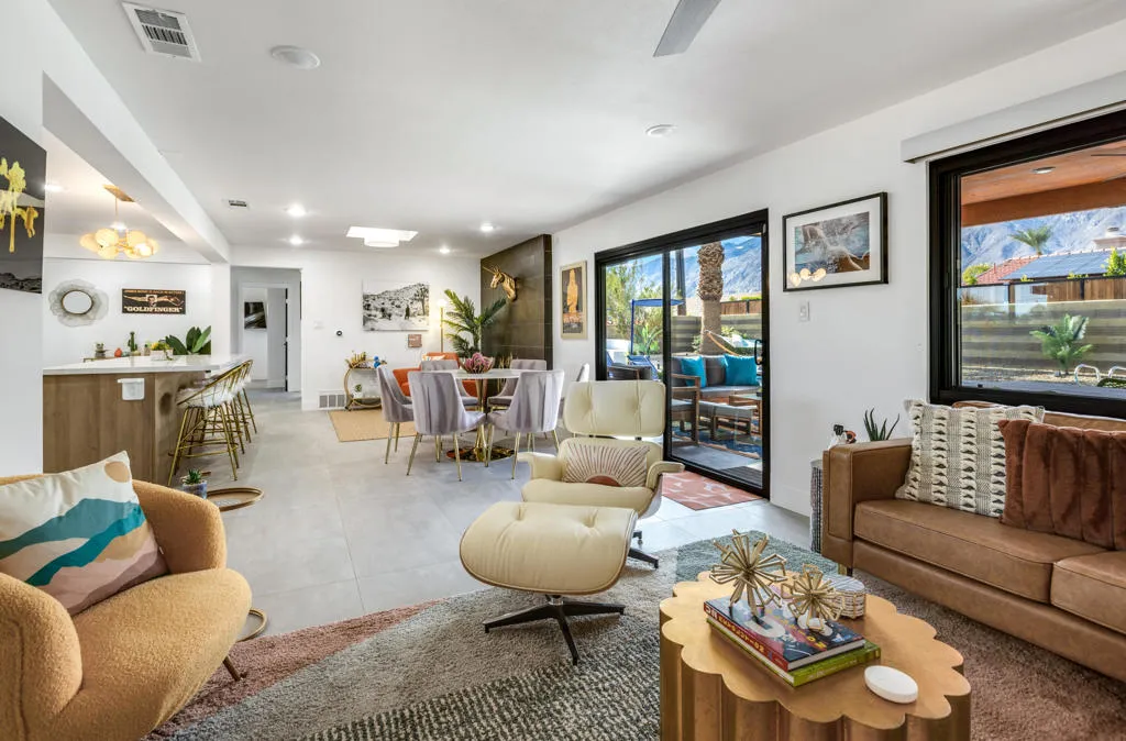 Extensively renovated inside and out in 2022, showcasing meticulous attention to every detail, (including an updated roof), this stunning 3 bedroom, 3 bath Palm Springs home delivers the ultimate desert lifestyle. Thoughtfully redesigned with a clean, modern aesthetic, the open concept layout is anchored by a true chef's kitchen, the heart of the home, featuring a large center island, gas range, stainless steel appliances, and beautiful large profile ceramic tile flooring that flows seamlessly throughout the home. The expansive primary suite is a private retreat, offering direct access to the sparkling pool and spa, along with breathtaking west facing mountain views. The luxurious en suite bath is beautifully appointed with double sinks, an elegant oversized walk in shower, and a generous walk in closet. Two additional guest bedrooms are stylish and inviting, complemented by a beautifully remodeled bath with a tub, while a separate hall bath showcases elegant penny tile and a sleek walk in shower, which is perfect for guests.Step outside to your own resort like oasis, complete with low maintenance desert landscaping, a kidney shaped pool and spa, fire pit, and ample space to relax or entertain, all set against incredible mountain backdrops.Recent upgrades include an updated electrical panel, custom room darkening shades, and an updated pool heater and filter. Additional highlights include an attached two car garage and in home laundry. Ideally located on land you own, close to downtown Palm Springs, shopping, dining, the casino, and entertainment are just minutes away! Whether you're searching for a full-time residence, a desert retreat, or an investment property, this home offers the perfect blend of style, comfort, and flexibility.