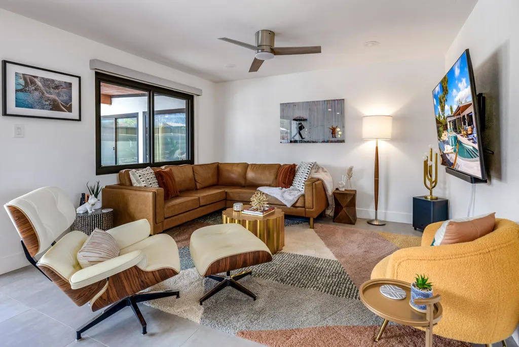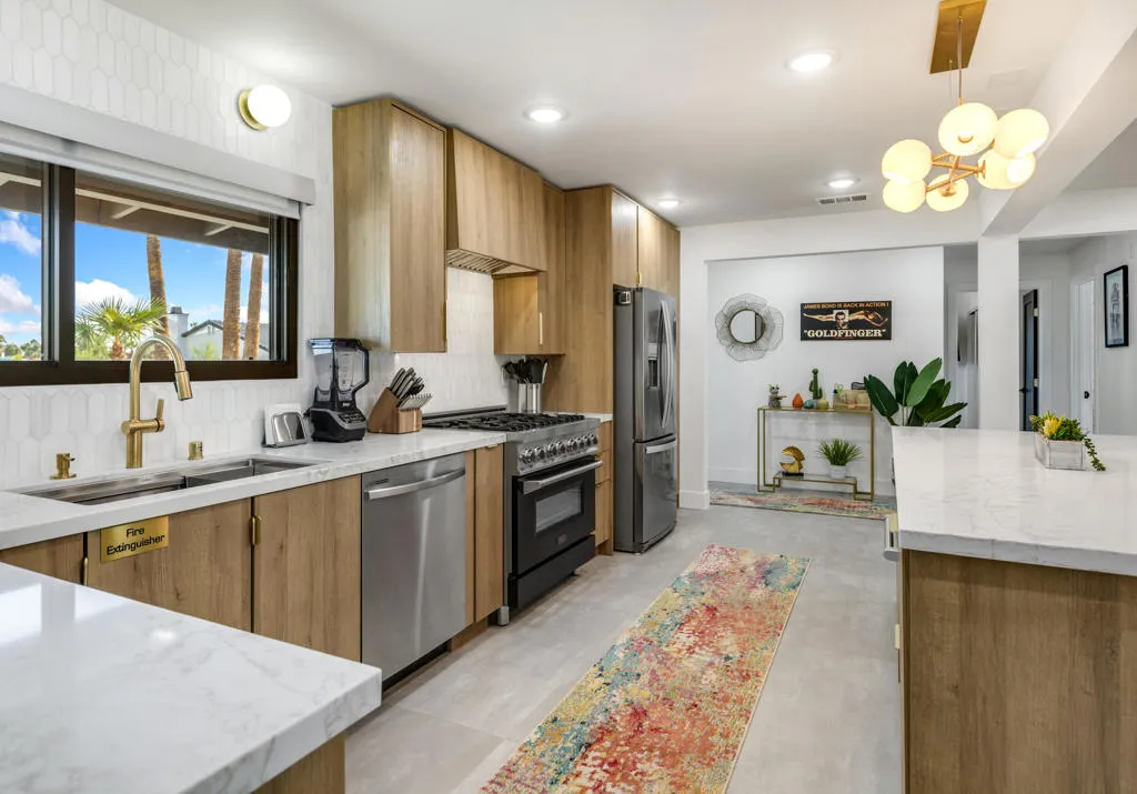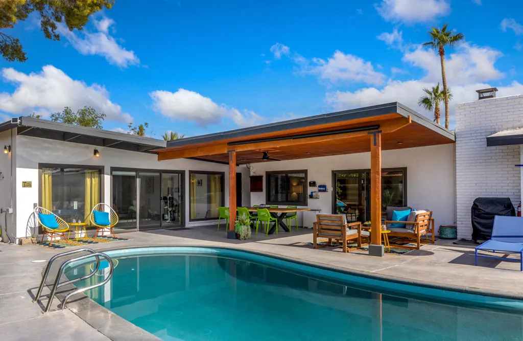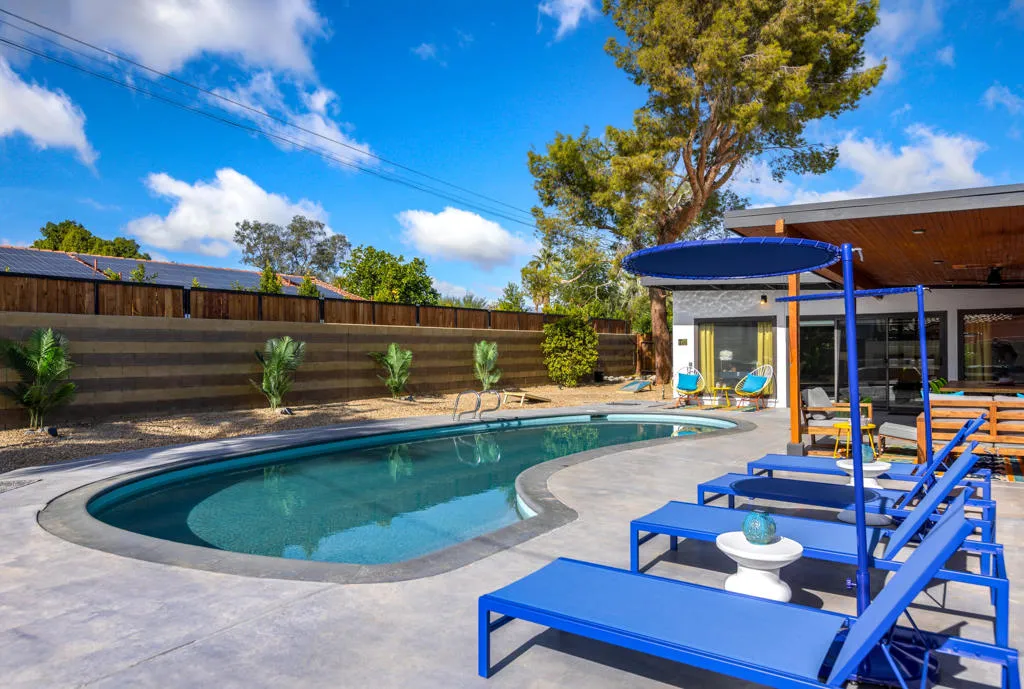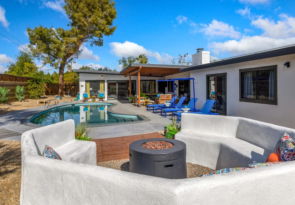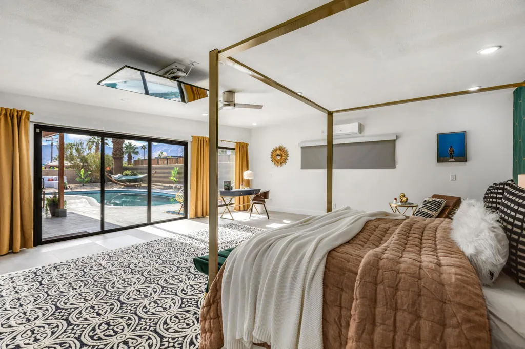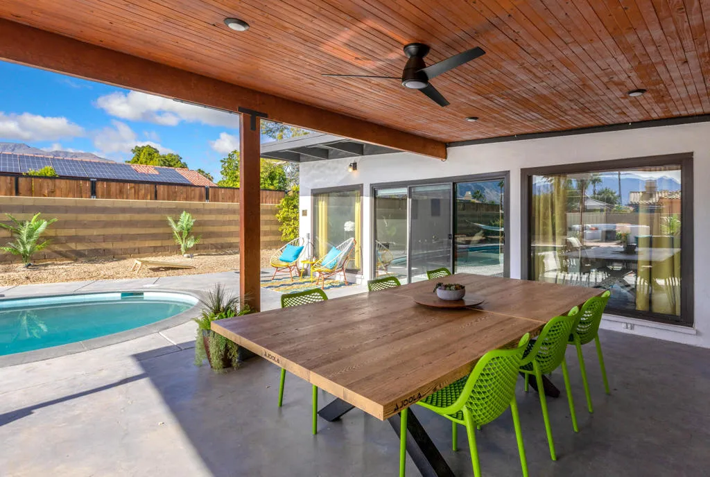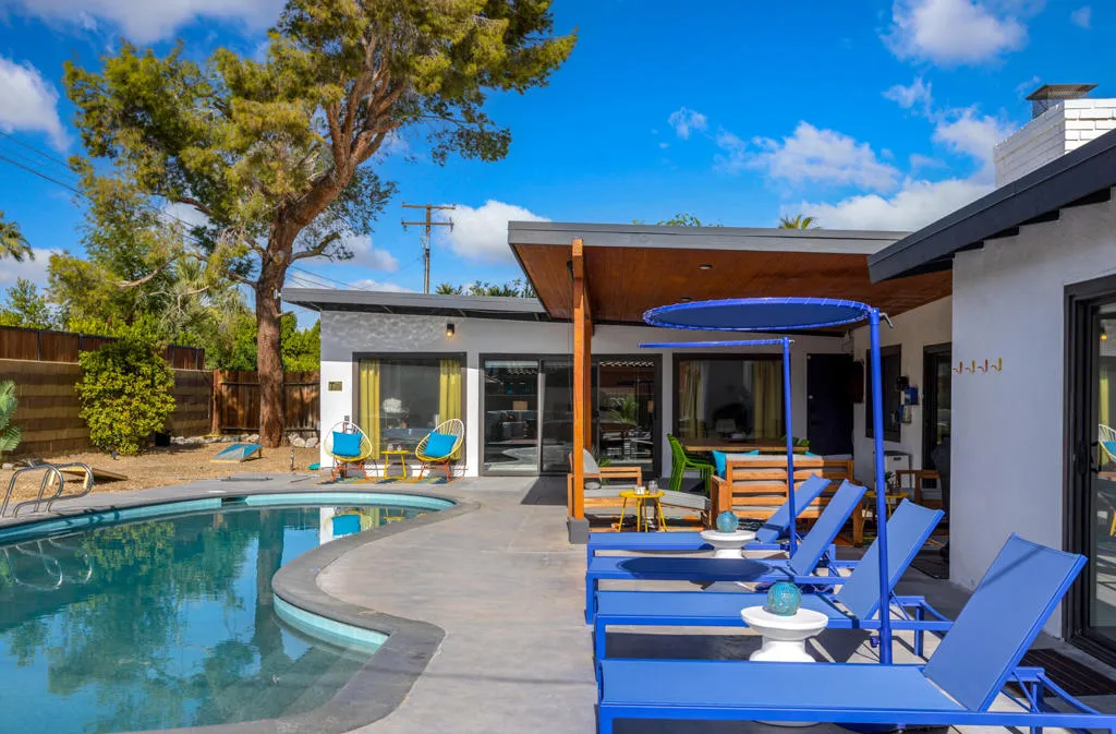 Extensively renovated inside and out in 2022, showcasing meticulous attention to every detail, (including an updated roof), this stunning 3 bedroom, 3 bath Palm Springs home delivers the ultimate desert lifestyle. Thoughtfully redesigned with a clean, modern aesthetic, the open concept layout is anchored by a true chef's kitchen, the heart of the home, featuring a large center island, gas range, stainless steel appliances, and beautiful large profile ceramic tile flooring that flows seamlessly throughout the home. The expansive primary suite is a private retreat, offering direct access to the sparkling pool and spa, along with breathtaking west facing mountain views. The luxurious en suite bath is beautifully appointed with double sinks, an elegant oversized walk in shower, and a generous walk in closet. Two additional guest bedrooms are stylish and inviting, complemented by a beautifully remodeled bath with a tub, while a separate hall bath showcases elegant penny tile and a sleek walk in shower, which is perfect for guests.Step outside to your own resort like oasis, complete with low maintenance desert landscaping, a kidney shaped pool and spa, fire pit, and ample space to relax or entertain, all set against incredible mountain backdrops.Recent upgrades include an updated electrical panel, custom room darkening shades, and an updated pool heater and filter. Additional highlights include an attached two car garage and in home laundry. Ideally located on land you own, close to downtown Palm Springs, shopping, dining, the casino, and entertainment are just minutes away! Whether you're searching for a full-time residence, a desert retreat, or an investment property, this home offers the perfect blend of style, comfort, and flexibility.