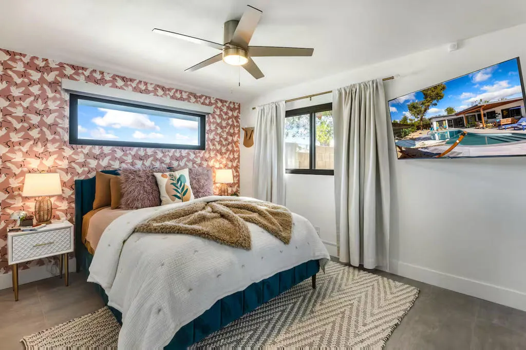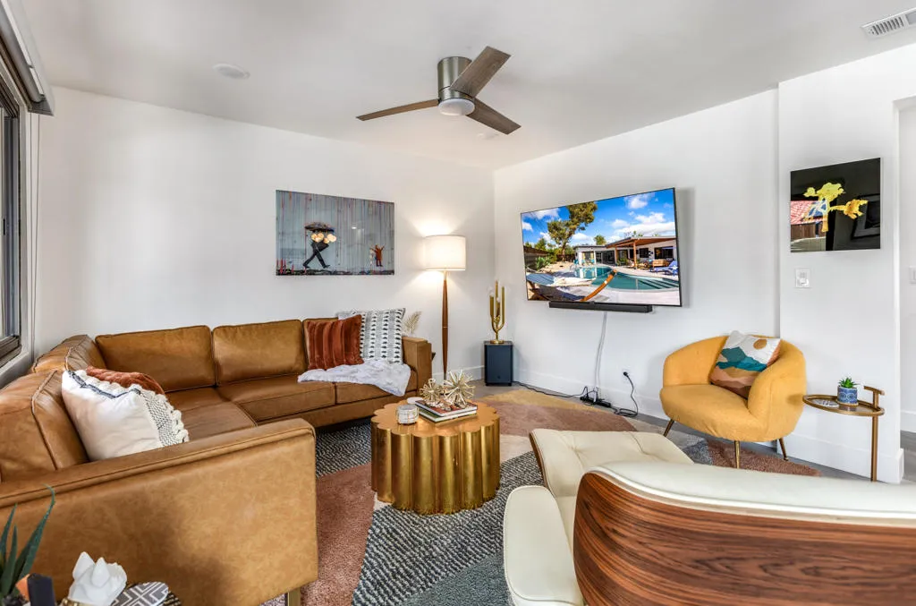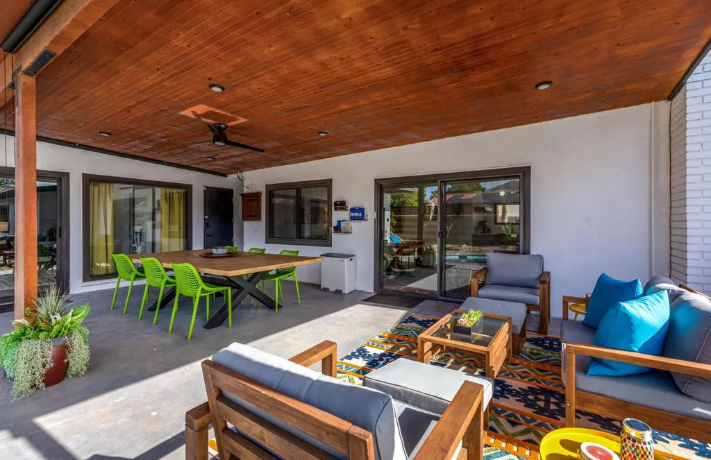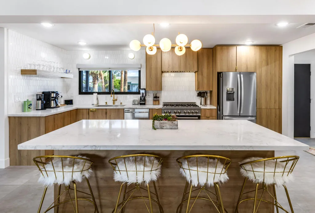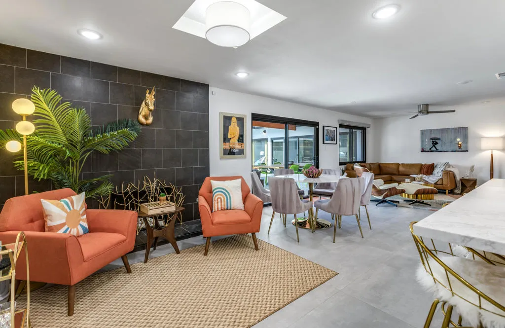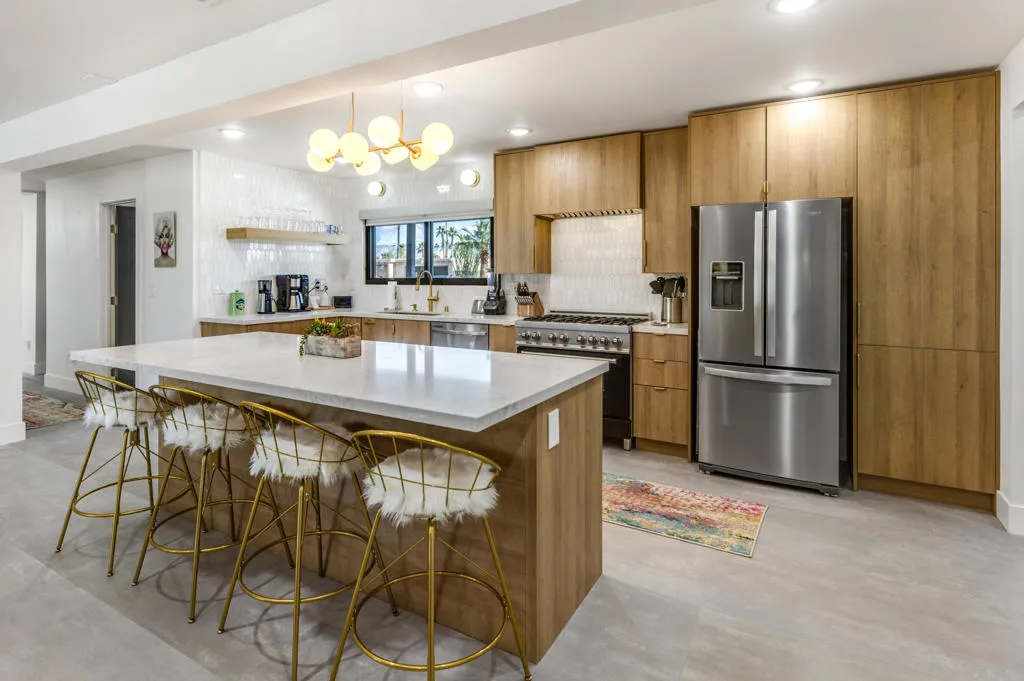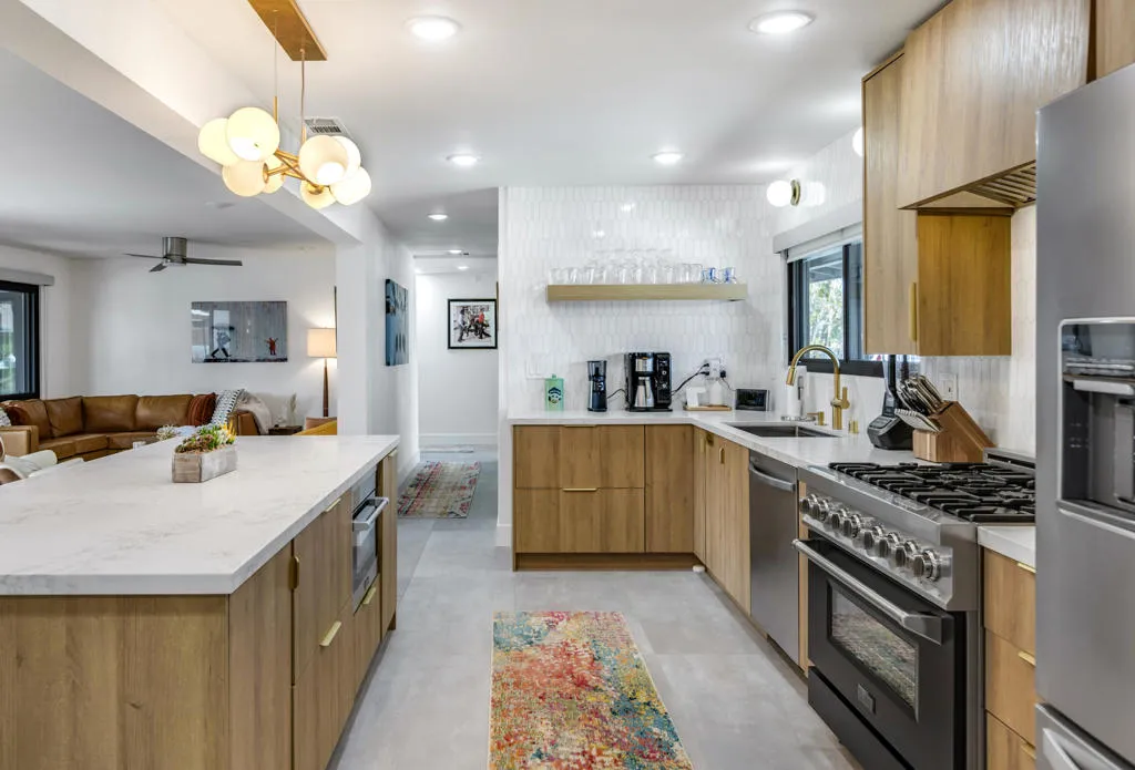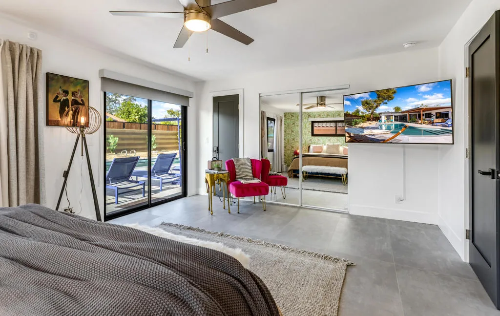 Extensively renovated inside and out in 2022, showcasing meticulous attention to every detail, (including an updated roof), this stunning 3 bedroom, 3 bath Palm Springs home delivers the ultimate desert lifestyle. Thoughtfully redesigned with a clean, modern aesthetic, the open concept layout is anchored by a true chef's kitchen, the heart of the home, featuring a large center island, gas range, stainless steel appliances, and beautiful large profile ceramic tile flooring that flows seamlessly throughout the home. The expansive primary suite is a private retreat, offering direct access to the sparkling pool and spa, along with breathtaking west facing mountain views. The luxurious en suite bath is beautifully appointed with double sinks, an elegant oversized walk in shower, and a generous walk in closet. Two additional guest bedrooms are stylish and inviting, complemented by a beautifully remodeled bath with a tub, while a separate hall bath showcases elegant penny tile and a sleek walk in shower, which is perfect for guests.Step outside to your own resort like oasis, complete with low maintenance desert landscaping, a kidney shaped pool and spa, fire pit, and ample space to relax or entertain, all set against incredible mountain backdrops.Recent upgrades include an updated electrical panel, custom room darkening shades, and an updated pool heater and filter. Additional highlights include an attached two car garage and in home laundry. Ideally located on land you own, close to downtown Palm Springs, shopping, dining, the casino, and entertainment are just minutes away! Whether you're searching for a full-time residence, a desert retreat, or an investment property, this home offers the perfect blend of style, comfort, and flexibility.