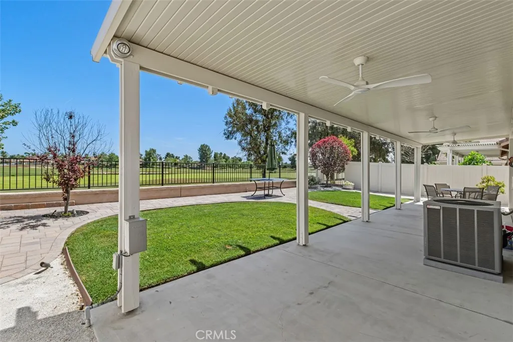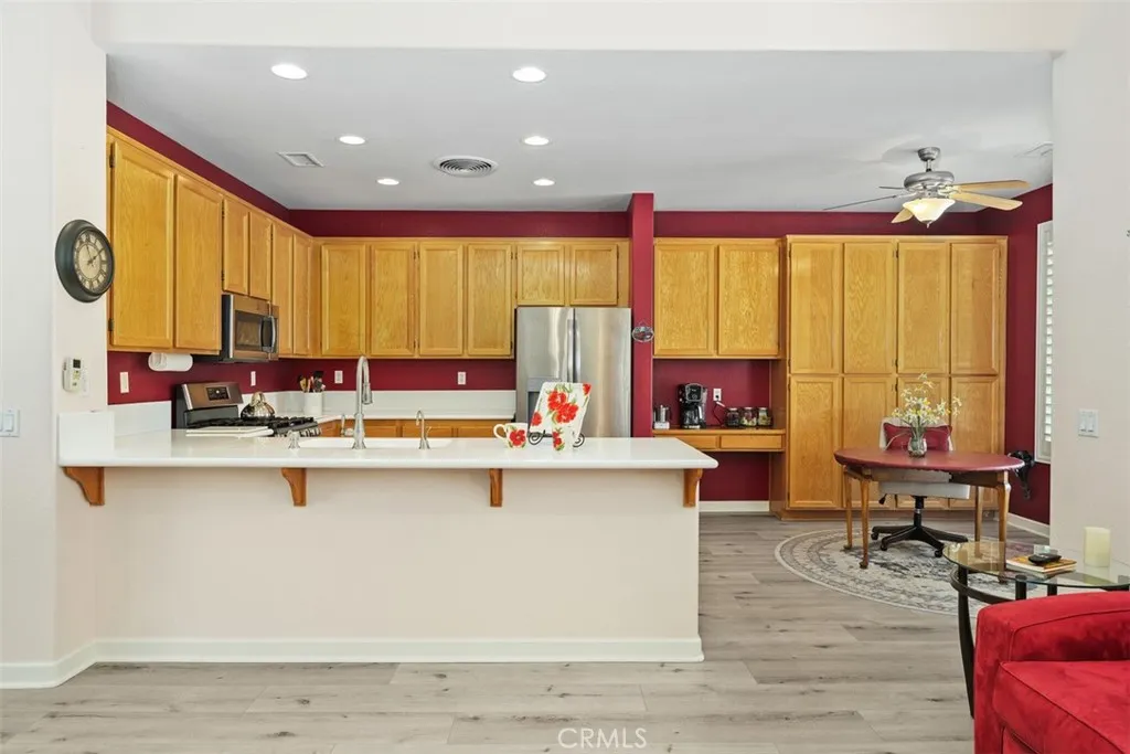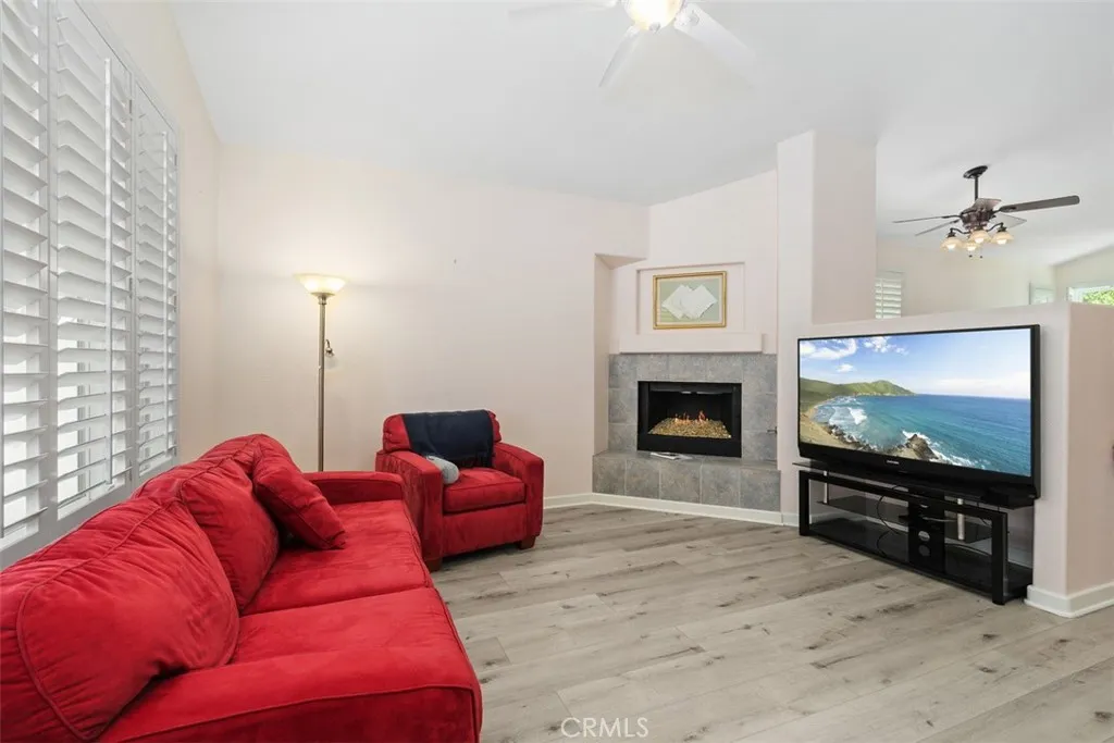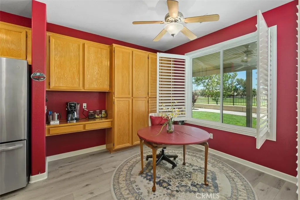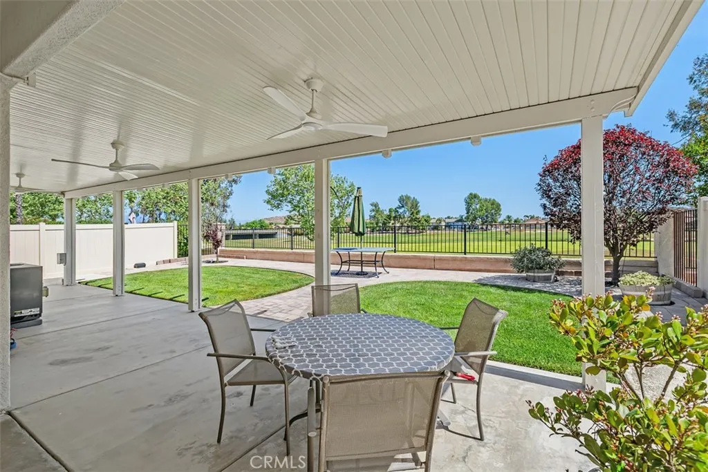 Beautiful Golf Course & Lake View Home in the 55+ Gate Guarded Community of the OASIS! Rare front porch entry area leading into this Fabulous Floor Plan. Luxury Vinyl Plank Flooring through out, Plantation Shutters & Custom Fans! Separate Living Room and Dining Area. Also featuring a Super size kitchen with all Stainless appliances, cozy nook and long breakfast bar seating! Tons of counter space and storage opening to the Family Room with a Raised Hearth Custom Fireplace! Primary Suite has a full walk in closet with custom built in's as well as a full length Custom Built in Cabintry & Drawers on the South wall of the Primary Bedroom. Guest bedroom with walk in closet with built in storage as well. Third bedroom with double door entry is being used as an office conveniently located in the front of the home. Fantastic garage with built in storage and work bench! INCREDIBLE rear yard with full length Alumawood covered patio ( 3 Custom fan's timer & elec), double grass area with professional hardscape & landscape. Stunning Views of the Golf Course and the Lake. Cul de sac location with easy access to rear gate egress & ingress of the Community! HOA covers front yard water and landscape care as well as the trash service. Minutes from shopping, restaurants, medical and easy freeway access. Approx an hour from popular So Cal Beaches, Mountain and Desert locations. A short drive to the Famous Temecula Valley Wine Country. Come enjoy the RESORT Style Living and enjoy all the Clubs and events featuring a 22,000 sq ft Clubhouse ( Amenities listed!) LOW taxes ( no mello-roos) INDREDIBLE Opportunity!