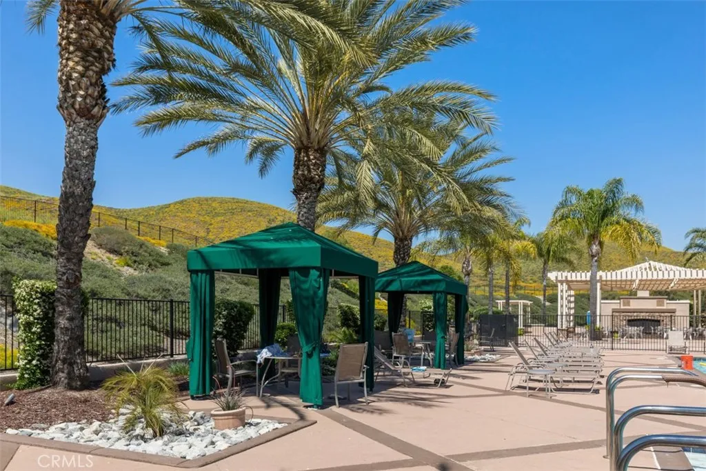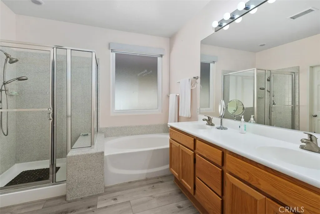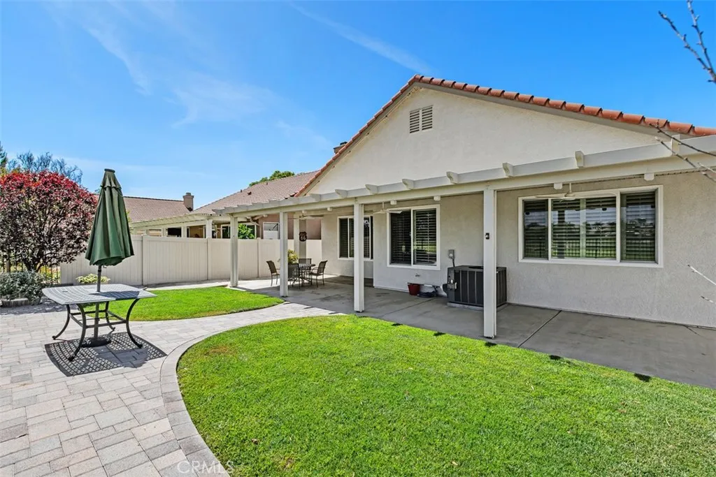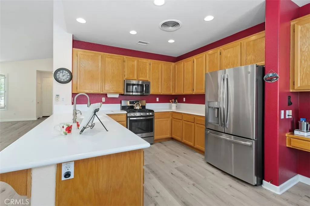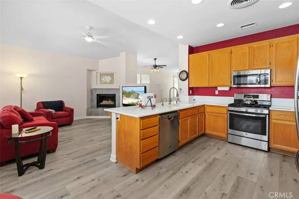 Beautiful Golf Course & Lake View Home in the 55+ Gate Guarded Community of the OASIS! Rare front porch entry area leading into this Fabulous Floor Plan. Luxury Vinyl Plank Flooring through out, Plantation Shutters & Custom Fans! Separate Living Room and Dining Area. Also featuring a Super size kitchen with all Stainless appliances, cozy nook and long breakfast bar seating! Tons of counter space and storage opening to the Family Room with a Raised Hearth Custom Fireplace! Primary Suite has a full walk in closet with custom built in's as well as a full length Custom Built in Cabintry & Drawers on the South wall of the Primary Bedroom. Guest bedroom with walk in closet with built in storage as well. Third bedroom with double door entry is being used as an office conveniently located in the front of the home. Fantastic garage with built in storage and work bench! INCREDIBLE rear yard with full length Alumawood covered patio ( 3 Custom fan's timer & elec), double grass area with professional hardscape & landscape. Stunning Views of the Golf Course and the Lake. Cul de sac location with easy access to rear gate egress & ingress of the Community! HOA covers front yard water and landscape care as well as the trash service. Minutes from shopping, restaurants, medical and easy freeway access. Approx an hour from popular So Cal Beaches, Mountain and Desert locations. A short drive to the Famous Temecula Valley Wine Country. Come enjoy the RESORT Style Living and enjoy all the Clubs and events featuring a 22,000 sq ft Clubhouse ( Amenities listed!) LOW taxes ( no mello-roos) INDREDIBLE Opportunity!