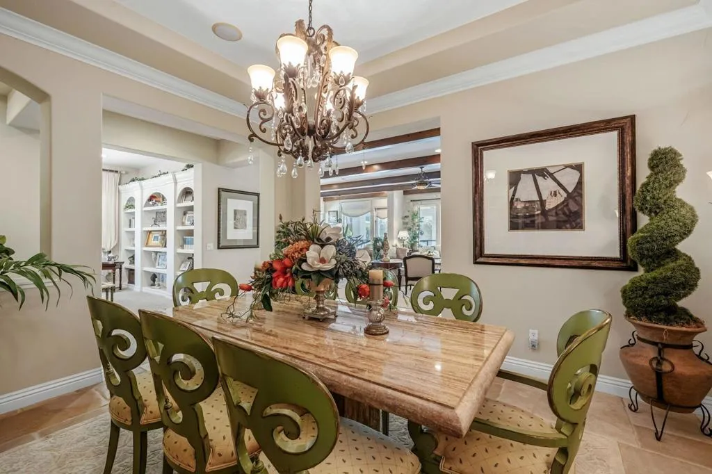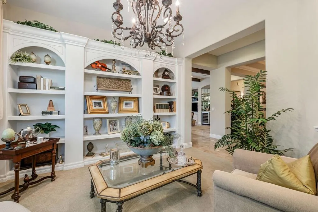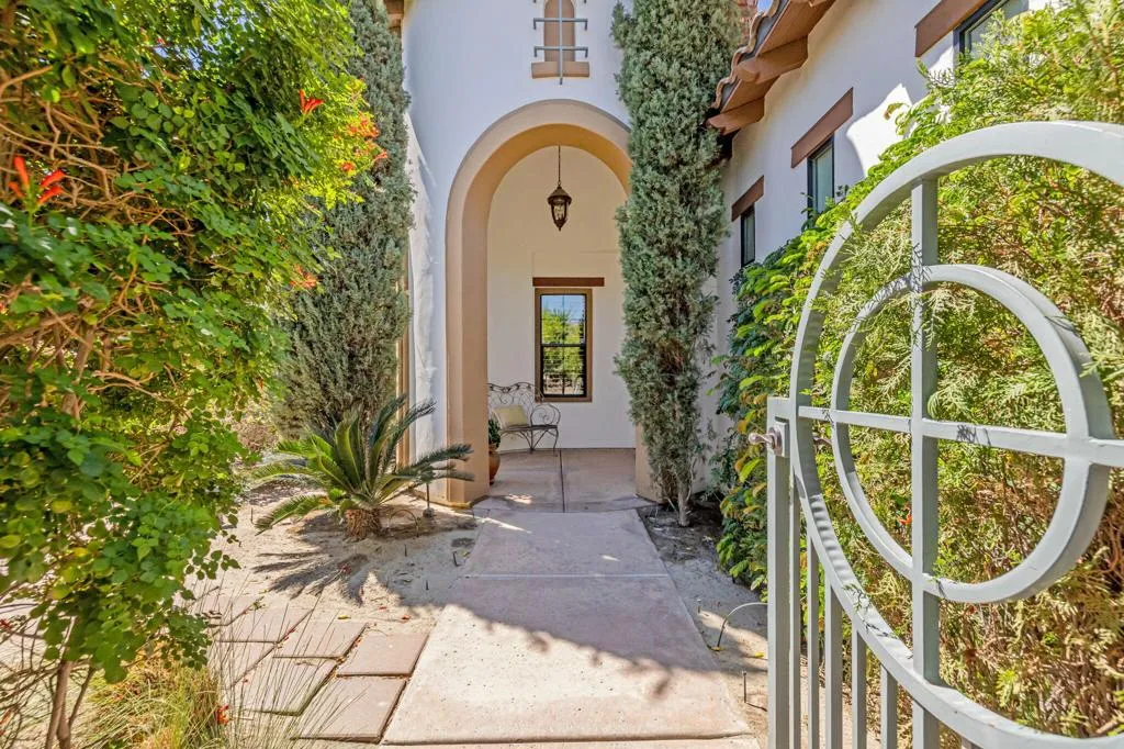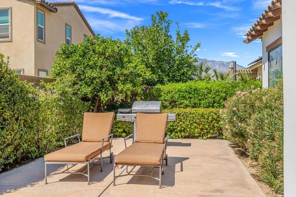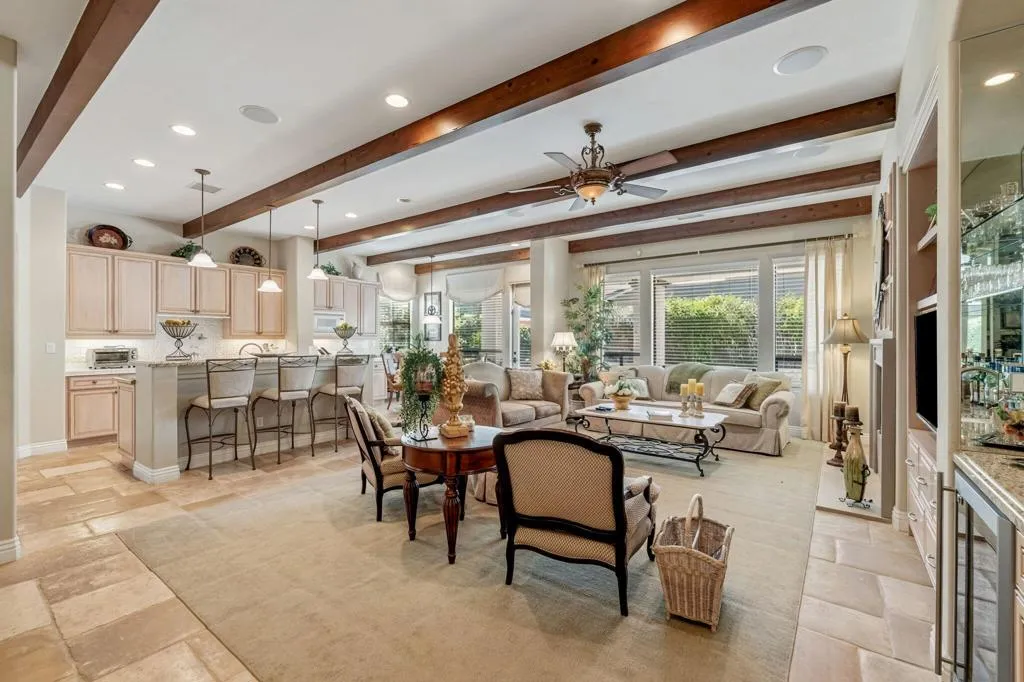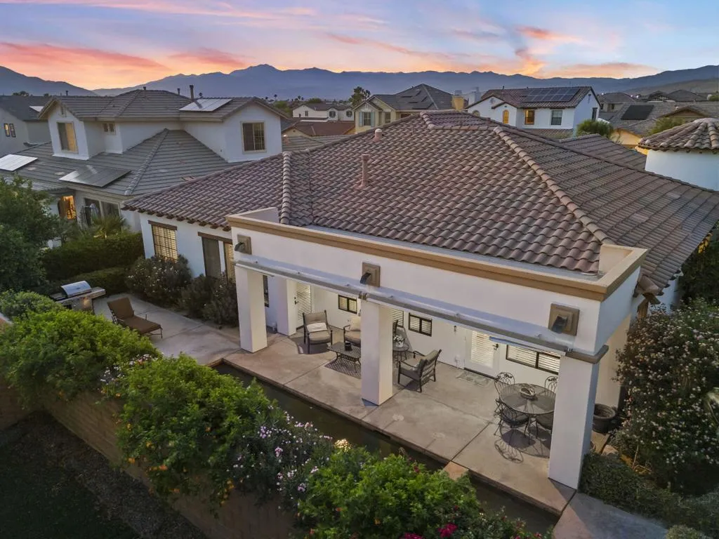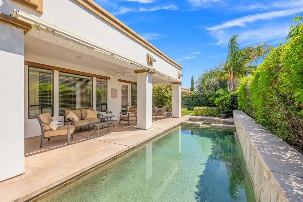 Welcome to 407 Via Milano, the original model home in the highly sought-after gated community of Campanile. This beautifully maintained, one-owner residence offers just over 2,700 square feet of thoughtfully designed living space with 3 bedrooms and 2.5 bathrooms. The home showcases model-quality finishes and a warm, inviting aesthetic with exposed wood beam ceilings, expansive living areas, and seamless indoor-outdoor flow. The spacious kitchen opens to the main living area and is ideal for entertaining, featuring a large island, ample cabinetry, a built-in desk/workstation, and a wet bar with a wine fridge. The primary suite is generously sized with walk-in closets and a spa-like bathroom, while one of the guest bedrooms is currently configured as a dedicated office, offering flexibility for use as either a bedroom or workspace. Additional spaces include a formal dining room and a versatile den or reading area. Step outside to a private west-facing backyard retreat with a covered patio, multiple seating areas, a pebble tec pool and spa, and a well-maintained grassy area, all set against scenic San Jacinto Mountain views and stunning desert sunsets. As a former model home, this property stands out with upgraded design elements, premium lot positioning, and exceptional overall appeal, and residents of Campanile enjoy access to parks, pools, and a gym within a secure, beautifully maintained community. A rare opportunity to own a standout home that blends space, design, and elevated desert living.