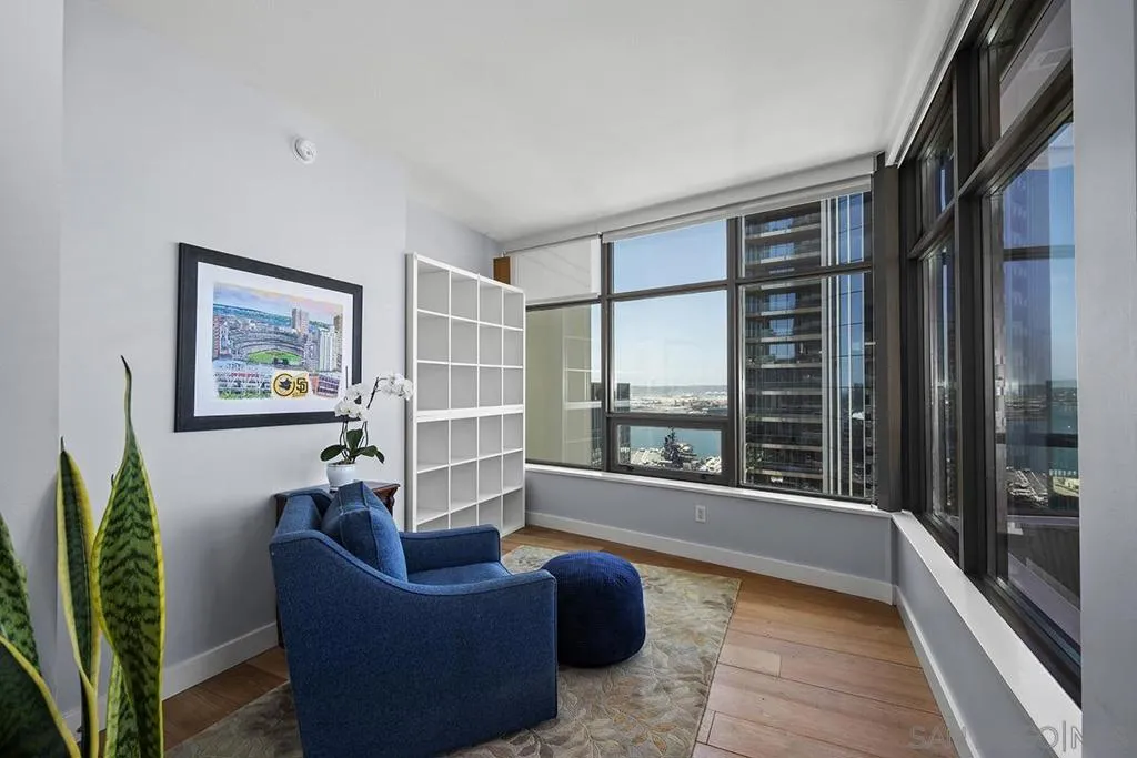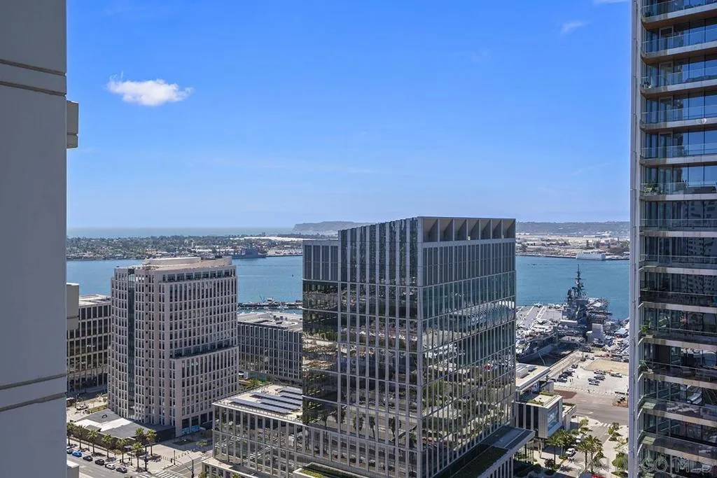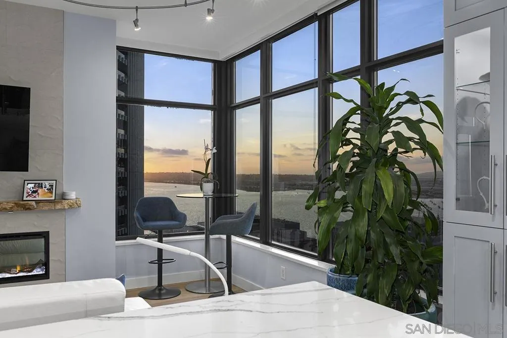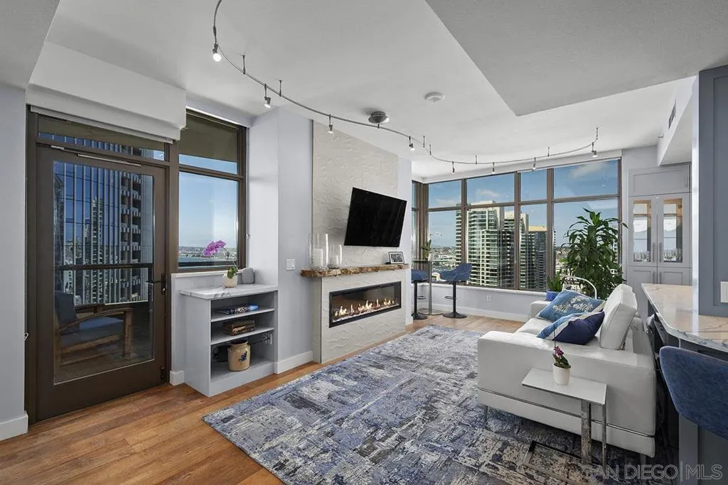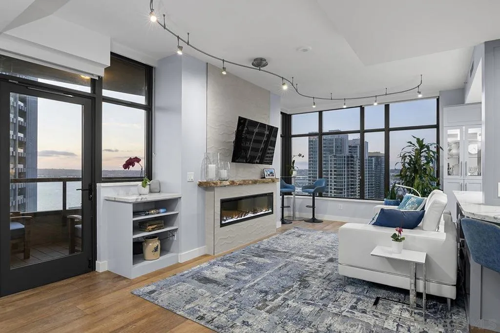 Come experience true high-rise living in one of only two residences with this coveted floor plan at Electra. Perched on the 29th floor, this fully reimagined northwest corner home captures sweeping views of the bay, Point Loma, and the sparkling city skyline from every room. A private balcony sets the stage for unforgettable San Diego sunsets. Thoughtfully redesigned for both style and function, the residence showcases wide-plank reclaimed teak flooring, a sleek linear fireplace with stone surround, and a striking petrified wood mantel. The open-concept kitchen is a true standout created for those who love to cook and features a Wolf range, built-in Sub-Zero refrigerator, Miele dishwasher, beverage chiller, quartz countertops, farmhouse sink, subway tile backsplash, and a custom glass-front display cabinet. Wake up to blue water views in the serene primary suite, complete with a spa-inspired ensuite bath offering dual vanities, a modern LED mirror, and a step-in shower. The versatile second bedroom, currently styled as a den/office, retains its closet and can easily be converted back to a full bedroom. The guest bath has also been tastefully upgraded with quartz surfaces and new cabinetry. Additional highlights include side-by-side parking on P1 with EV charging and dedicated storage on the same level. Ideally located in the vibrant Columbia District, you’re just moments from Waterfront Park, Little Italy, and Seaport Village. Rarely does a home combine this level of design, location, and view come along often so don’t miss your opportunity. Offering a fabulous location in the coveted Columbia District, you will love being only a short walk to Waterfront Park, Seaport Village, The Headquarters, and the brand-new Rady’s Shell at Jacobs Park, a unique live music venue and home of the San Diego Symphony! Also enjoy proximity to the future life science and biotechnology research development The Research and Development District (The RaDD) at the Embarcadero and the sustainable tech-focused Horton Plaza Redevelopment in the center of the city. Electra has the unique distinction of being built around the historical 1928 SDG&E Station B. Residents can take advantage of an array of services including a concierge, security, and guest parking spaces available by reservation through a simple mobile app. Unwind and relax in the steam room or sauna, resort-style pool and spa, fitness center, and Electra Park on the 5th floor surrounded by lush landscaping and a romantic outdoor fireplace and top-of-the-line barbecues.