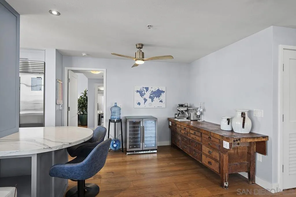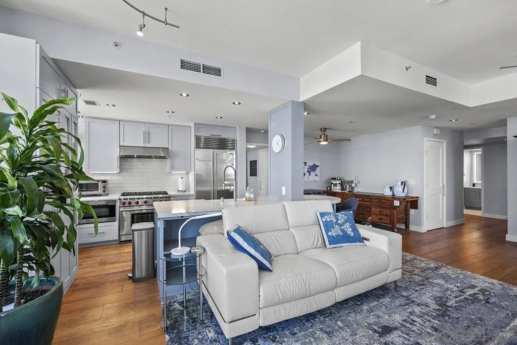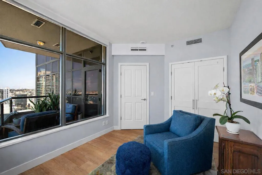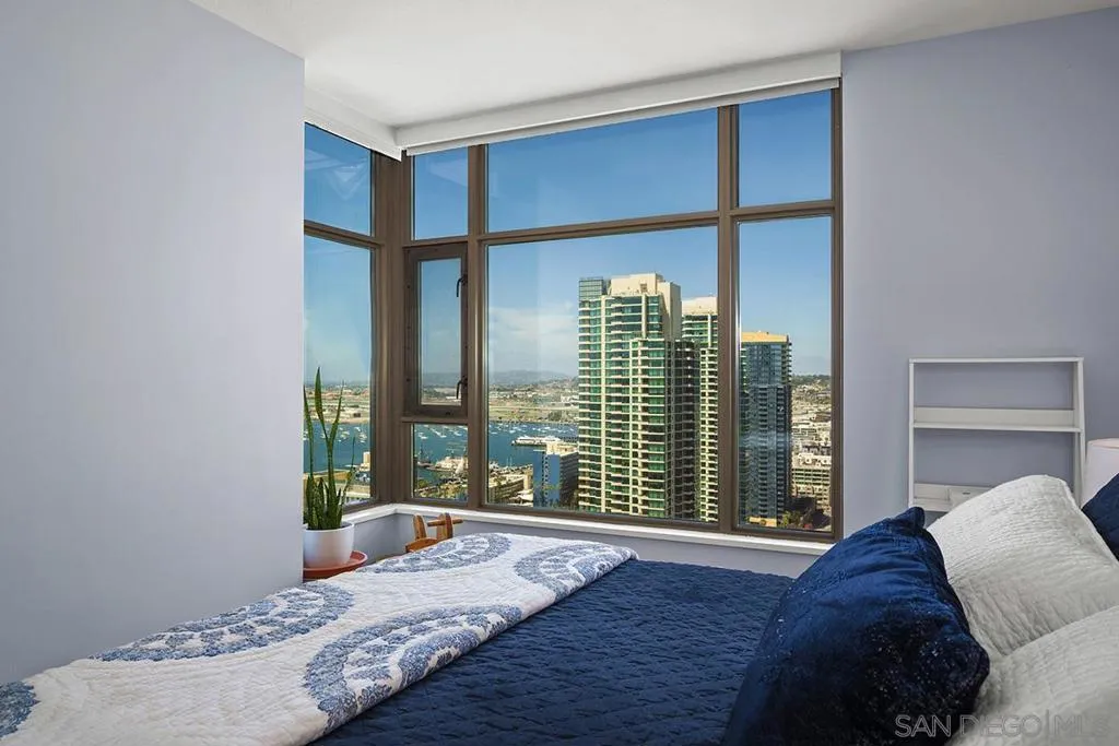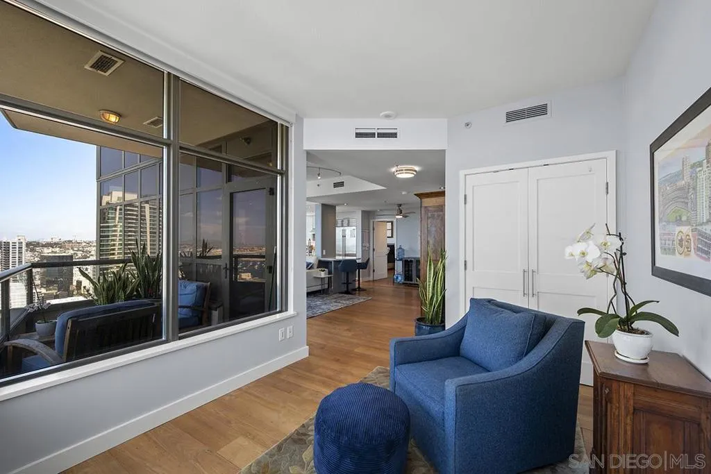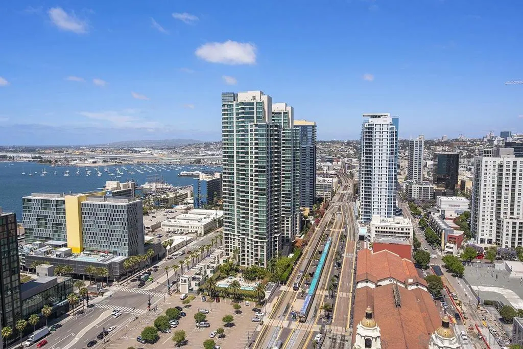 Come experience true high-rise living in one of only two residences with this coveted floor plan at Electra. Perched on the 29th floor, this fully reimagined northwest corner home captures sweeping views of the bay, Point Loma, and the sparkling city skyline from every room. A private balcony sets the stage for unforgettable San Diego sunsets. Thoughtfully redesigned for both style and function, the residence showcases wide-plank reclaimed teak flooring, a sleek linear fireplace with stone surround, and a striking petrified wood mantel. The open-concept kitchen is a true standout created for those who love to cook and features a Wolf range, built-in Sub-Zero refrigerator, Miele dishwasher, beverage chiller, quartz countertops, farmhouse sink, subway tile backsplash, and a custom glass-front display cabinet. Wake up to blue water views in the serene primary suite, complete with a spa-inspired ensuite bath offering dual vanities, a modern LED mirror, and a step-in shower. The versatile second bedroom, currently styled as a den/office, retains its closet and can easily be converted back to a full bedroom. The guest bath has also been tastefully upgraded with quartz surfaces and new cabinetry. Additional highlights include side-by-side parking on P1 with EV charging and dedicated storage on the same level. Ideally located in the vibrant Columbia District, you’re just moments from Waterfront Park, Little Italy, and Seaport Village. Rarely does a home combine this level of design, location, and view come along often so don’t miss your opportunity. Offering a fabulous location in the coveted Columbia District, you will love being only a short walk to Waterfront Park, Seaport Village, The Headquarters, and the brand-new Rady’s Shell at Jacobs Park, a unique live music venue and home of the San Diego Symphony! Also enjoy proximity to the future life science and biotechnology research development The Research and Development District (The RaDD) at the Embarcadero and the sustainable tech-focused Horton Plaza Redevelopment in the center of the city. Electra has the unique distinction of being built around the historical 1928 SDG&E Station B. Residents can take advantage of an array of services including a concierge, security, and guest parking spaces available by reservation through a simple mobile app. Unwind and relax in the steam room or sauna, resort-style pool and spa, fitness center, and Electra Park on the 5th floor surrounded by lush landscaping and a romantic outdoor fireplace and top-of-the-line barbecues.