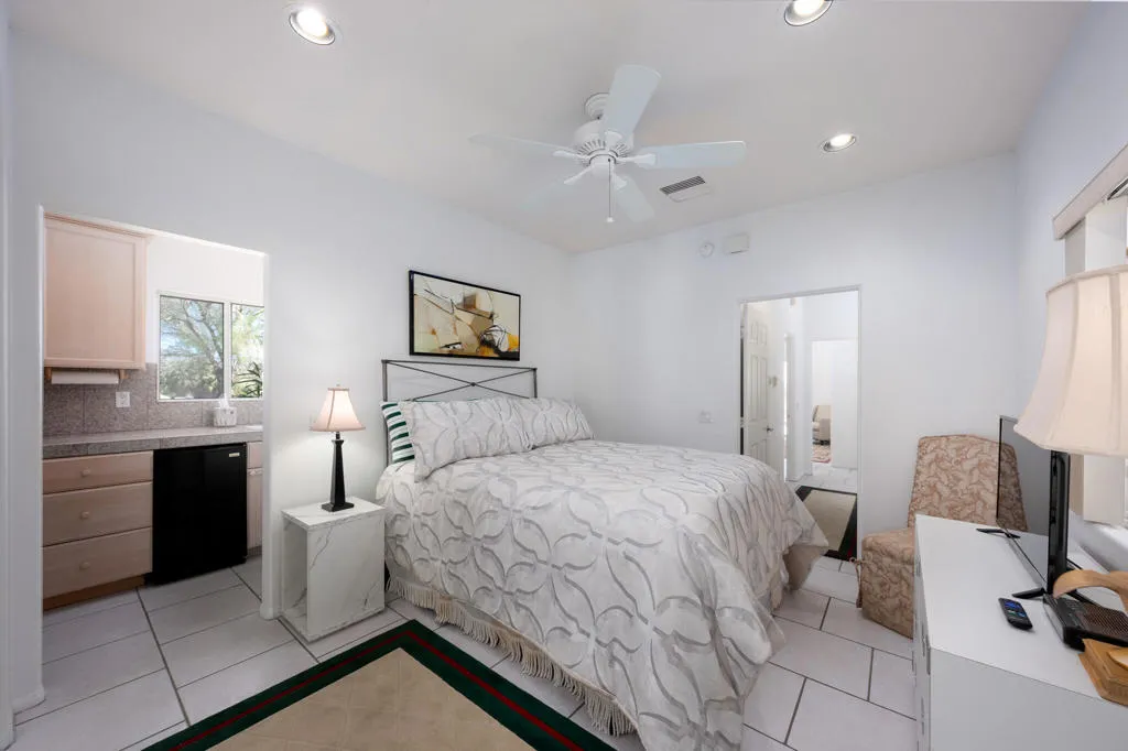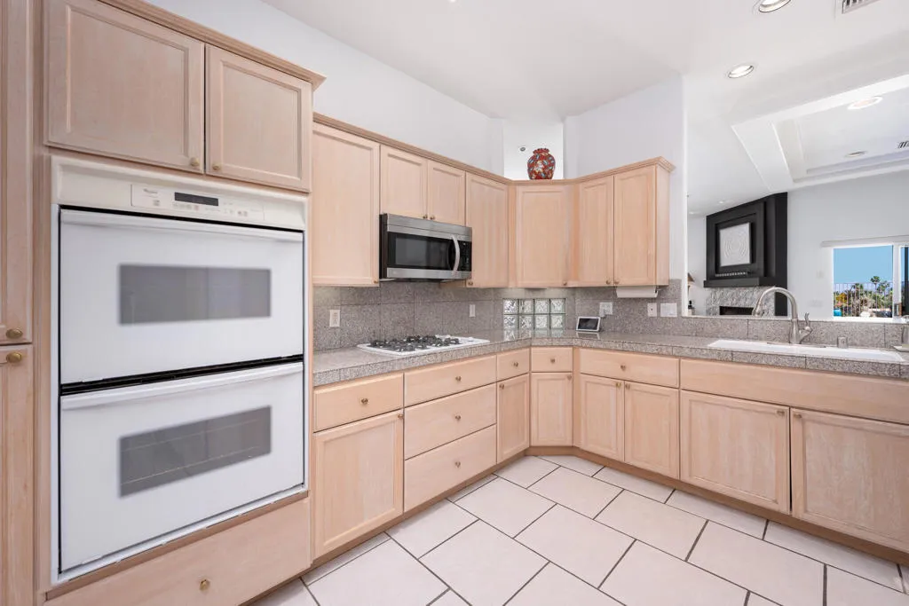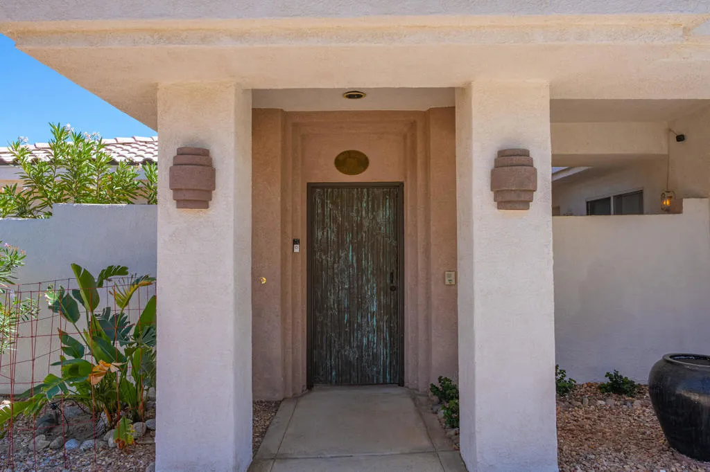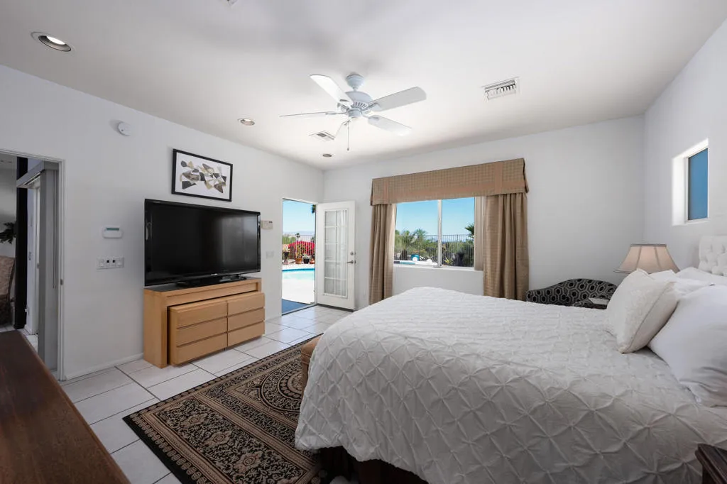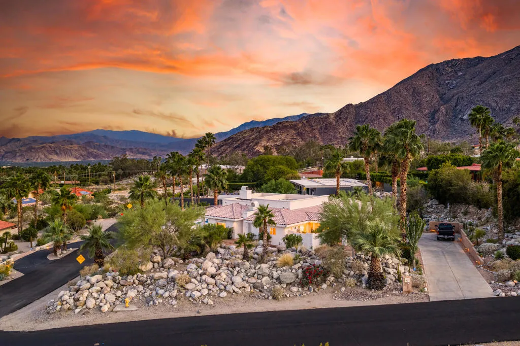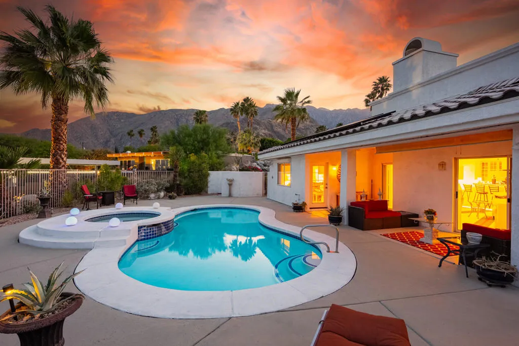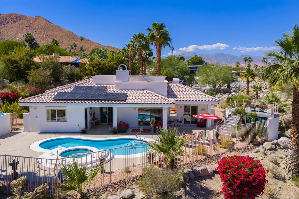 High above Palm Springs, this exceptional 3-bedroom, 3-bathroom estate-like residence on an 1/2 acre lot commands breathtaking 360-degree views of the entire valley floor and beyond. Take advantage of this rare opportunity to join a truly unique neighborhood with investment potential, where you find new and old custom built single family homes side by side.Owing to its custom build, the layout is thoughtful, with a grand entrance opening to the living room showcasing a custom fireplace. The kitchen delivers generous prep space, bar seating, a spacious walk-in pantry, and a cozy breakfast area for four, with an adjacent den that could easily serve as a 4th bedroom. Each bedroom has access to an outdoor patio space, with the primary leading directly to the pool area and on the front of the house, one of two guest bedrooms has its own entrance, kitchenette and en suite bath, ideally suited as a guest house.The outdoor experience includes a covered patio, sparkling tiled pool, spa, and a raised deck all with the phenomenal valley as your backdrop. Leased solar panels With undeniable renovation potential, property represents is a compelling investment. 30-Panels Solar system and Short Term Rental Permit availability. Furniture available outside of escrow per Seller inventory. Rare 3-Car Garage and expansive driveways for multiple cars. Fee simple (You Own the Land).