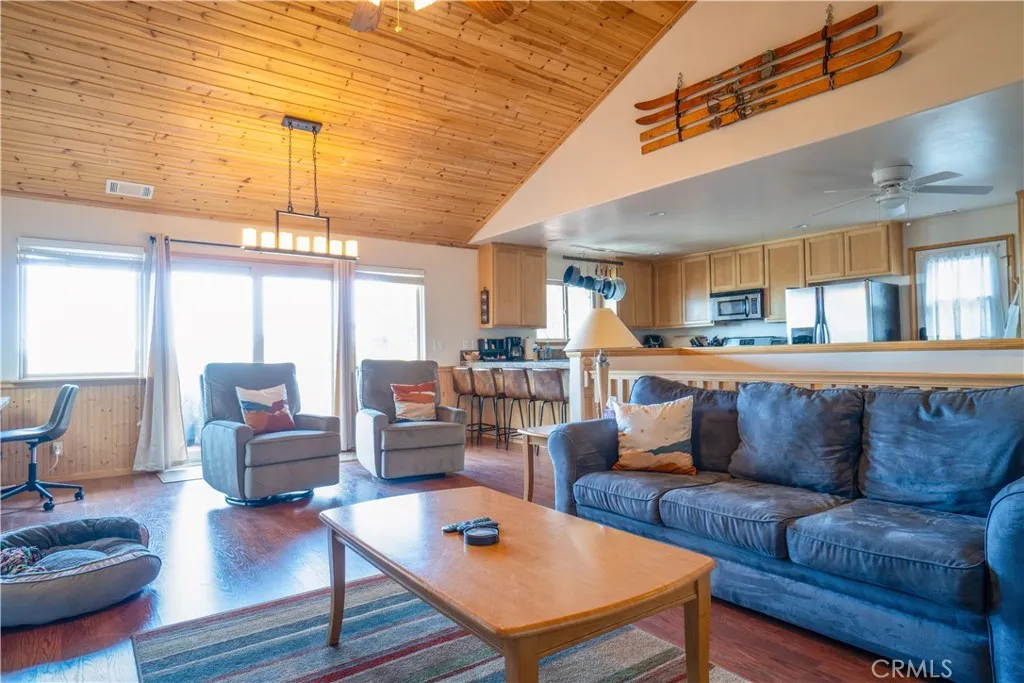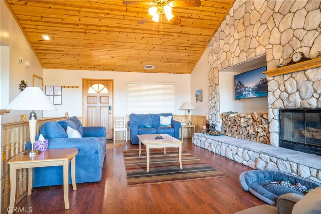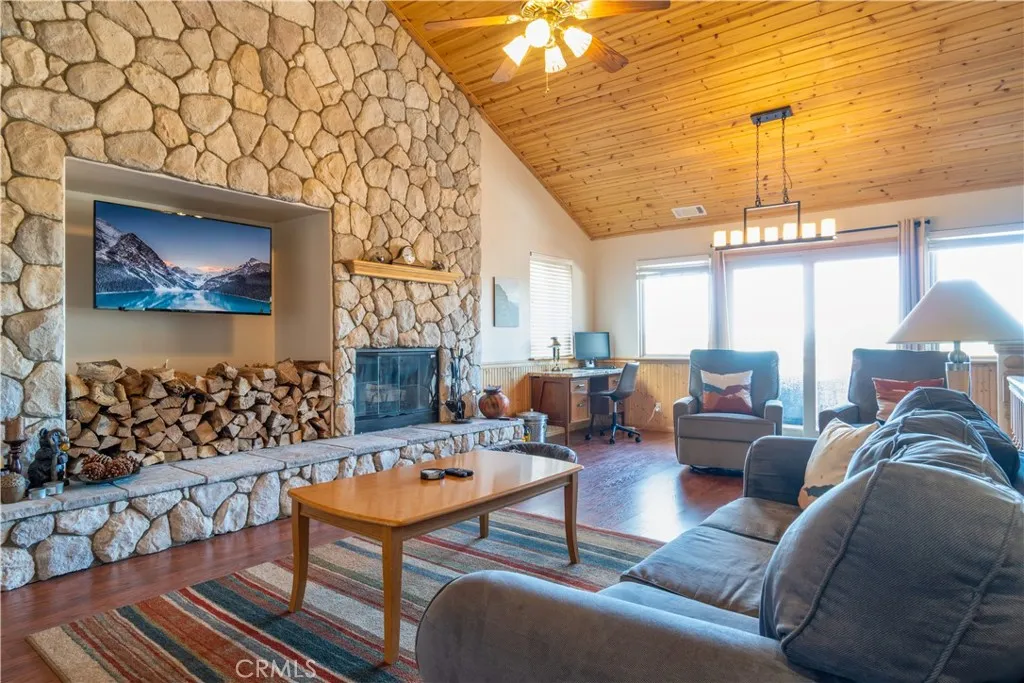 Tucked into the pine and oak forest of Green Valley Lake, this turnkey modern lodge-style mountain home offers the perfect blend of rustic charm, comfort, and convenience. Set on a ridgeline with panoramic western views to Mount Baldy, the home captures spectacular sunsets and a peaceful forest setting. Built in 2007 with an open-concept design, it features vaulted tongue-and-groove pine ceilings, a stunning floor-to-ceiling river rock fireplace, spacious living and dining areas, and a well-appointed kitchen designed for gathering and entertaining. Offered fully furnished and equipped for immediate use, this home is ready to enjoy from the moment you arrive. Recent improvements include a natural gas whole-home back-up Generac generator, full exterior repainting, driveway and deck staining, and a 240V EV charger installed in 2024. The kitchen has also been updated with new Samsung appliances, including a refrigerator, dishwasher, microwave, and gas range, all installed in December 2025. Central heat and air conditioning add year-round comfort, while the inviting decks provide the perfect place to unwind and soak in the mountain air and sweeping views. Just a short stroll to the lake, boating, fishing, hiking, dining, and the village general store, this is an ideal full-time residence, weekend retreat, or furnished investment property. Snow Valley, Lake Arrowhead, and Big Bear are all within easy reach. Possible third-level addition potential offers added flexibility and future opportunity.