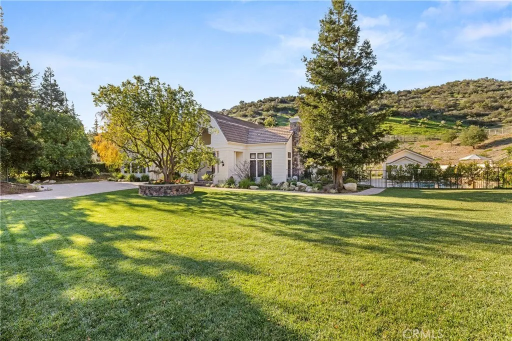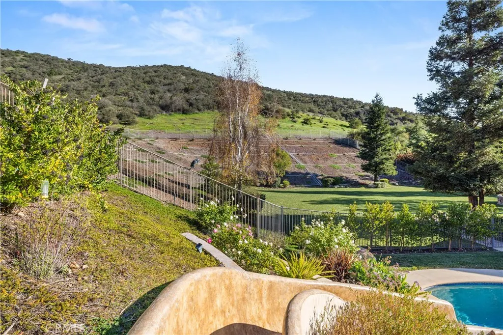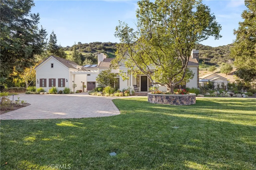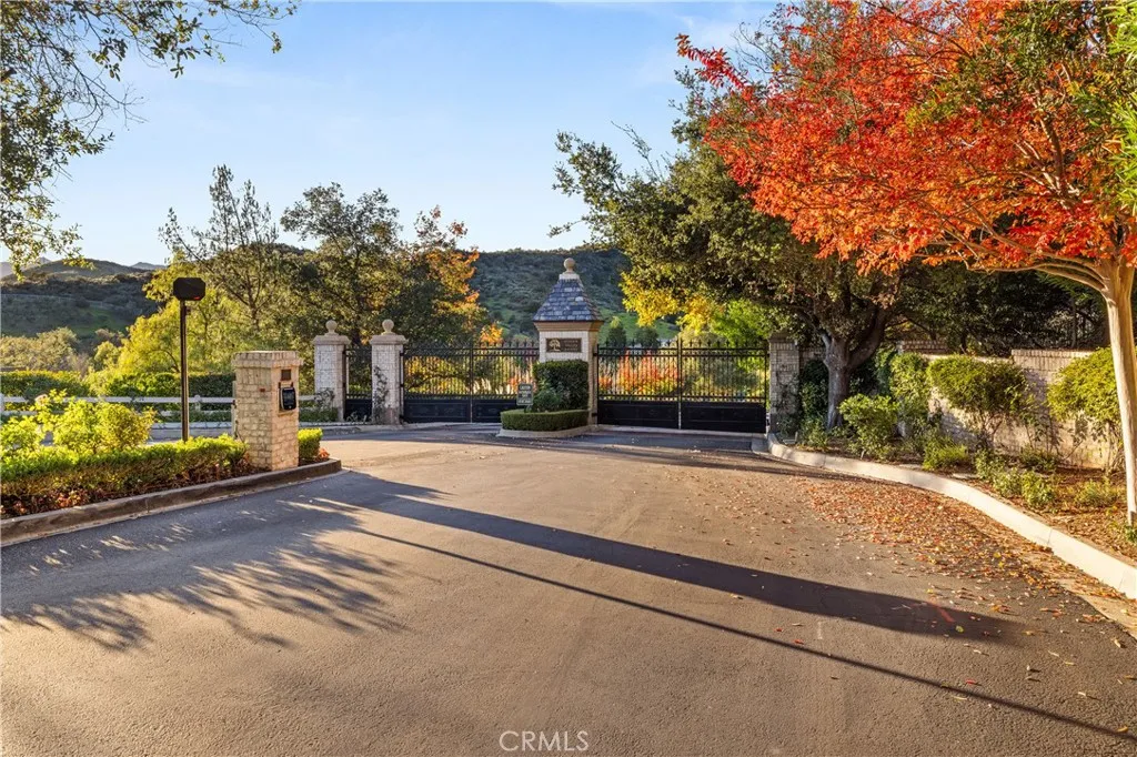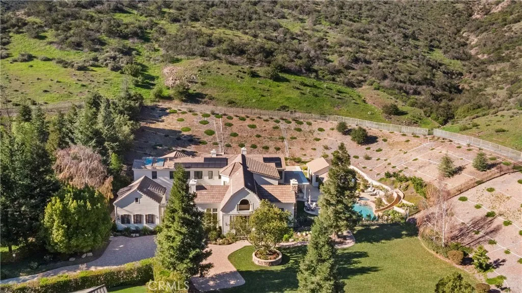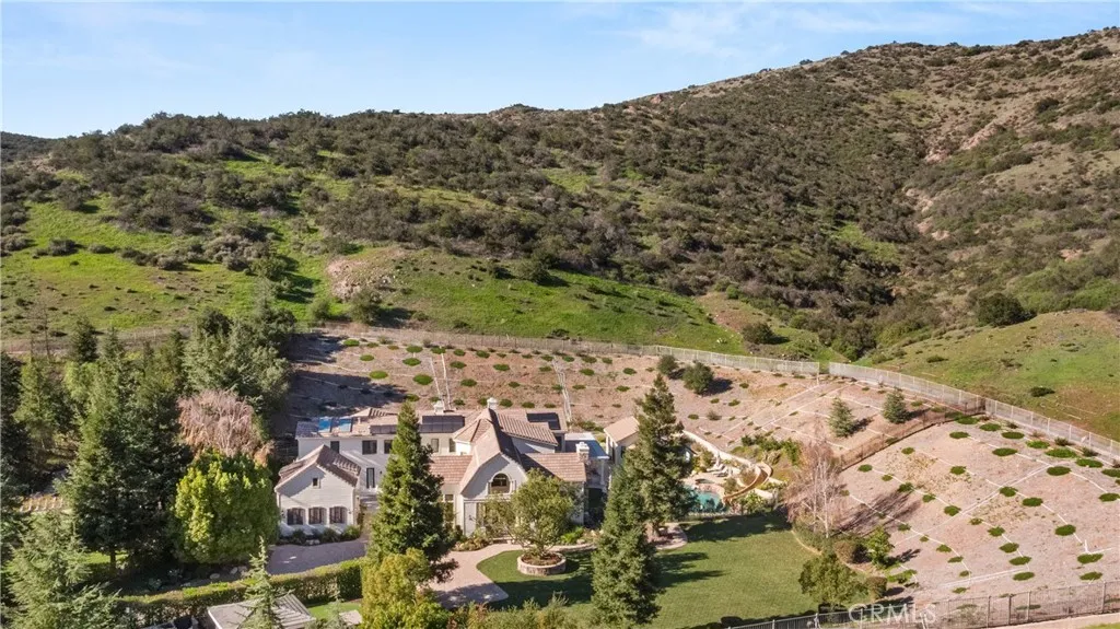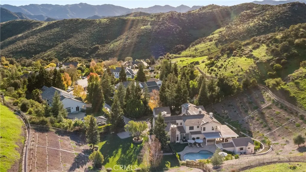 Nestled on one of the largest lots in Westlake Village, at 4.76 acres in the prestigious gated community of Hidden Valley Estates this property offers the ultimate in privacy and luxury. Located in the most private location in the neighborhood down a long driveway and surrounded by open space. Interior highlights include a beautiful grand entry, hardwood floors in most of the home, and custom window treatments throughout. There is a large family room with a fireplace that opens to a gourmet remodeled kitchen with a Viking 6-burner gas range and double oven, Subzero refrigerator, Thermador dishwasher, a butler's pantry with a wine refrigerator and a large walk-in pantry. Also, located on the first level is a downstairs en-suite bedroom, spacious laundry room, library/office w/ a fireplace and built-in bookshelves with a ladder, formal living room w/ a fireplace and a view of the courtyard with a glistening fountain & an impressive formal dining room. Upstairs is the luxurious primary en-suite complete with a fireplace, sitting area, walk-in closets and a balcony to enjoy the serene mountain views. There are 3 more spacious en-suite bedrooms, 2 of which were recently expanded, complete the upstairs. Outside is the perfect entertaining area with a spacious covered patio w/ a fireplace, a built-in barbeque and Green Egg, a sink & ice maker, a sparkling pool w/ a fun waterslide, waterfall, and spa. In addition, there is a recently added guest house and a 3000 bottle subterranean wine cellar. There is still more yard to enjoy with lots of open grassy area and hillside, there is room for a sports court, vineyard, orchard, the possibilities are endless. All this plus a 4-car garage, owned solar panels, and a whole house generator. This home is conveniently located close to restaurants, shopping, award-winning schools, and Sherwood, yet it feels like a peaceful & tranquil retreat. Truly, a one-of-a-kind property.