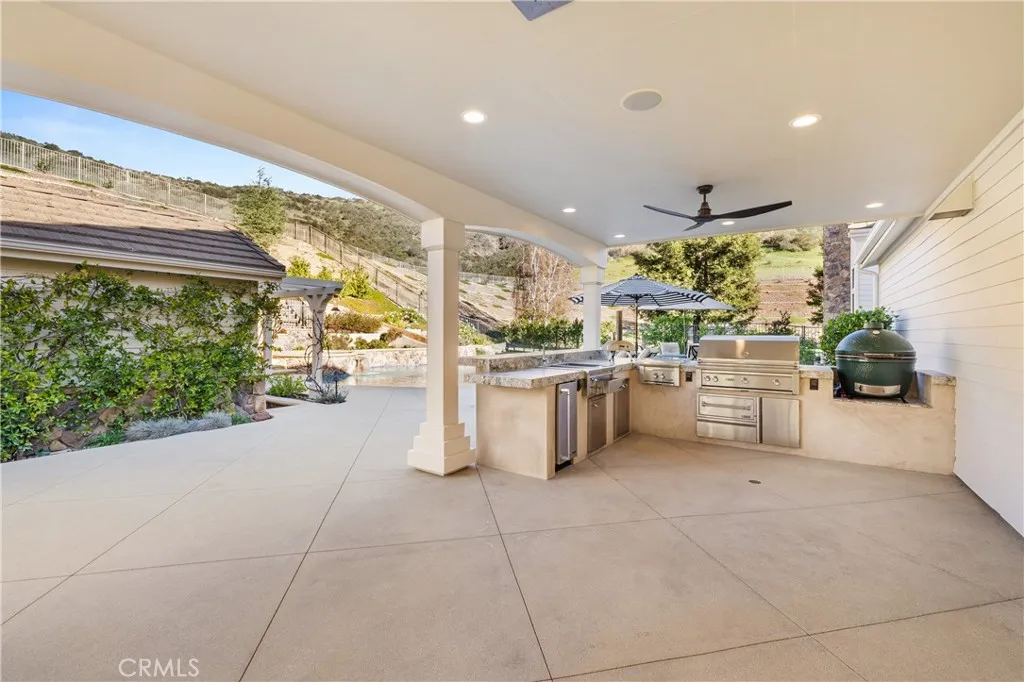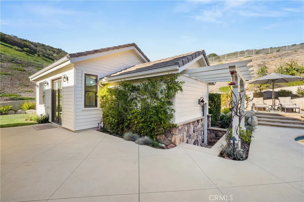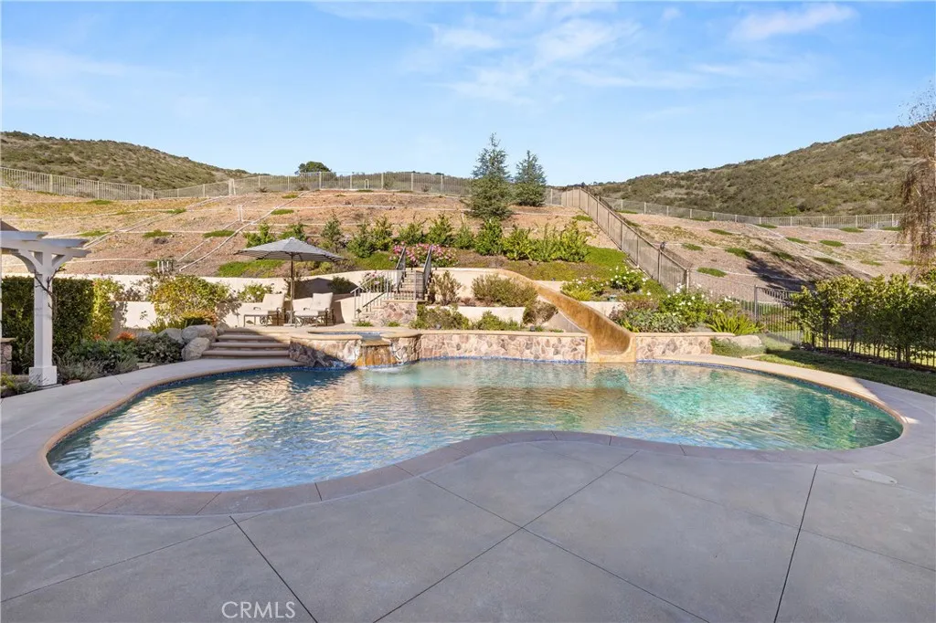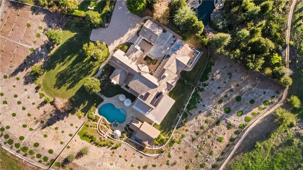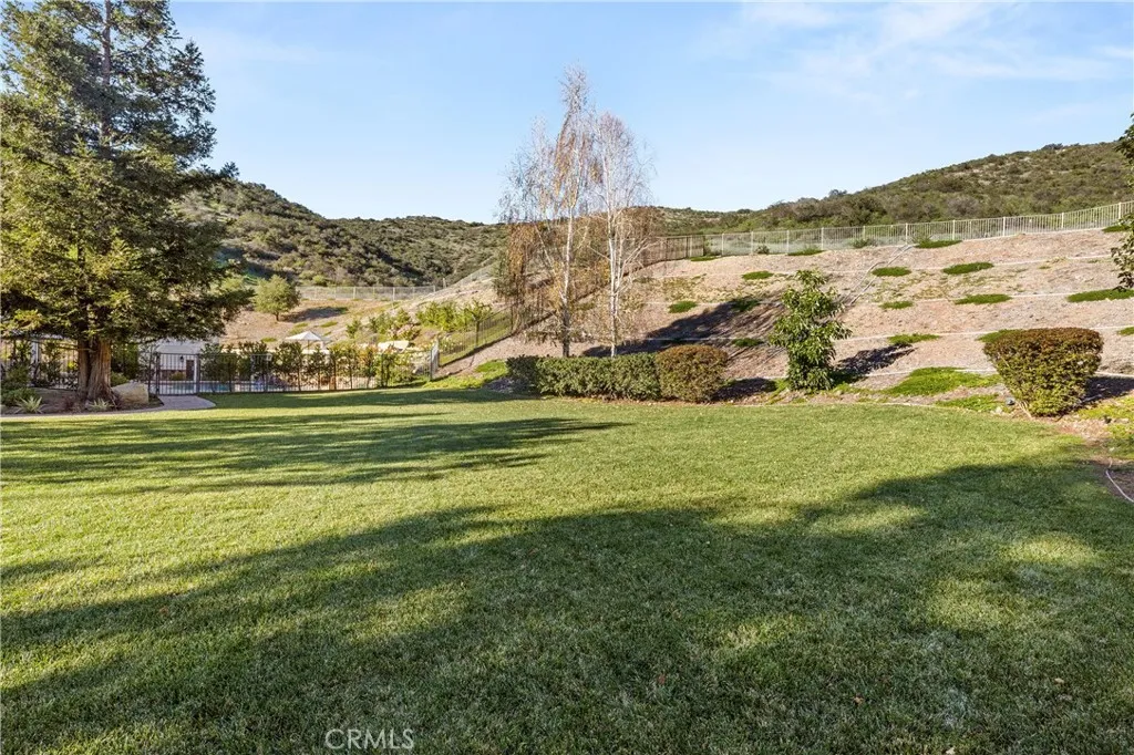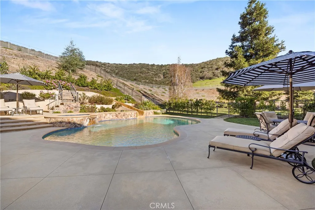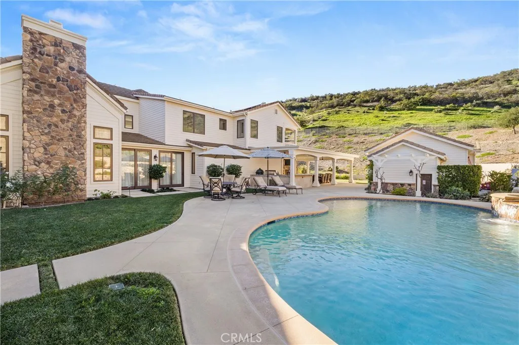 Nestled on one of the largest lots in Westlake Village, at 4.76 acres in the prestigious gated community of Hidden Valley Estates this property offers the ultimate in privacy and luxury. Located in the most private location in the neighborhood down a long driveway and surrounded by open space. Interior highlights include a beautiful grand entry, hardwood floors in most of the home, and custom window treatments throughout. There is a large family room with a fireplace that opens to a gourmet remodeled kitchen with a Viking 6-burner gas range and double oven, Subzero refrigerator, Thermador dishwasher, a butler's pantry with a wine refrigerator and a large walk-in pantry. Also, located on the first level is a downstairs en-suite bedroom, spacious laundry room, library/office w/ a fireplace and built-in bookshelves with a ladder, formal living room w/ a fireplace and a view of the courtyard with a glistening fountain & an impressive formal dining room. Upstairs is the luxurious primary en-suite complete with a fireplace, sitting area, walk-in closets and a balcony to enjoy the serene mountain views. There are 3 more spacious en-suite bedrooms, 2 of which were recently expanded, complete the upstairs. Outside is the perfect entertaining area with a spacious covered patio w/ a fireplace, a built-in barbeque and Green Egg, a sink & ice maker, a sparkling pool w/ a fun waterslide, waterfall, and spa. In addition, there is a recently added guest house and a 3000 bottle subterranean wine cellar. There is still more yard to enjoy with lots of open grassy area and hillside, there is room for a sports court, vineyard, orchard, the possibilities are endless. All this plus a 4-car garage, owned solar panels, and a whole house generator. This home is conveniently located close to restaurants, shopping, award-winning schools, and Sherwood, yet it feels like a peaceful & tranquil retreat. Truly, a one-of-a-kind property.