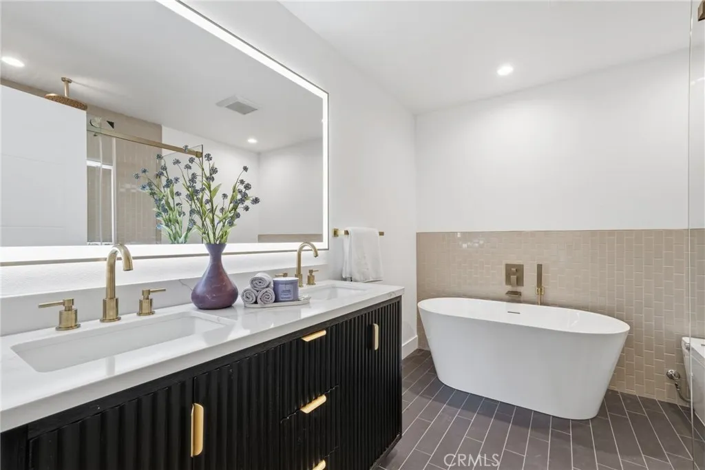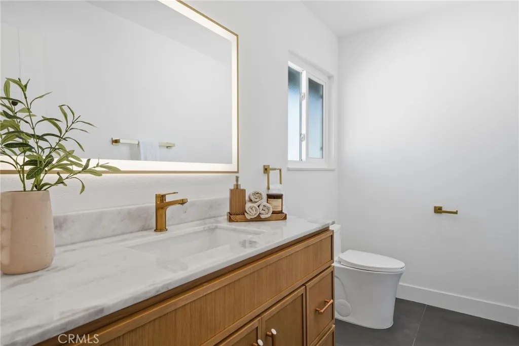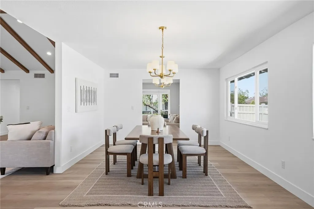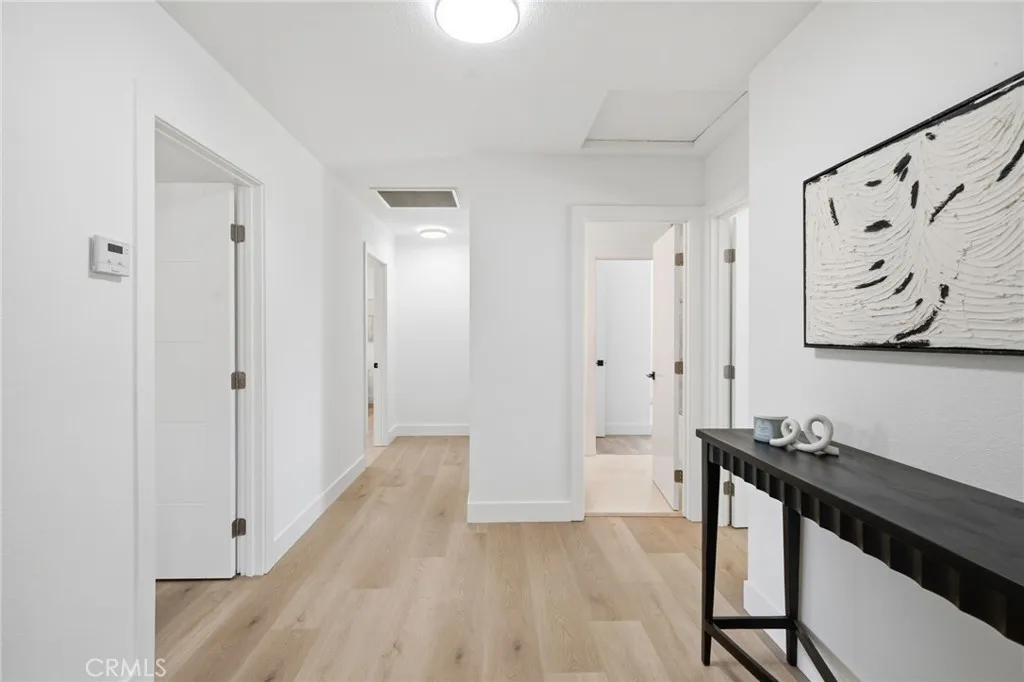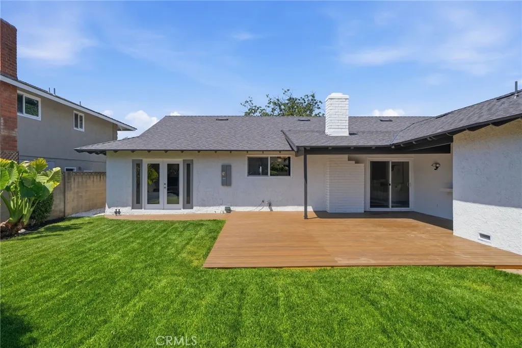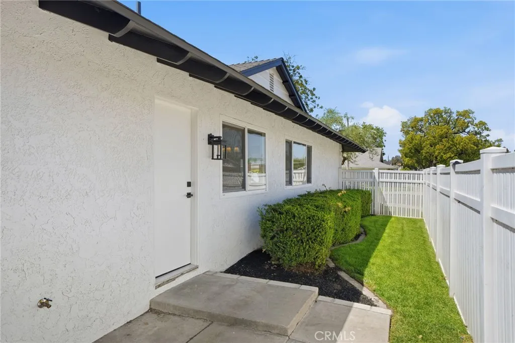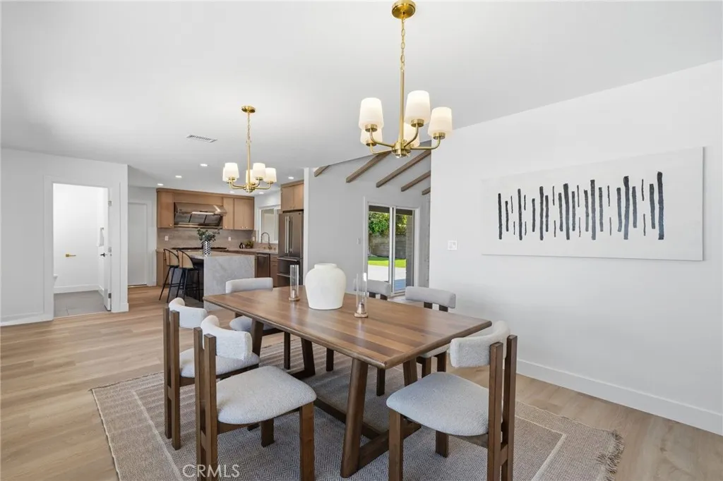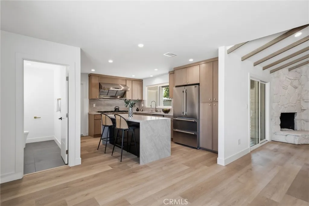 Meticulously remodeled and truly turnkey, this exceptional 4-bedroom, 2.5-bath single-level residence is gracefully positioned on a coveted corner cul-de-sac lot within Orange’s established Fairmont neighborhood. Thoughtfully reimagined with a refined, modern sensibility, the home blends timeless design with elevated comfort, offering a step-free interior, a custom soft contemporary entry door, and an airy open-concept floor plan tailored for both everyday living and effortless entertaining. The designer kitchen serves as the showpiece of the home, appointed with custom Slim Shaker oak cabinetry, striking Calacatta Bella quartz countertops, a generous center island with seating, farmhouse sink, and stainless steel appliances. Wide-plank luxury vinyl flooring flows throughout, complemented by porcelain tile baths, curated finishes, and sophisticated layered lighting that enhance the home’s polished aesthetic. Privately situated, the primary suite is a serene retreat filled with natural light and enhanced by a custom walk-in closet, architectural ceiling detail, and French doors that open to the backyard for a seamless indoor-outdoor connection. The spa-inspired primary bath evokes a boutique resort feel with dual vanities, designer fixtures, a freestanding soaking tub, and an expansive glass-enclosed shower finished with custom tile and multiple shower heads. Secondary bedrooms are generously proportioned and thoughtfully designed, offering flexibility for guests, office space, or creative use. One enjoys direct access to a beautifully remodeled hall bath, while another is currently styled as a sophisticated home office with views of the front yard and mature trees. Recent upgrades further elevate the home’s appeal, including a new HVAC system, composite roof, 200-amp electrical panel, fresh exterior paint, and new sod. The grounds are framed by mature landscaping, highlighted by a stately olive tree and expansive frontage along a quiet cul-de-sac. Ideally located near the charm of Old Towne Orange, premier dining and shopping, and convenient access to the 55 and 22 freeways, this remarkable residence offers a rare blend of design, comfort, and location.