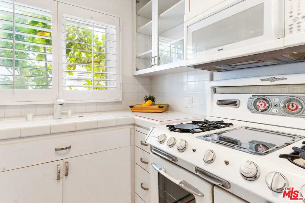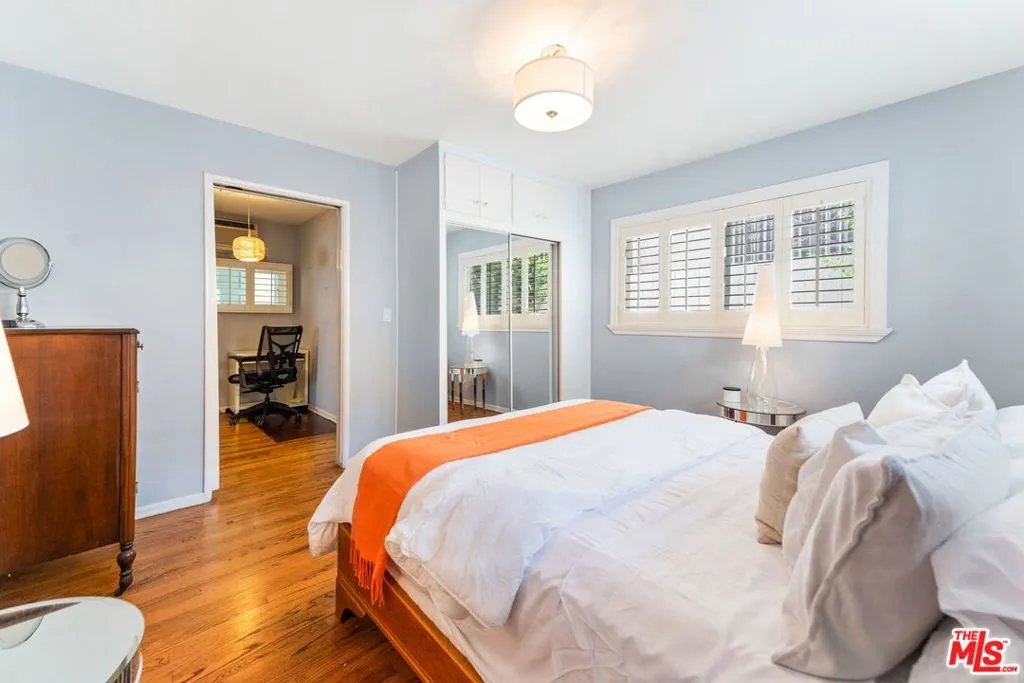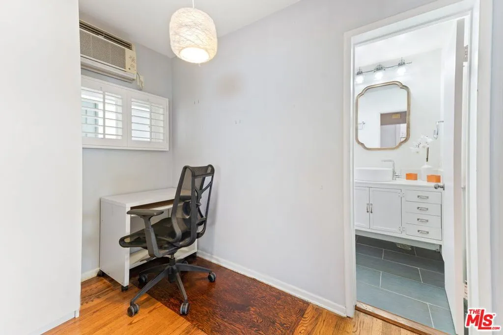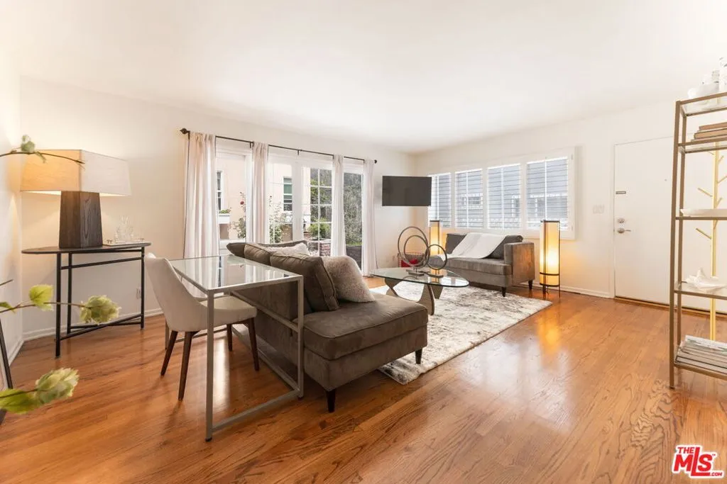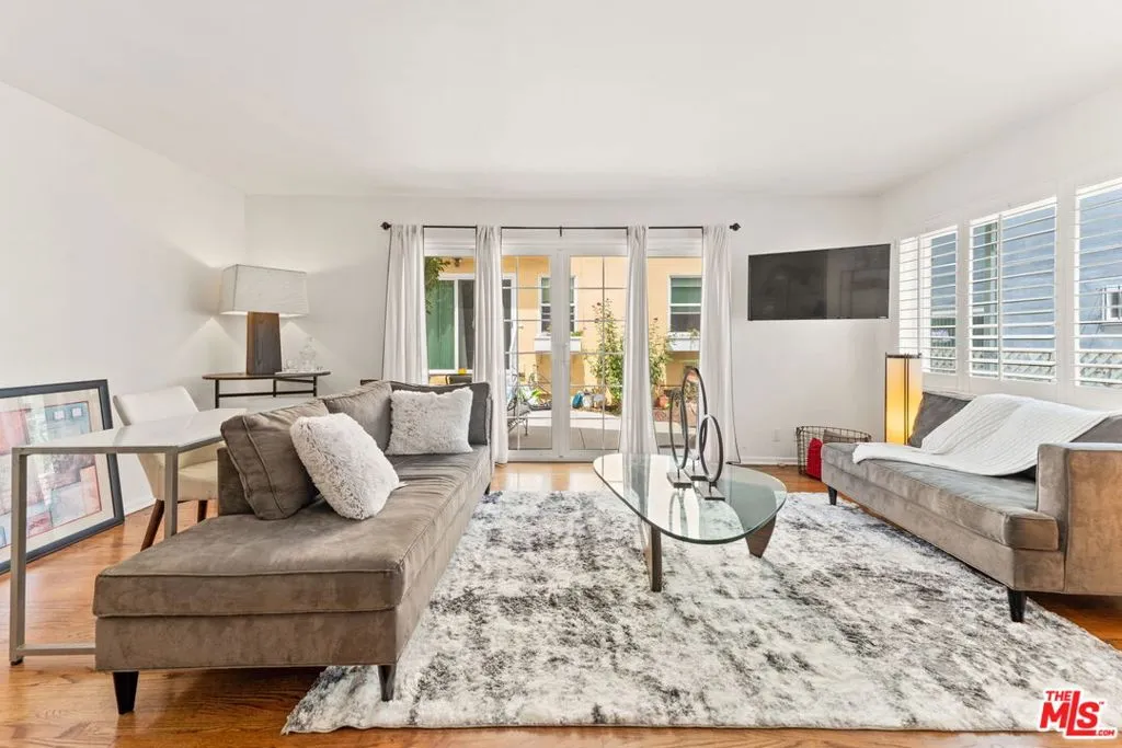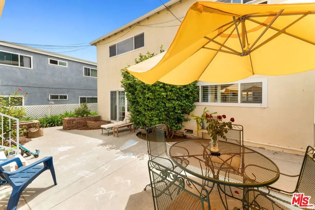 Light & Bright 1 bedroom condo with large patio off living room through double sliding glass doors which extends the living area to this unit. The kitchen has all the necessary appliance- O'Keefe & Merritt double oven stove, dishwasher, refrigerator & microwave. Off living area is extra storage/closet and area for office. Bedroom has lots of light but also has wooden shutters when needed to keep room peacefully dim. There is an extra private large storage room which goes with unit for bicycles, and other personal items. Community laundry room shared with 3 other units only. Off alley is 1 car parking area. Unit is located close to Wilshire where you will find Whole Foods, Target, restaurants, shopping and transportation. Easy to show.