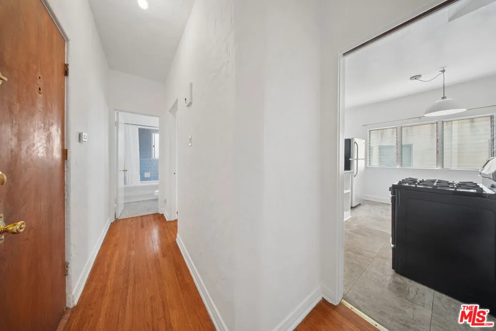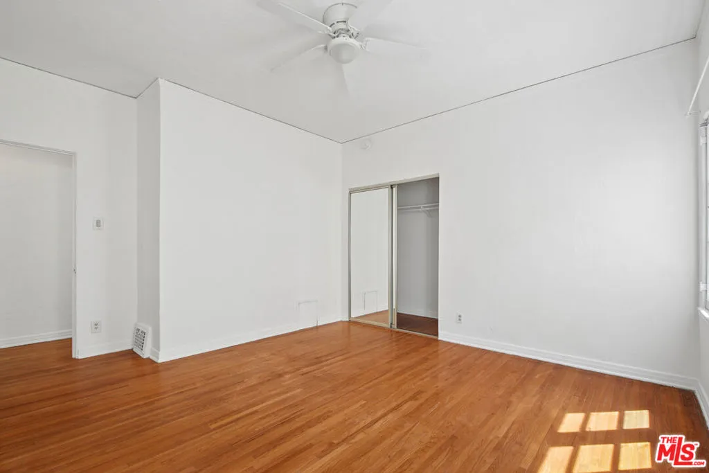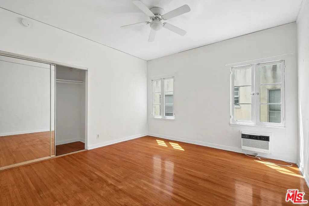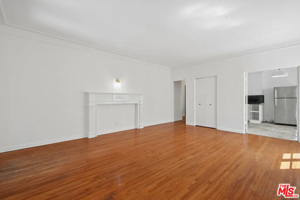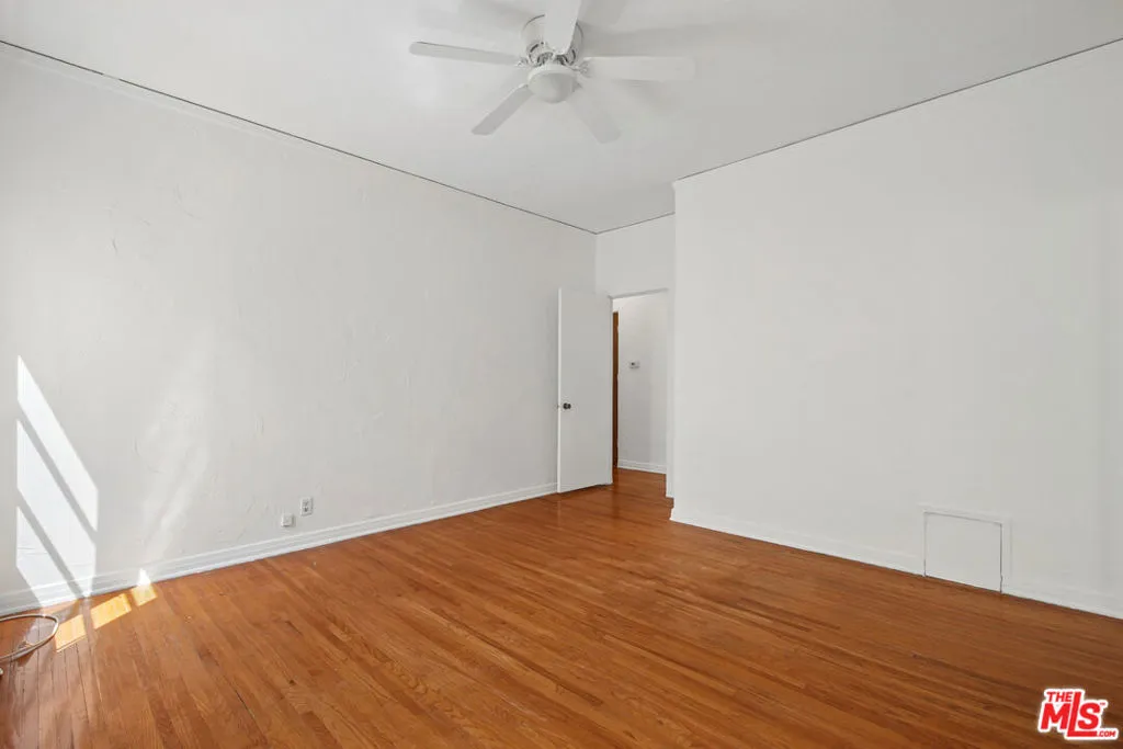 Spacious top-floor 1-bedroom, 1-bath unit in prime Beverly Hills featuring hardwood floors throughout, a large living room with abundant natural light, and wall A/C units. The kitchen includes white cabinetry, gas range, stainless steel refrigerator, and a separate dining area. Generously sized bedroom with mirrored closet doors and ceiling fan. Classic tile bathroom with full tub. On-site laundry. Pets allowed. Tenant pays gas, electric, and trash. Water included. Permit street parking available. Conveniently located near Rodeo Drive, Beverly Drive, Wilshire Blvd, shopping, dining, parks, and grocery stores. Square footage is approximate and not verified.