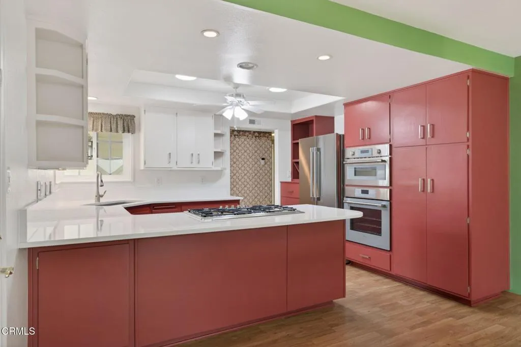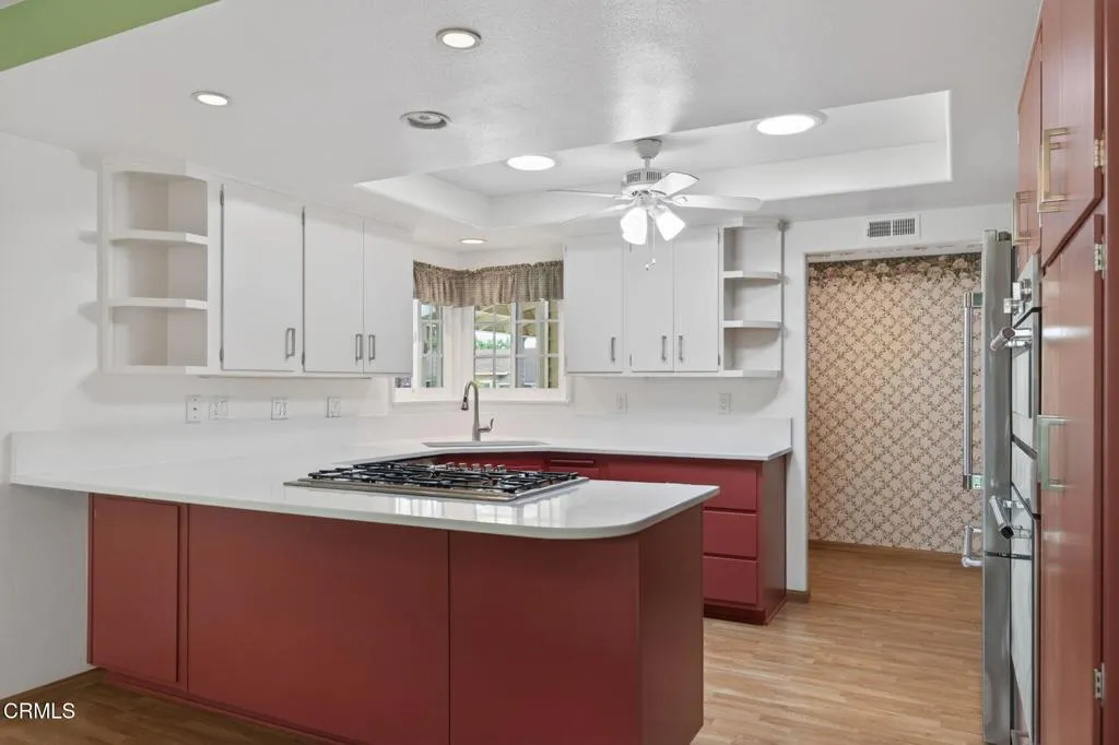 Below Ventura College lies a charming, established neighborhood known for its tree-lined streets, central location, and evident pride of ownership. Situated on a desirable corner lot, 5305 Woodbury is a beautifully maintained 3-bedroom, 2-bath home that blends curb appeal with thoughtful upgrades throughout. The home's exterior shines with vinyl fencing and siding, an extended front porch, and custom Genesis Stoneworks pavers enhancing the driveway and parkways. Inside, the kitchen is a standout feature, showcasing premium Thermador appliances and an eat-in breakfast bar. The space is complemented by durable Silestone quartz countertops--known for their strength and beauty--and enhanced by two solar tube skylights that fill the kitchen with natural light. The backyard, which can be easily accessed through sliding glass doors in the living room, was designed and installed in 2022, and is both functional and inviting. It features drought-tolerant landscaping with many native plants, two raised garden beds, and a fully automated drip irrigation system--ideal for easy, sustainable living. There is also a shed for your gardening tools. With potential RV parking, a heater installed in 2024, updated vinyl windows, and a location that combines neighborhood charm with everyday convenience, this home is a standout opportunity in Ventura.