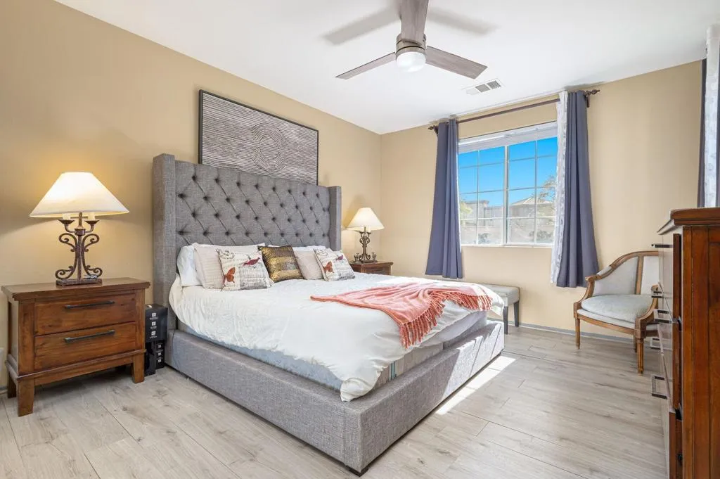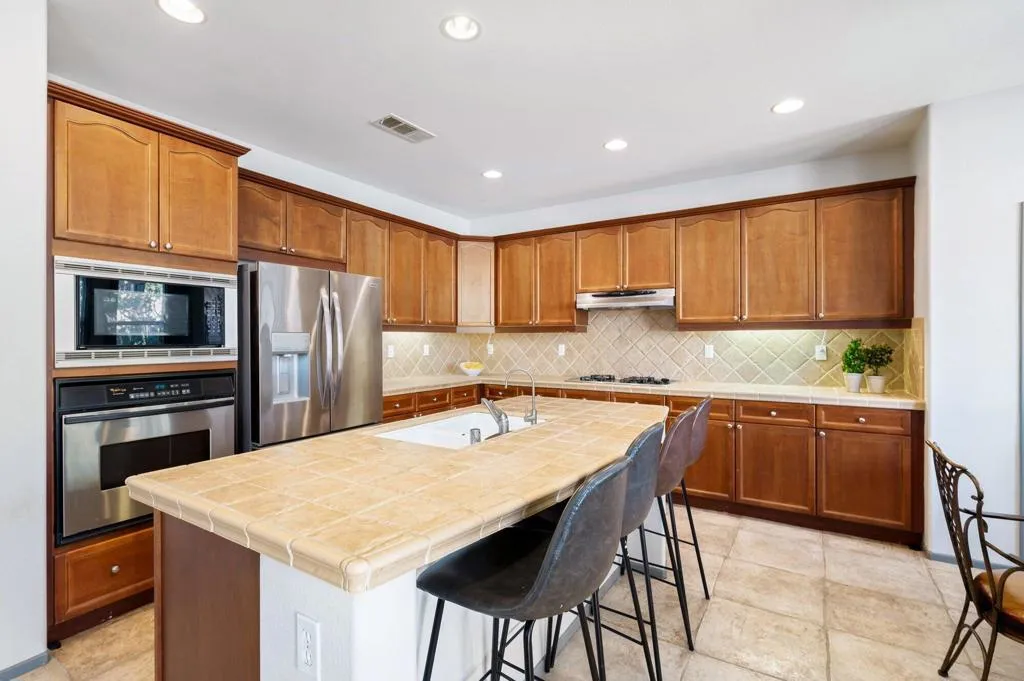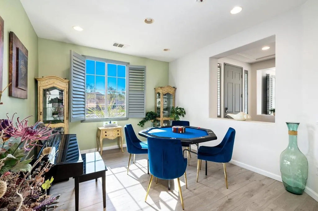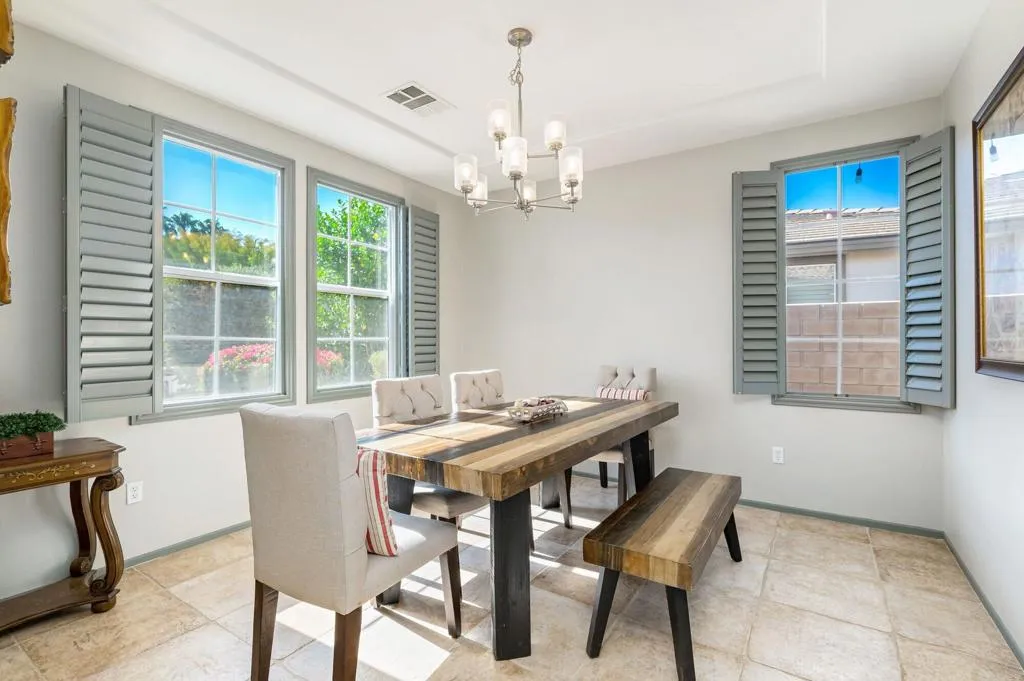 Welcome to Generations, a highly sought-after gated community in North Indio, where your dream home awaits. Located along a beautifully landscaped parkway, this former model home offers the perfect blend of elegance, comfort, & functionality. This light & bright home has enough space for all your family & friends. The open floor plan with a great room with a fireplace for cozy winter nights, a formal dining room, & office/den will easily meet all your needs. You will appreciate the custom kitchen with a large center island, full backsplash, stainless steel appliances, custom built-in cabinetry, pantry, oversized travertine-style tile, & flooring with chiseled edges. This beautiful home also boasts plantation shutters, updated tile in the bathroom & closet, a wireless A/C system, ceiling fans, updated speakers, & built-in shelving in the great room, den, & custom closet. The sizeable primary bedroom with a generous walk-in closet & bath with a separate shower, soaking tub, & double vanity sinks is sure to impress. The inviting backyard is landscaped, very private, & features a large, covered patio & a custom Spool (small Pebble-Tec pool with spa-like jets & waterfall feature). There are also a variety of fruit trees, including mango, mandarin orange, tangelo, pomegranate, guava, lemon, fig, & orange trees. Low HOA fees, no mello-roos, plus lower utility costs. Generations is perfectly located close to world-class golf, tennis, pickleball, shopping, & the Acrisure Arena.