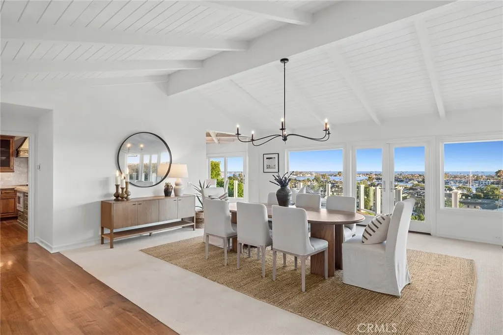 Commanding a premier lot adjacent to Cliff Haven and Newport Heights, 701 Kings Road offers sweeping down coast views of Newport Harbor, Lido Isle, the Pacific Ocean and beyond. Encompassing approximately 4,264 square feet of living space on an expansive 10,220 square foot lot, this three-level coastal residence is defined by its scale, privacy, and exceptional vantage point. The main living level is designed for both grand entertaining and everyday living, featuring soaring vaulted ceilings, exposed beams, and walls of glass that frame the panoramic coastline. Living and dining areas open seamlessly to an expansive view deck, creating a true indoor-outdoor experience set against a striking coastal backdrop. The kitchen is thoughtfully positioned, appointed with a large island, custom cabinetry, and a sunlit breakfast area — all oriented to capture the views. Occupying the entire upper level, the primary suite serves as a private retreat, complete with a fireplace, dramatic picture windows, and sweeping ocean and harbor vistas. A spacious en-suite bath and oversized walk-in closet further elevate the space. Two additional bedrooms are situated on the lower level, offering privacy and flexibility for guests, office space, or additional living. The grounds are equally compelling, featuring an expansive brick terrace with spa, multiple lounge areas, and a rare, usable lower yard with mature landscaping and a private putting green, an ideal balance of outdoor living and scenic outlook. An oversize 2 car garage with work area and an additional 1.5 car garage provide ample parking and storage. Ideally located in Newport Heights, the home offers easy access to 17th Street, Newport Harbor, and world-class beaches, combining panoramic views with a desirable interior along Kings Road, one of Newport Beach’s most coveted streets.