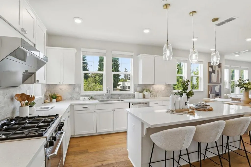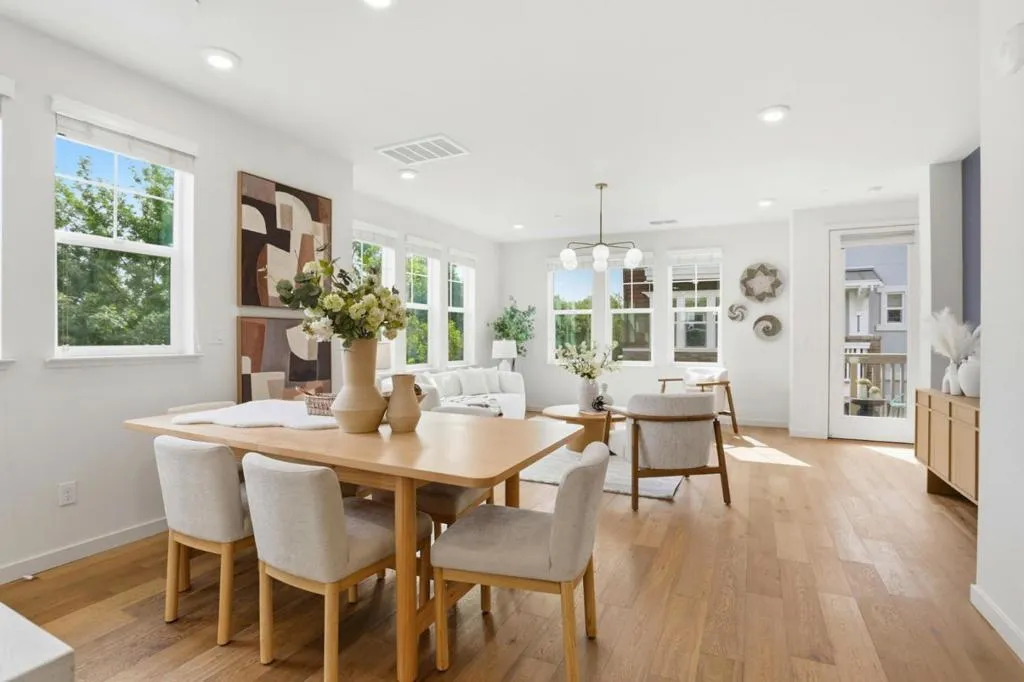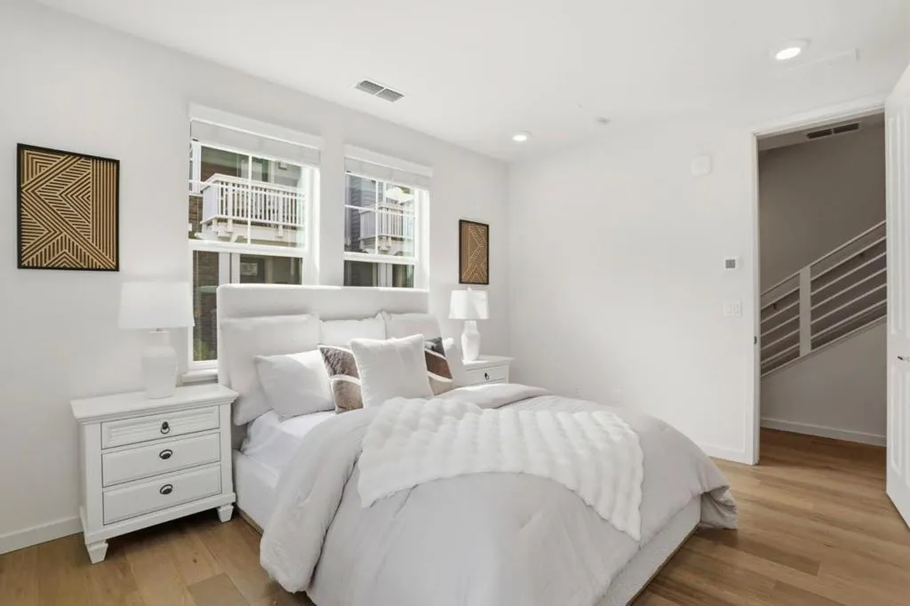 Exceptional 7-year-old end-unit townhome stands out with its exquisitely upgraded, designer-inspired interior and is tucked away in the most quiet and private location within Sunnyvale's premier community, The Vale. The home is elevated by premium wood floors and a gourmet kitchen and bathrooms featuring elegant white cabinetry paired with beautiful quartz countertops and upgraded backsplashes, all bathed in abundant natural light from windows on three sides. The flexible layout includes a private ground-floor suite, a dedicated laundry room, and a magnificent primary retreat with soaring 13-foot ceilings, while modern conveniences include an EV-ready garage and a Nest smart-home system. Perfectly positioned for both education and lifestyle, you are within easy walking distance to the prestigious private school, The Kings Academy, as well as grocery stores, restaurants, and three city parks. With a low HOA that covers water and garbage and provides access to resort-style amenitiesincluding a clubhouse, parks, and a vegetable gardenyou are also just minutes from Lawrence Expy, Hwy 101, and major tech campuses such as Google, Nvidia, Apple, and LinkedIn.