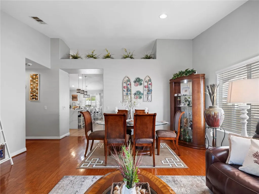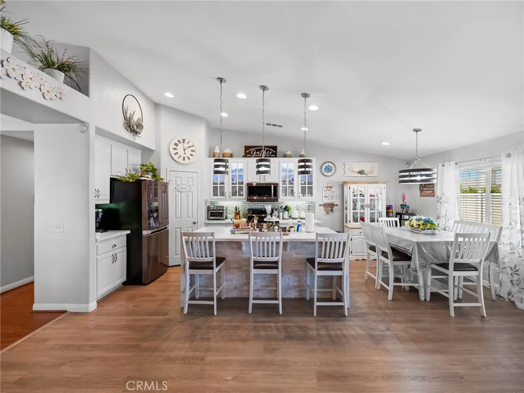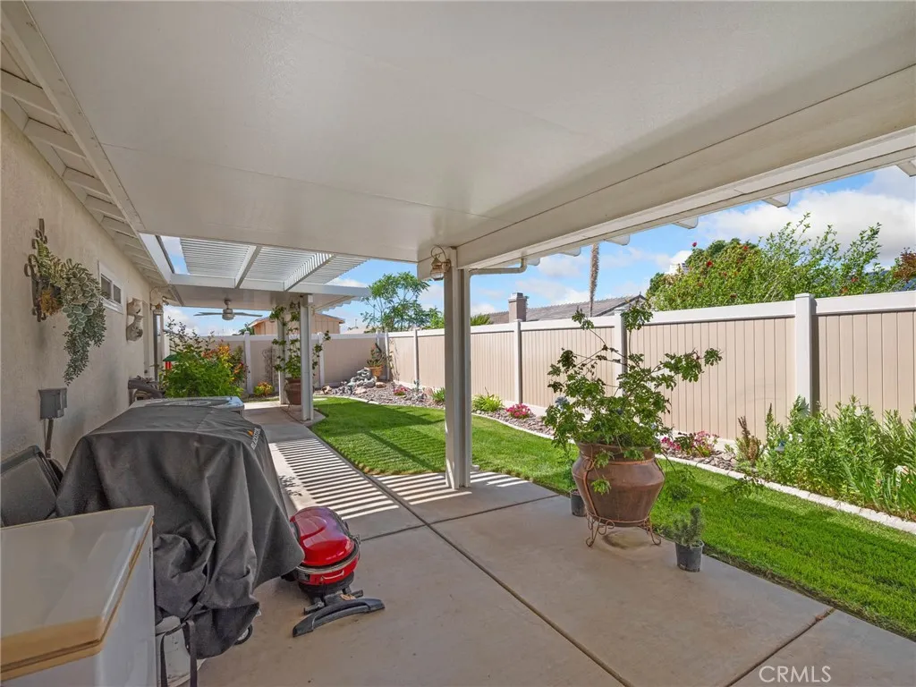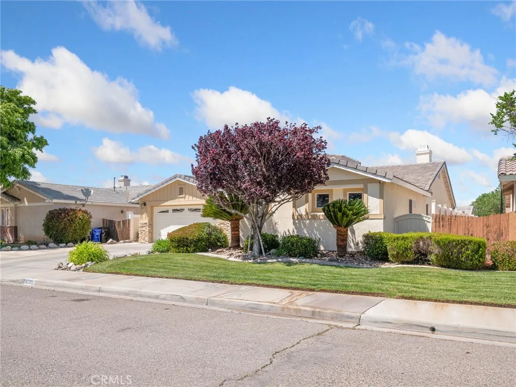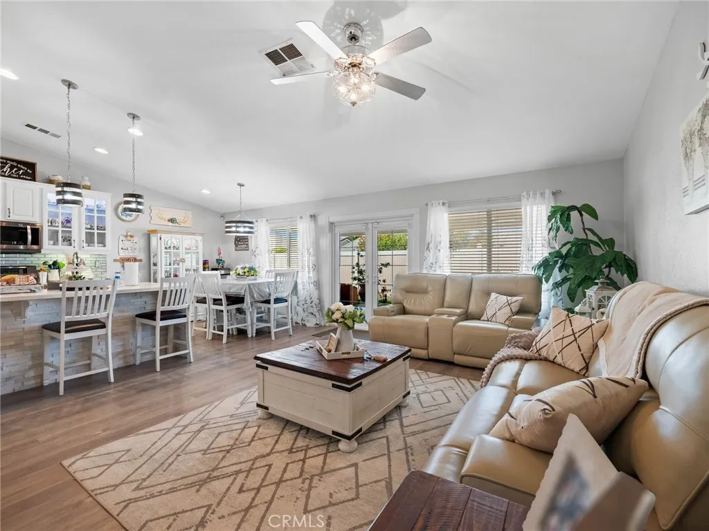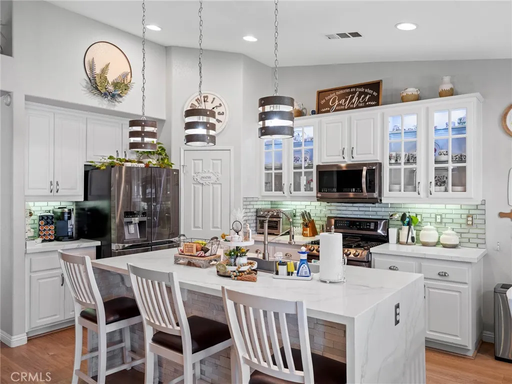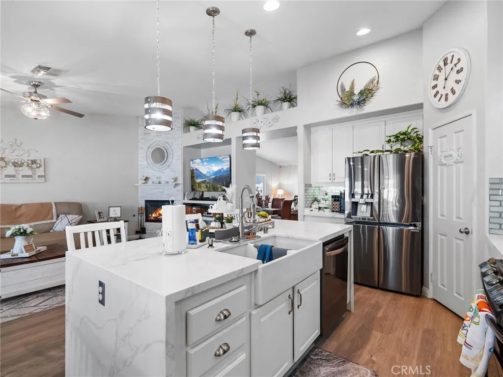 Charming and spacious 4-bedroom, 2-bath home offering 2,119 sq ft of beautifully maintained living space in the heart of Victorville! Built in 2004, this move-in ready property features a fully updated kitchen with white glass-front cabinetry, quartz countertops, and a large waterfall island, along with stainless steel appliances including the refrigerator. The open layout is enhanced by vaulted ceilings, hardwood and laminate wood flooring throughout, and modern light fixtures and ceiling fans. Enjoy cozy evenings by the upgraded floor-to-ceiling fireplace, a new water heater. The home has been meticulously cared for, with recent inspections completed on the roof, air ducts, A/C, and heater. Step outside to a fully landscaped front and backyard featuring vinyl fencing, an irrigation system with timers for each plant, new landscape lighting, and flood lights in both the front and backyard. The fully covered aluminum patio and built-in barbecue make this home perfect for entertaining, while the security gated front courtyard adds charm and privacy. This is a must-see home combining comfort, style, and thoughtful upgrades—come tour this property today!