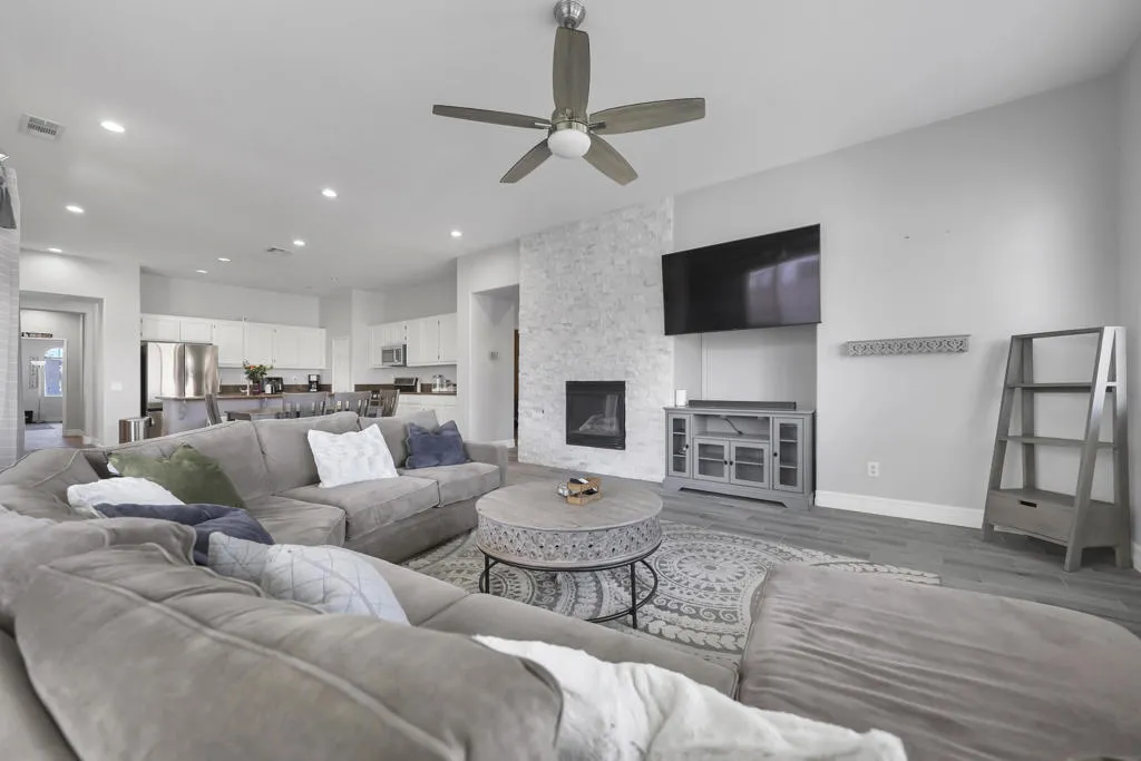 Welcome to this beautifully updated home in the desirable Sonora Wells community, currently one of the lowest priced homes in the neighborhood! Featuring tile flooring throughout and fresh interior and exterior paint, this home offers a clean, modern feel from the moment you walk in.Enjoy an open concept layout with a spacious kitchen flowing seamlessly into the living room, perfect for entertaining. The inviting living area is highlighted by a cozy fireplace, creating the perfect space to relax and unwind. The kitchen boasts a large island ideal for gathering, meal prep, and casual dining.This home offers 4 bedrooms and 3 bathrooms, along with a versatile office/den space that can easily adapt to your needs. The primary suite features an upgraded bathroom, beautiful walking shower, with dual sinks and a generously sized walk-in closet. A dedicated laundry room adds convenience to everyday living.Step outside to a private back patio, perfect for relaxing or hosting guests.Located in a low HOA community, Sonora Wells offers fantastic amenities including a pool, spa, BBQ areas, playground, and dog parks providing something for everyone to enjoy. Only a couple mins from I-10