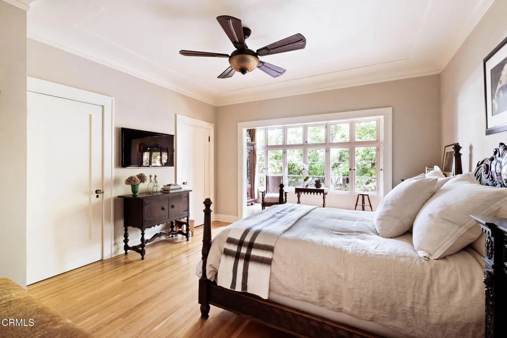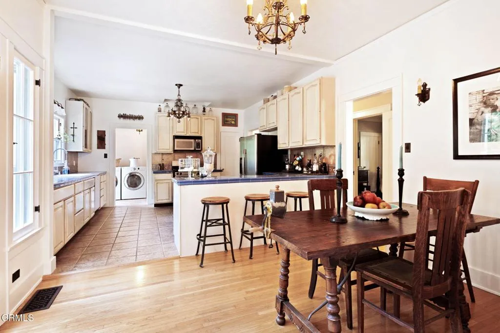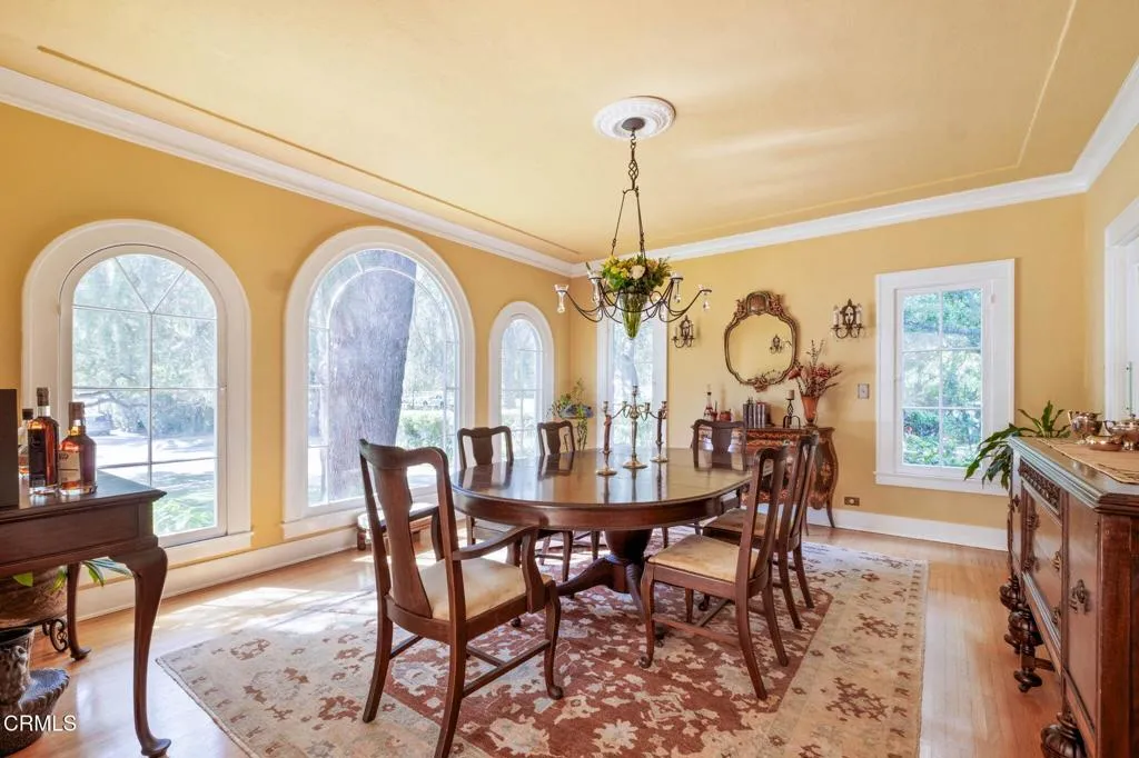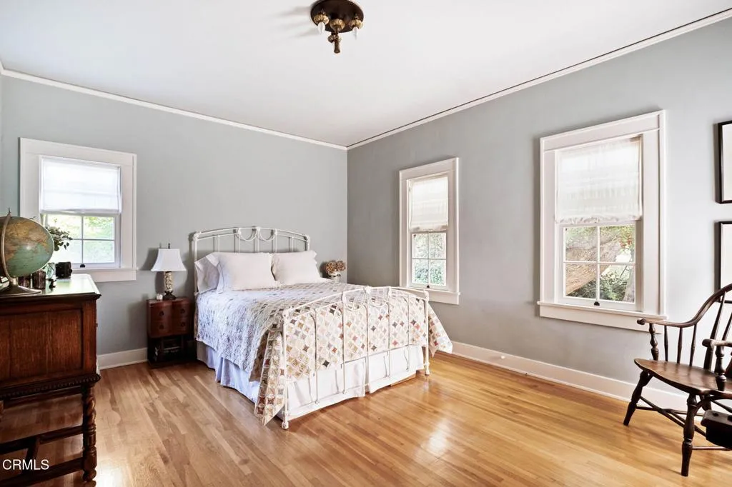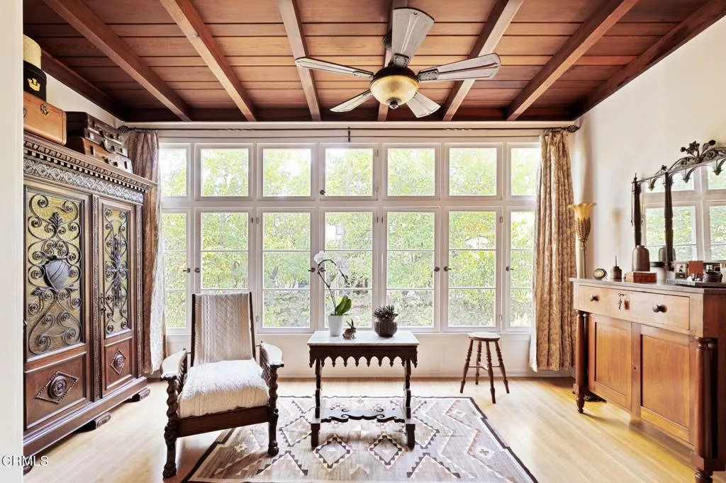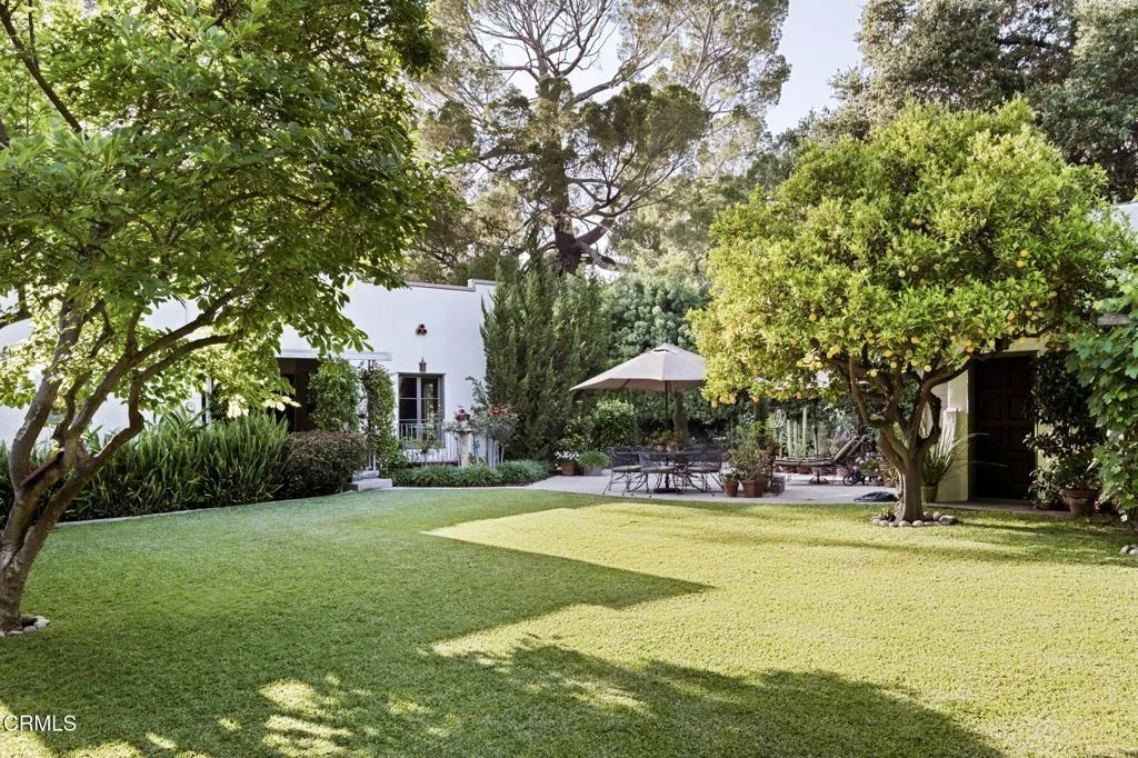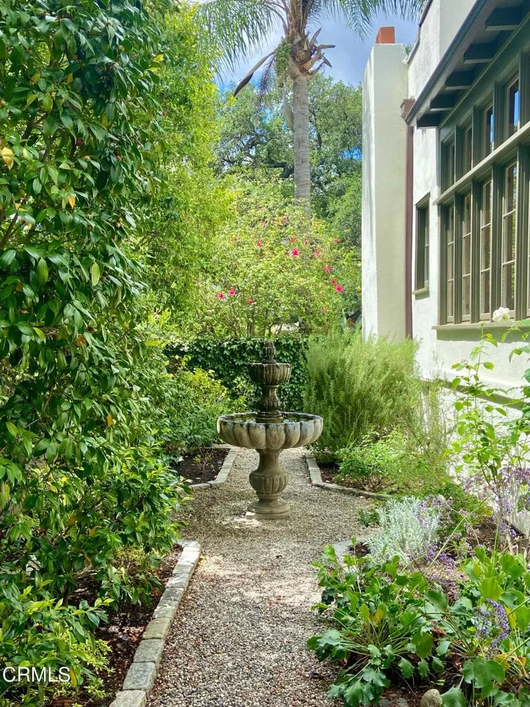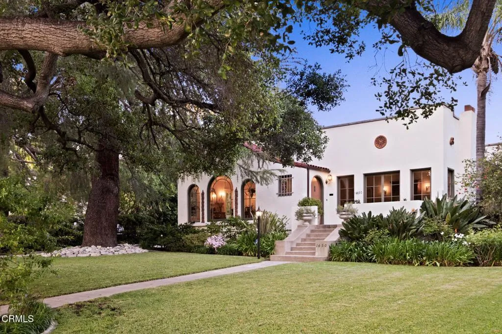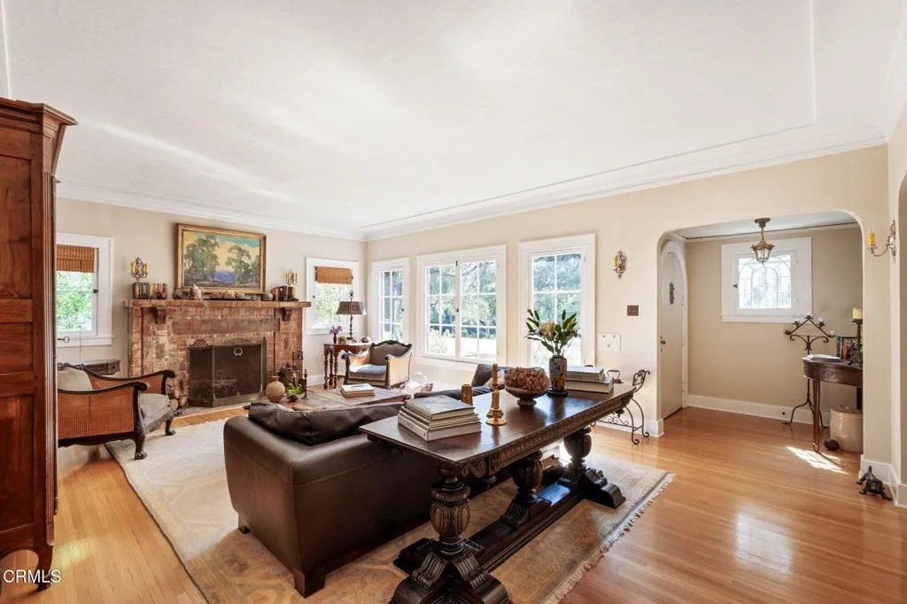Built in 1924, this single-story Spanish Colonial home is situated next to the historic 1885 Dane House and fronts the Landmark District's most coveted street in the Historic Highlands, a neighborhood defined by majestic oak-lined avenues and architecturally significant properties. This beautiful home reflects the enduring craftsmanship of the era with an arched entry, graceful Palladian windows, high ceilings, and hardwood floors throughout. Original vintage lighting, doors, and hardware have all been thoughtfully restored and preserved. At the heart of the home, a Batchelder tile fireplace of exceptional provenance features a rare triptych depicting the story of westward migration to California, an extraordinary piece of California design history. The thoughtful floor plan offers four spacious bedrooms, one currently used as a home office, and two bathrooms along with a dedicated laundry room. The living spaces are filled with natural light and the kitchen is both generous and bright, with French doors that open to a charming side patio. The primary bedroom features a wall of windows that open to a tranquil side garden, where a Spanish fountain creates a peaceful, intimate retreat. The expansive gardens are a living piece of California agricultural heritage, home to 100 year old orange and grapefruit trees, living remnants of the original Dane Family Ranch. The property offers ample space for a pool or ADU. The home has been thoughtfully updated with a new tankless water heater, an updated electrical panel, and a 220V EV charging outlet -- ready for the next century as confidently as it honors the last.