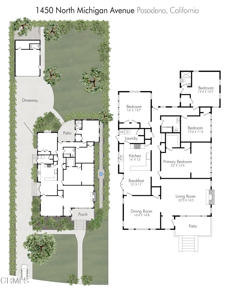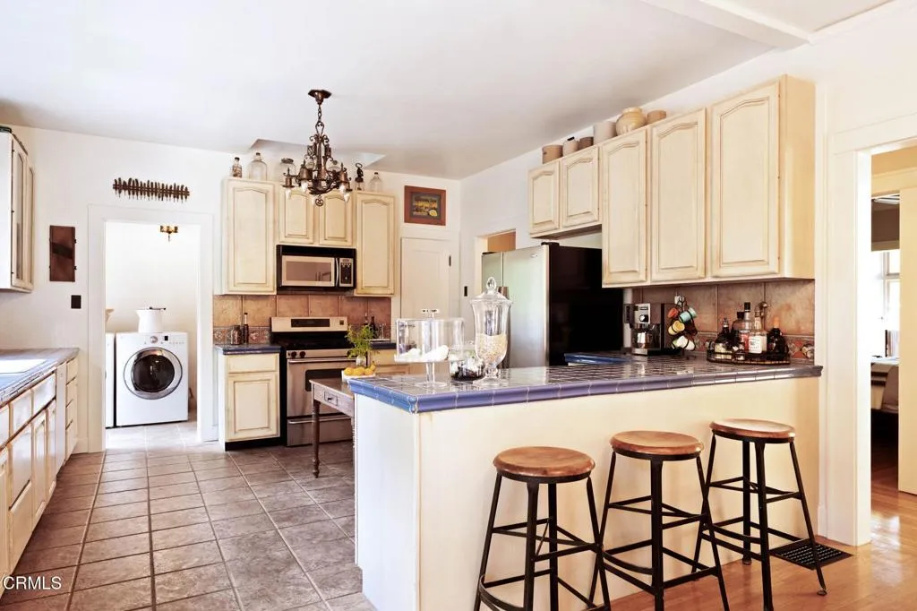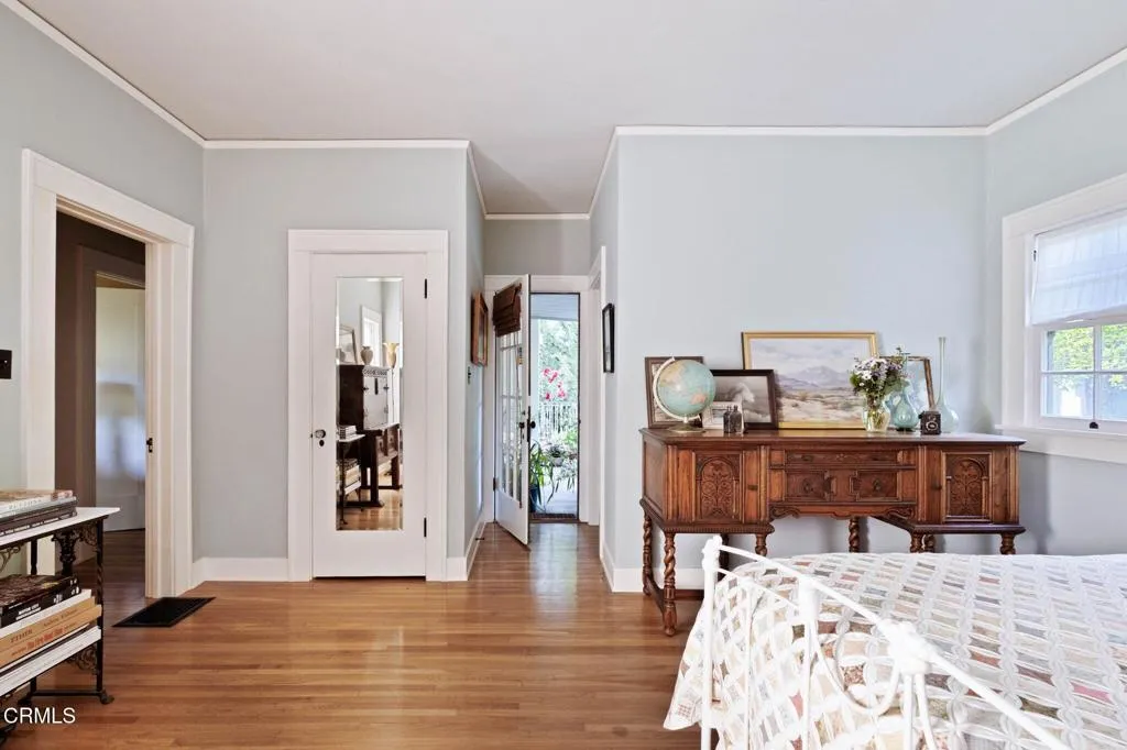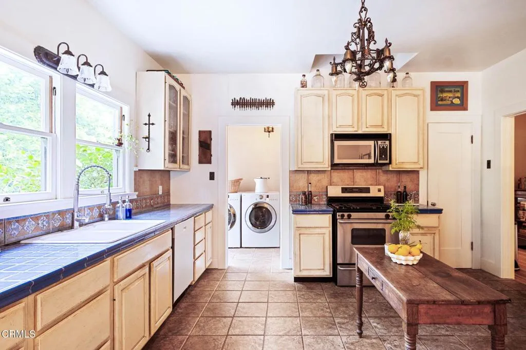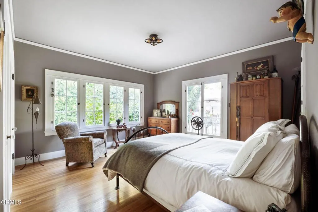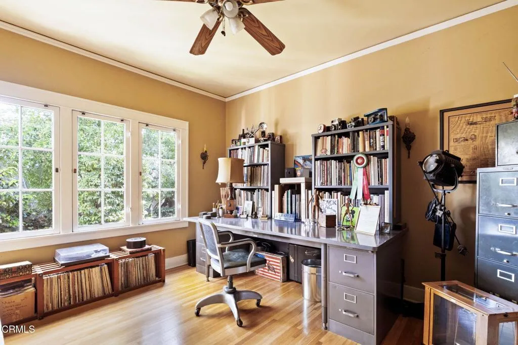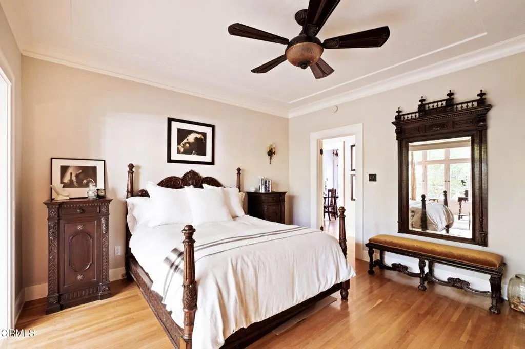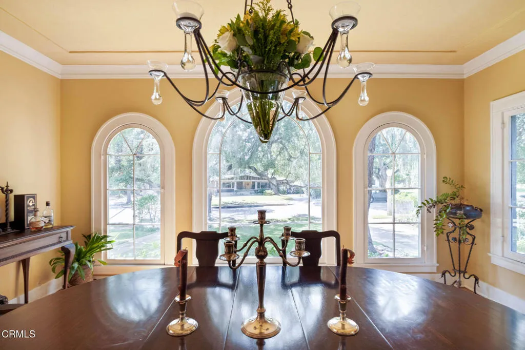 Built in 1924, this single-story Spanish Colonial home is situated next to the historic 1885 Dane House and fronts the Landmark District's most coveted street in the Historic Highlands, a neighborhood defined by majestic oak-lined avenues and architecturally significant properties. This beautiful home reflects the enduring craftsmanship of the era with an arched entry, graceful Palladian windows, high ceilings, and hardwood floors throughout. Original vintage lighting, doors, and hardware have all been thoughtfully restored and preserved. At the heart of the home, a Batchelder tile fireplace of exceptional provenance features a rare triptych depicting the story of westward migration to California, an extraordinary piece of California design history. The thoughtful floor plan offers four spacious bedrooms, one currently used as a home office, and two bathrooms along with a dedicated laundry room. The living spaces are filled with natural light and the kitchen is both generous and bright, with French doors that open to a charming side patio. The primary bedroom features a wall of windows that open to a tranquil side garden, where a Spanish fountain creates a peaceful, intimate retreat. The expansive gardens are a living piece of California agricultural heritage, home to 100 year old orange and grapefruit trees, living remnants of the original Dane Family Ranch. The property offers ample space for a pool or ADU. The home has been thoughtfully updated with a new tankless water heater, an updated electrical panel, and a 220V EV charging outlet -- ready for the next century as confidently as it honors the last.
