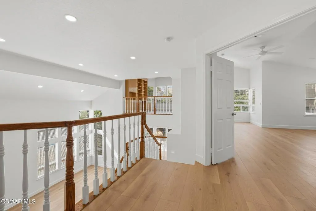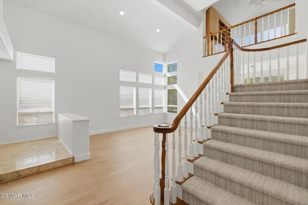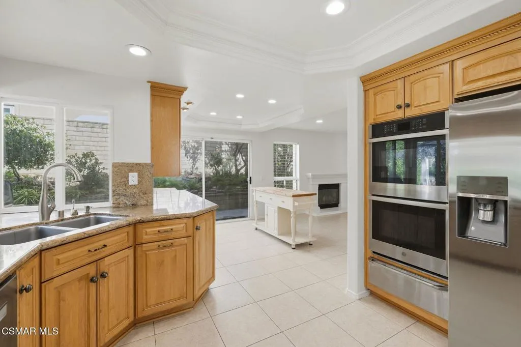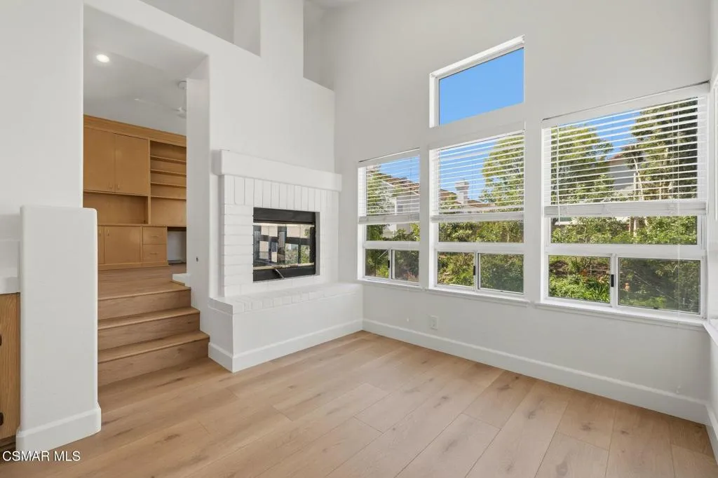 Located in the highly sought-after High Meadows community of Wood Ranch, this exceptional and rarely offered lease opportunity is available for immediate occupancy. Ideally positioned on a quiet cul-de-sac street, this expansive residence offers generous living spaces, beautiful natural light, and tasteful modern updates throughout.The entry welcomes you with soaring ceilings, a sweeping staircase, and an impressive sense of openness. Freshly painted interiors in a designer palette are complemented by newly installed LED recessed lighting, ceiling fans, and faux wood blinds throughout. New luxury European oak-style vinyl plank flooring extends through the main living areas, as well as the upstairs hall and bedrooms, creating a natural warmth and elevating the space.The well-designed floor plan offers both functionality and flexibility, featuring a desirable downstairs bedroom and full bathroom, ideal for guests, extended living, or a private office. Light-filled living areas seamlessly connect and include a fireplace located in the family room just off the kitchen, adding warmth and comfort while creating an inviting environment for everyday living and entertaining. The kitchen features granite countertops and a suite of stainless steel appliances, including a Viking 6-burner cooktop, dual ovens, and a Bosch dishwasher, offering both functionality and elevated design. A separate large laundry room adds everyday convenience.Upstairs, the expansive primary suite serves as a true retreat, complete with vaulted ceilings, recessed lighting, a newly installed ceiling fan, wet bar, and a centrally positioned see-through fireplace that connects the primary bedroom and the adjoining bonus room. The suite includes an oversized den that flows into a separate adjoining space, with the bonus room offering ideal flexibility for a private office, gym, media room, or additional lounge area. The primary bathroom features a generously sized soaking tub, step-in shower, dual sinks with maple cabinetry, a large walk-in closet, and a private water closet.Three additional upstairs bedrooms are spacious and well-appointed, each featuring updated flooring, new paint, recessed lighting, and ceiling fans. The secondary full bathroom is thoughtfully designed, offering a private tub and shower area along with a separate vanity and sink space for added functionality.Step outside to an expansive landscaped backyard offering a private outdoor retreat, complete with mature fruit trees, generous lawn space, and an attached covered wood pergola over a concrete patio, ideal for entertaining, gardening, or simply enjoying the California sunshine. The property also enjoys beautiful mountain views, enhancing the peaceful setting.Additional highlights include a three-car garage with automatic door openers, ample storage and parking, along with HOA and gardener services included, providing added convenience and value.Set within the scenic Wood Ranch community, residents enjoy access to nearby greenbelts, hiking trails, parks, and close proximity to Wood Ranch Golf Club, along with shopping and dining. Convenient access to the 23 and 118 freeways enhances everyday living. Located near highly desirable Wood Ranch Elementary, Sinaloa Middle School, and Royal High School.Offering space, style, and an exceptional setting, this is a rare opportunity to lease a beautifully updated home in one of the area's most desirable communities.