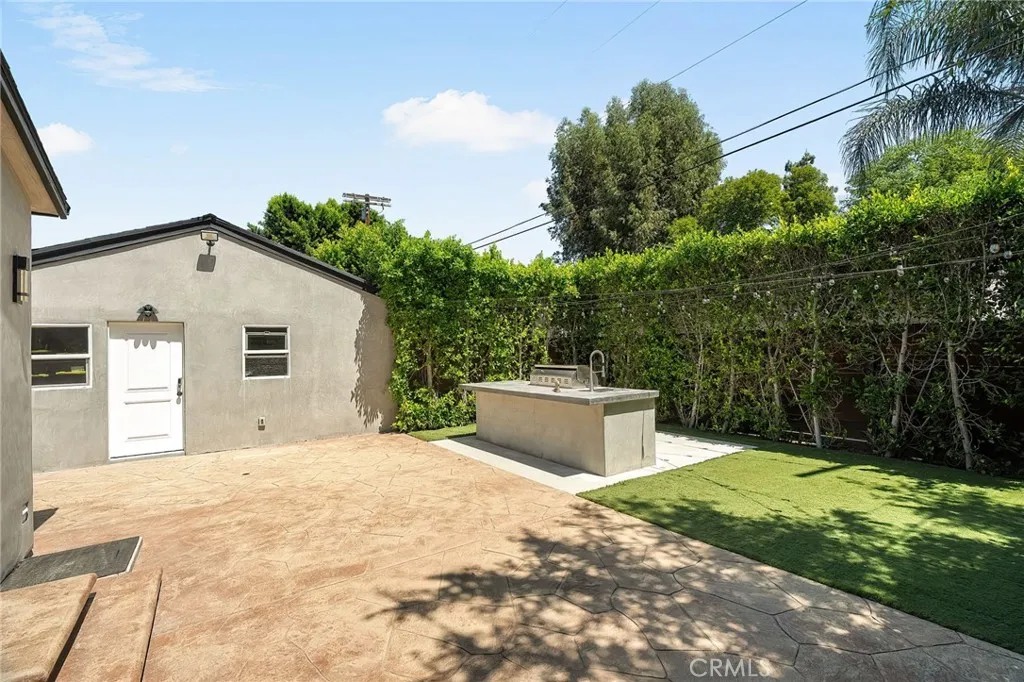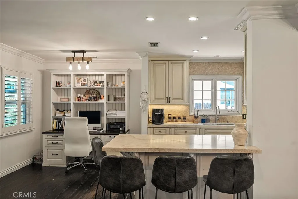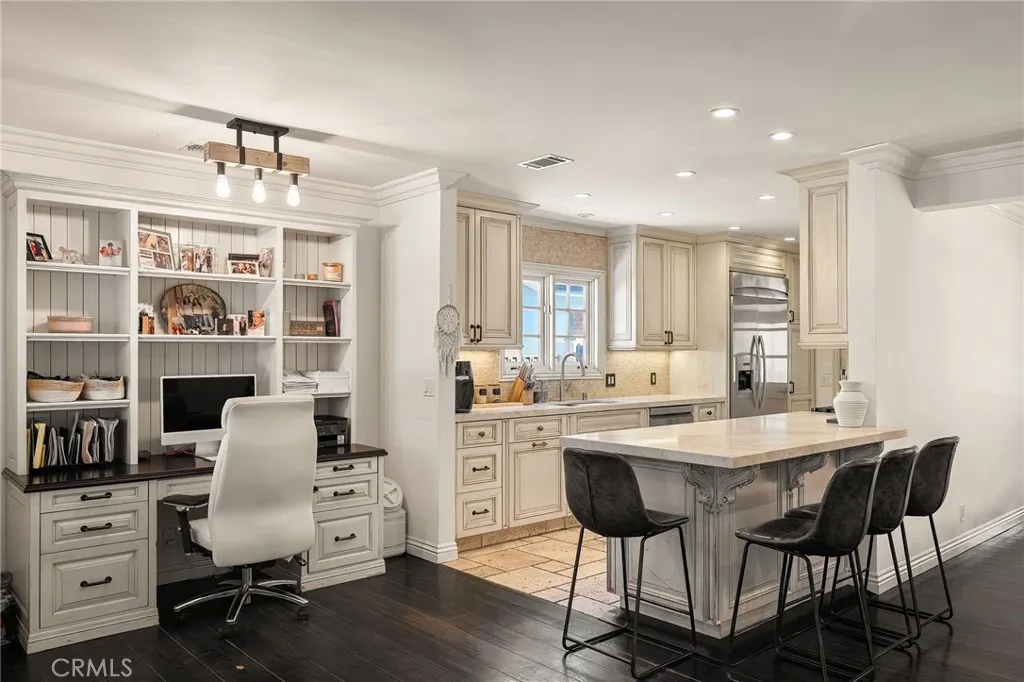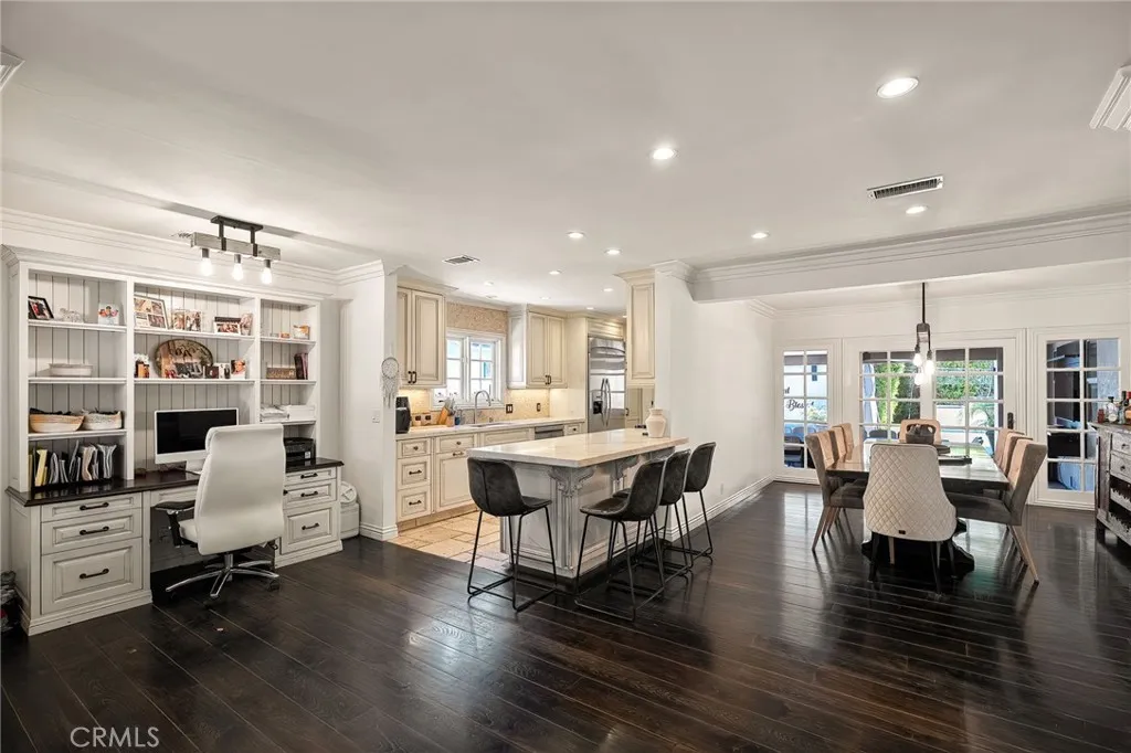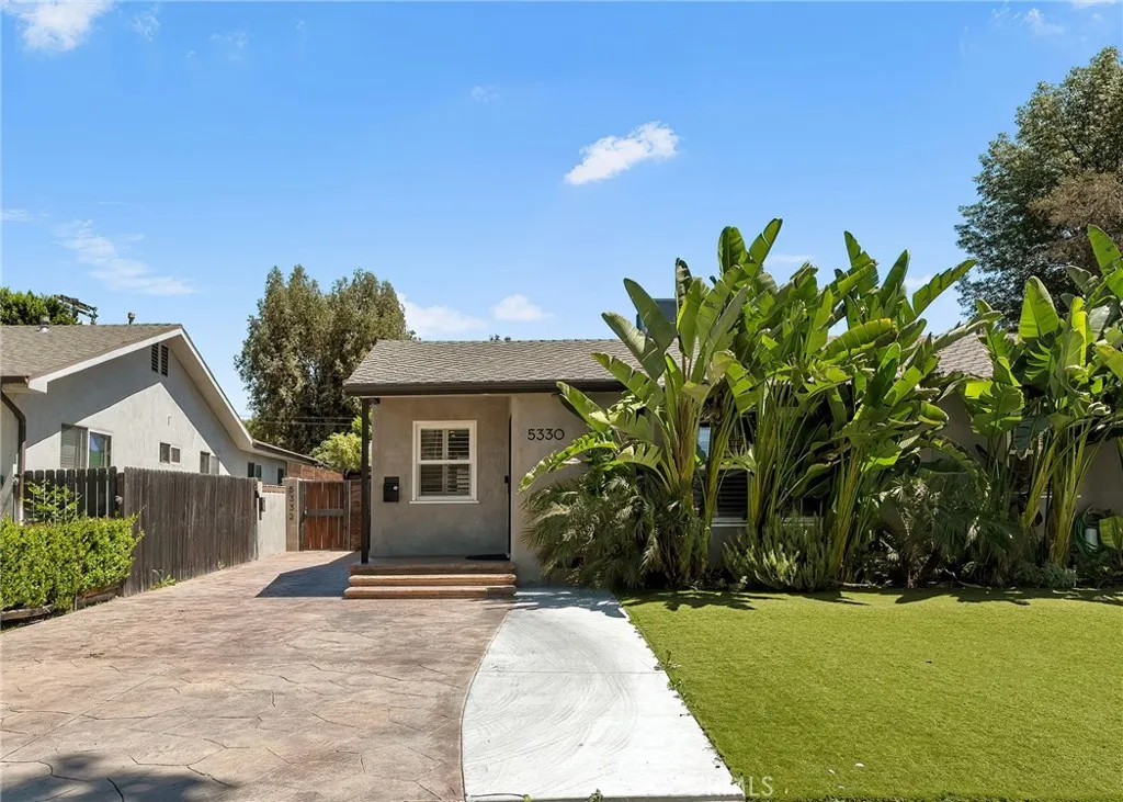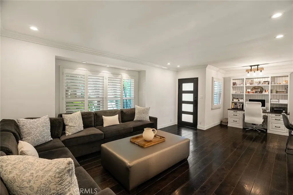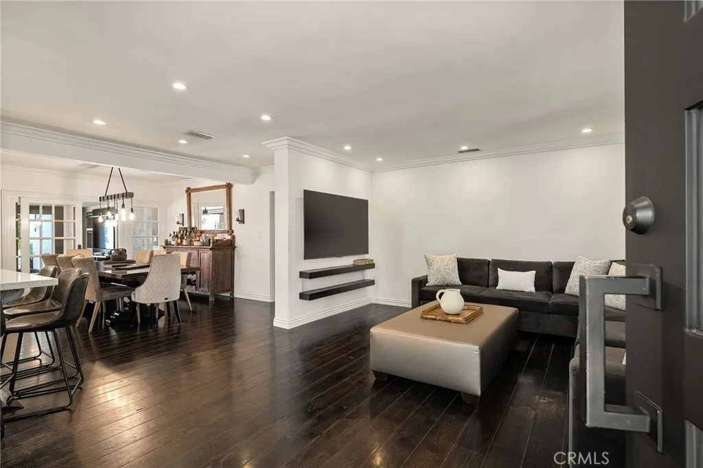 Welcome to this beautifully upgraded and move in ready home in the heart of Sherman Oaks, offering a perfect combination of style, comfort, and functionality. Step inside to a bright open layout with rich hardwood floors, recessed lighting, and a seamless flow between the living, dining, and kitchen areas. The spacious living room is both inviting and elegant, featuring custom finishes and abundant natural light. The kitchen is designed for both everyday living and entertaining, with custom cabinetry, high end appliances, generous counter space, and a large center island with seating. A built in office area adds incredible functionality, perfect for working from home while staying connected to the main living space. The bedrooms are well proportioned and thoughtfully designed. The primary suite offers a comfortable retreat with ample closet space and a beautifully finished bathroom. The home also features French doors that open to the backyard, creating a true indoor outdoor lifestyle ideal for relaxing or hosting. The exterior showcases a clean modern look with a private driveway, gated access, and lush landscaping that adds both privacy and curb appeal. Move in ready and ideally located near shopping, dining, and everything Sherman Oaks has to offer, this home truly checks every box.