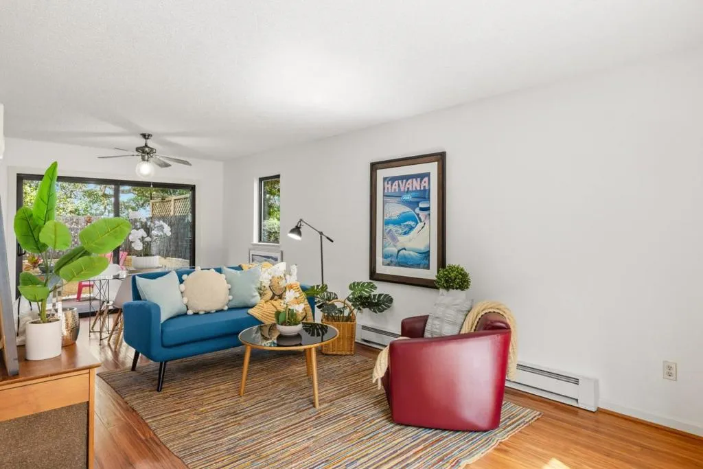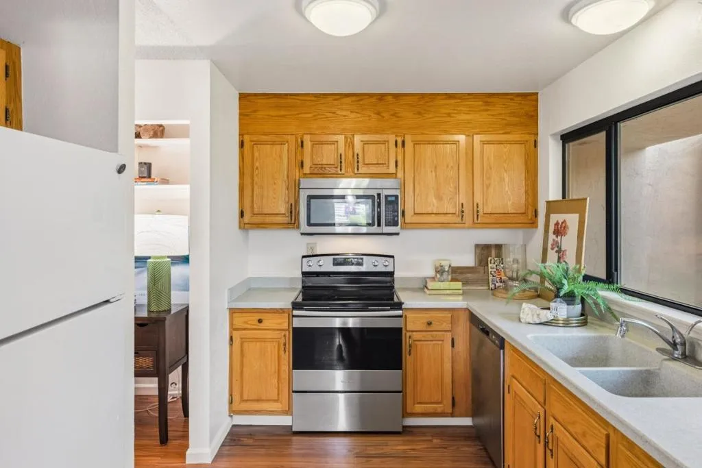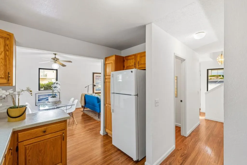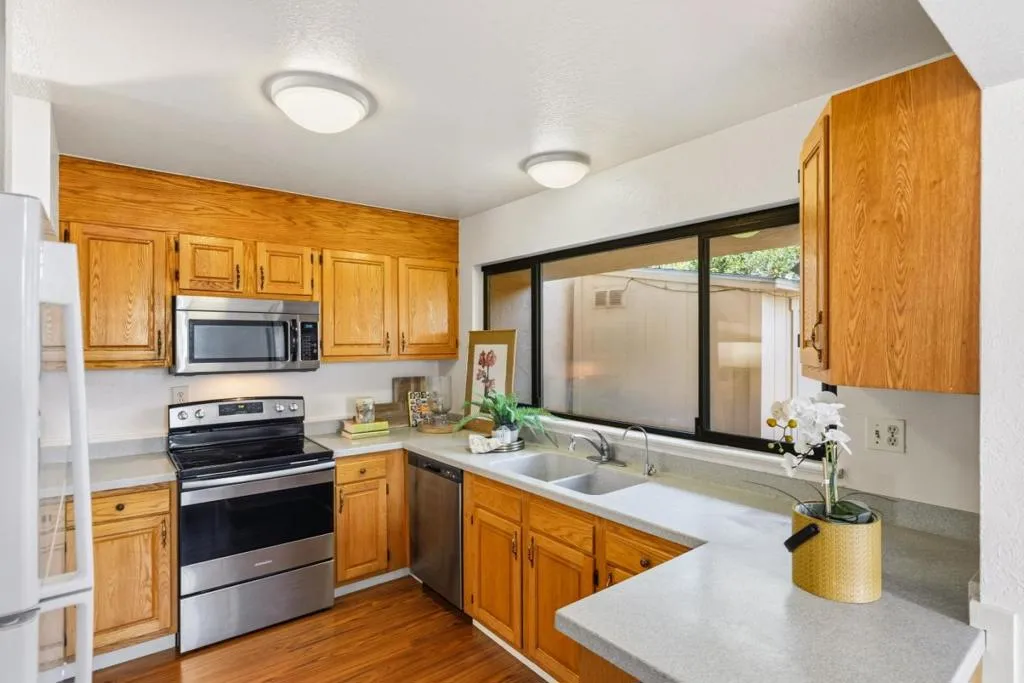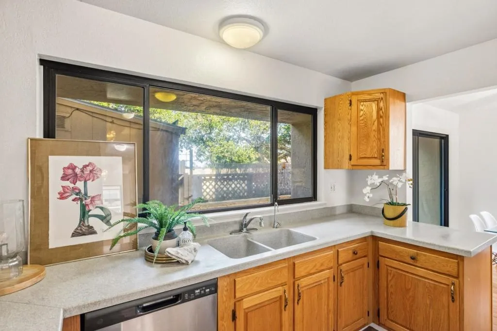 Ocean views from the kitchen and bedroom set the tone for this inviting Seaside location. The comfortable main floor features a combined living and dining area with wood-style flooring, a spacious kitchen with all-electric appliances, plus a convenient half bath and in-unit laundry. Sliders open to a patio with private yard space and storage shed. Easy parking located in front of the unit. Ideally situated near schools, shopping, and everyday amenities in a sunbelt location.